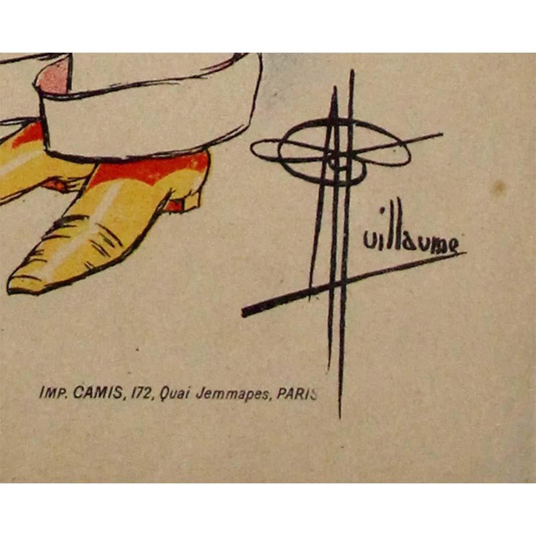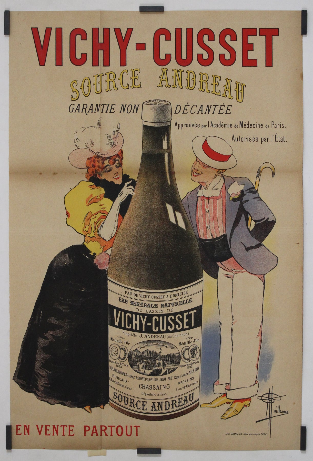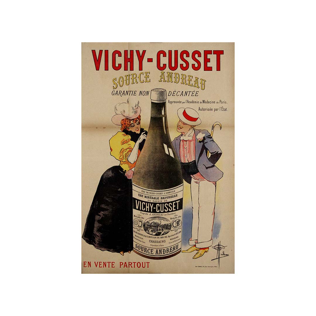Une ravissante et pétillante affiche publicitaire Belle Époque pour la Source Andréau de Vichy-Cusset, l'une des nombreuses eaux minérales réputées de la France du XIXe siècle. Illustrée par le célèbre caricaturiste Albert Guillaume, cette lithographie originale déborde de charme, d'élégance et de théâtralité.