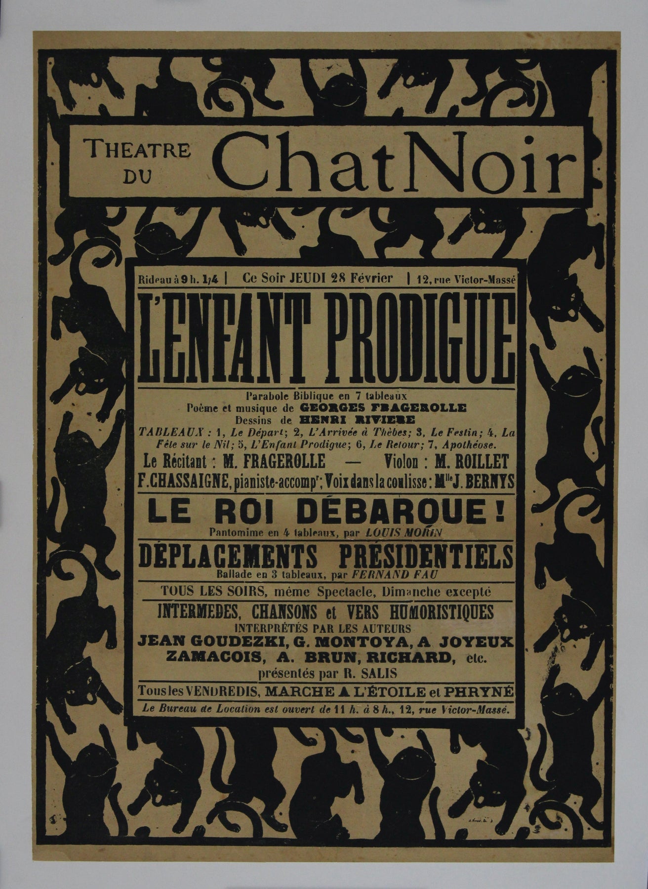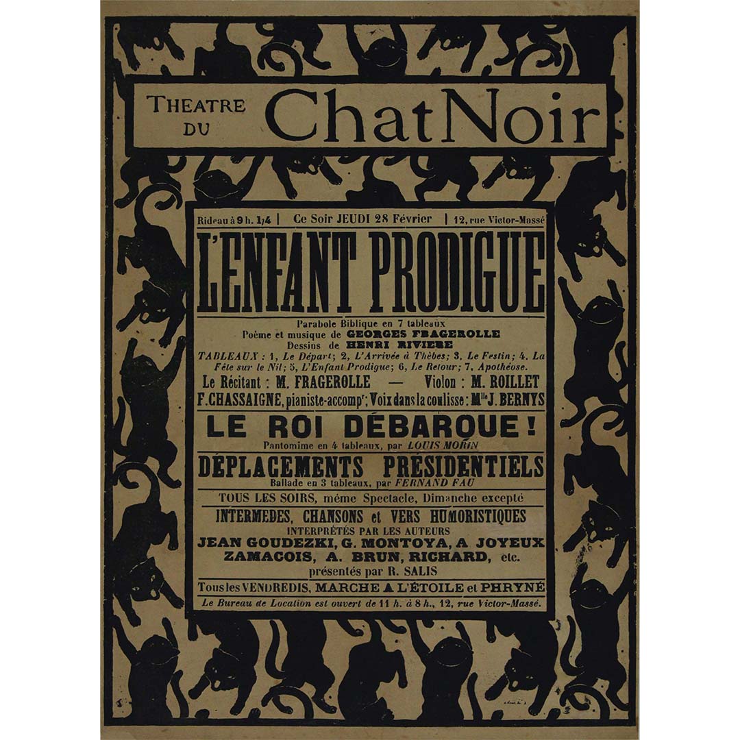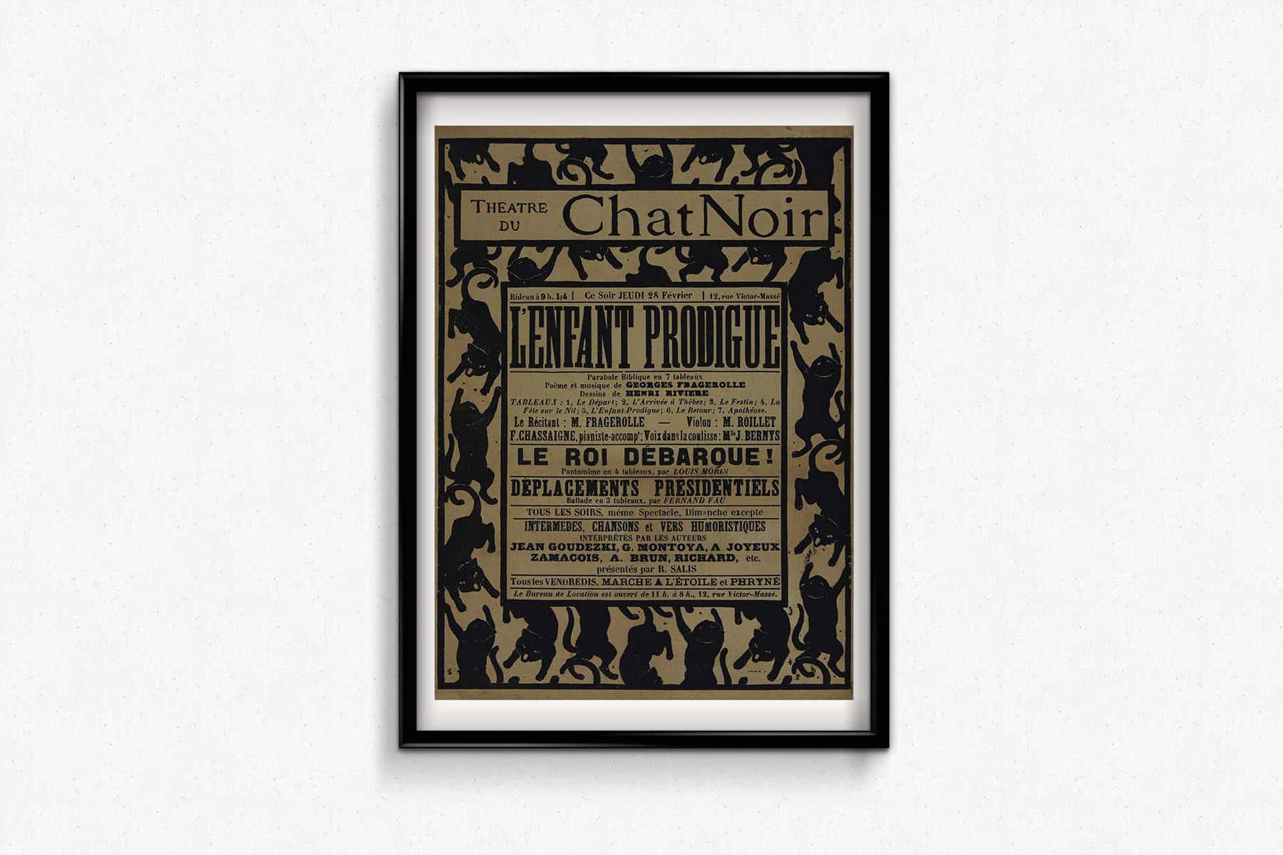 L'affiche du « Théâtre du Chat Noir : L'Enfant Prodigue », datant d'environ 1895, rend hommage à l'univers du cabaret parisien et aux personnages excentriques qui l'ont fait vivre. Elle capture l'essence d'une époque où le cabaret n'était pas seulement un lieu de divertissement, mais aussi un véritable foyer de créativité et d'expression artistique. L'affiche invite les spectateurs à s'immerger dans la magie de la culture du cabaret, où imagination et art se mêlaient harmonieusement.