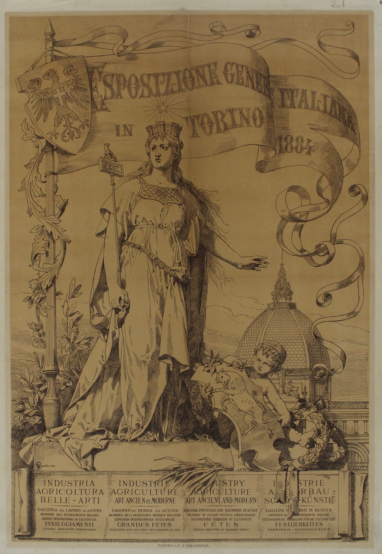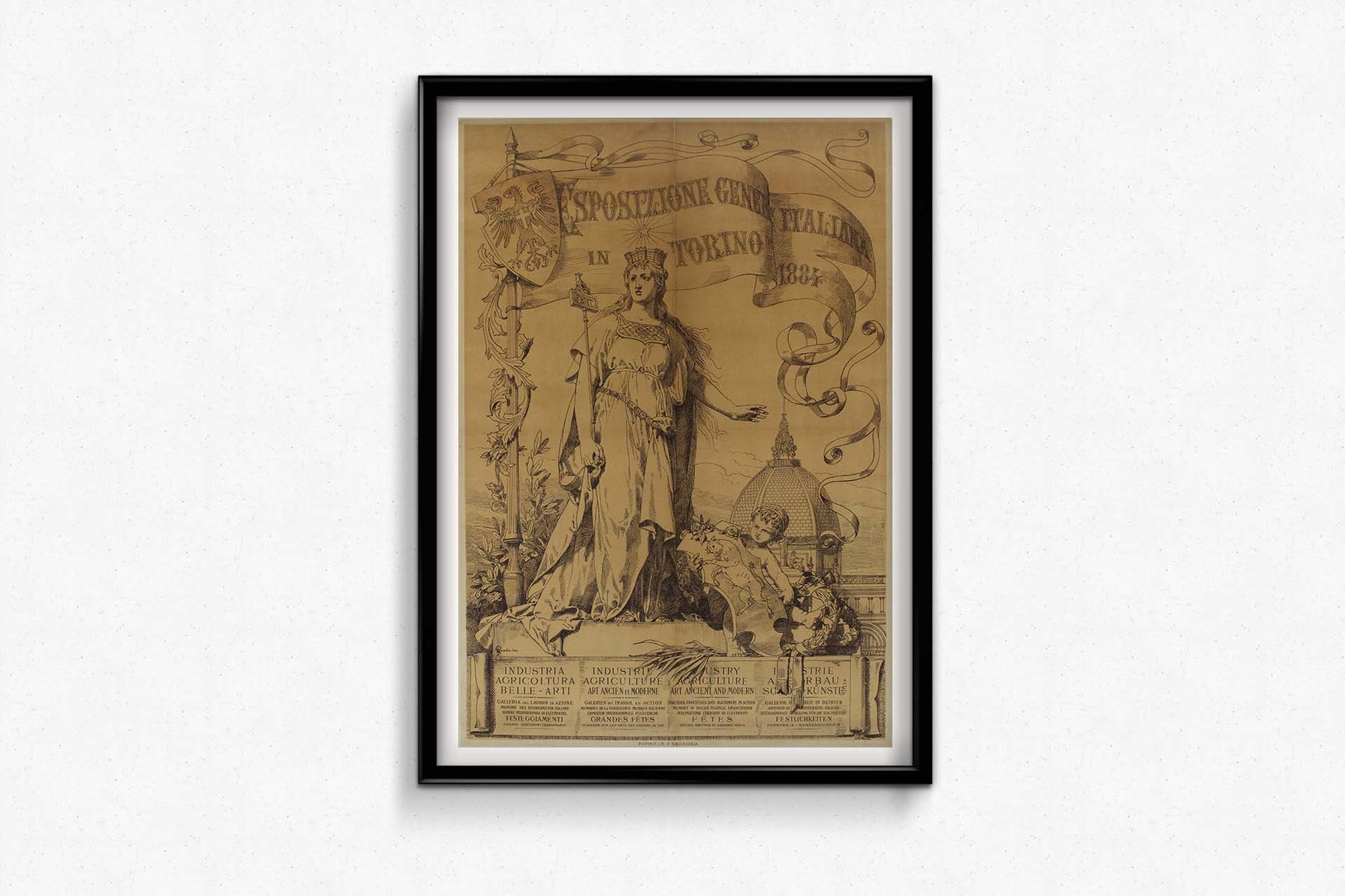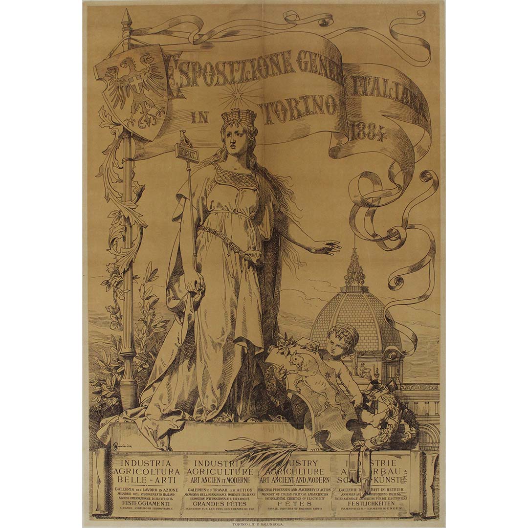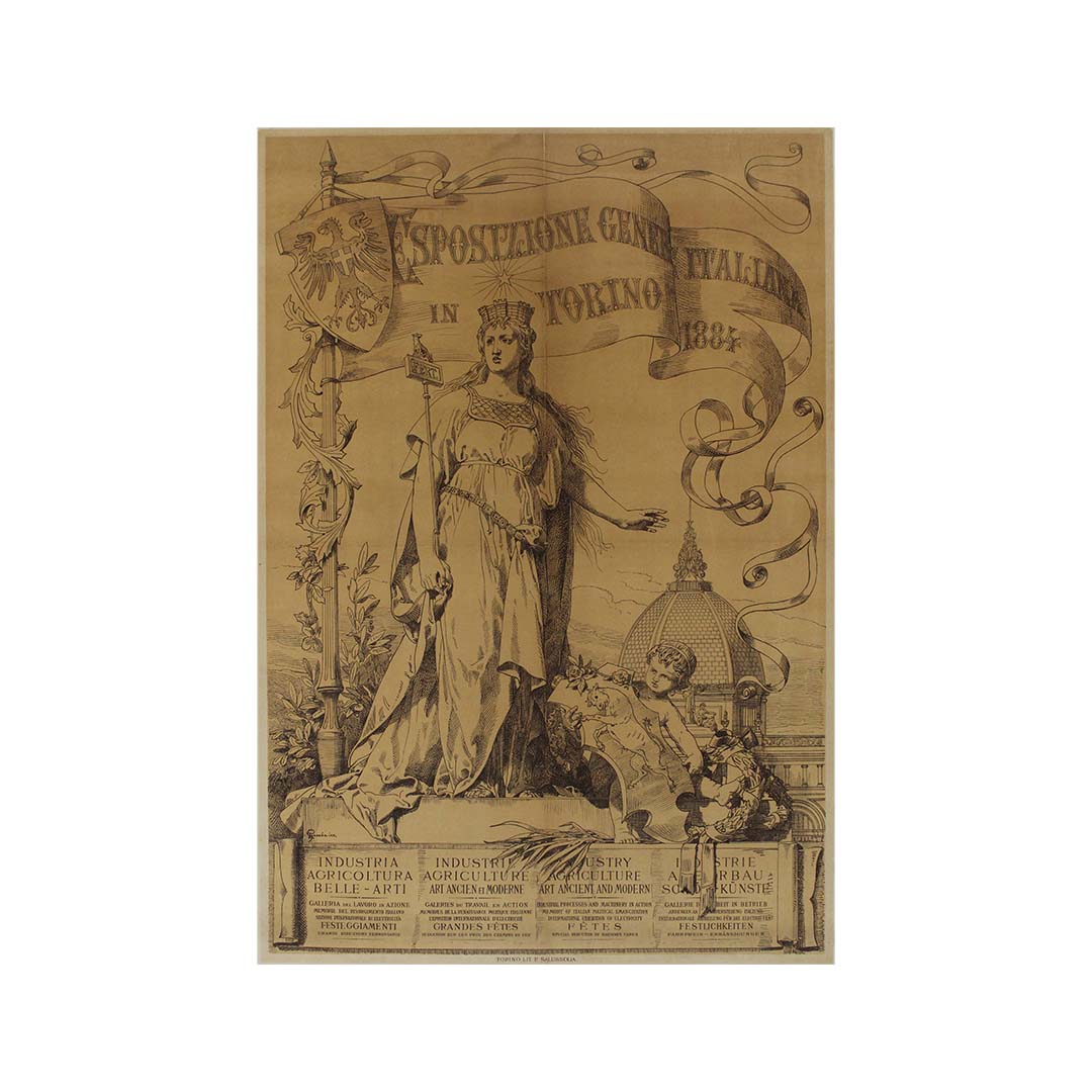Réalisée en 1884 par le talentueux artiste Francesco Gamba, l'affiche originale de l'Esposizione Generale Italiana (Exposition générale italienne) de Turin est une œuvre d'art remarquable qui célèbre les réussites culturelles et industrielles de l'Italie. Comptant parmi les événements les plus importants de son époque, cette exposition visait à mettre en lumière les progrès de l'Italie dans divers domaines, notamment l'industrie, l'agriculture et les arts.