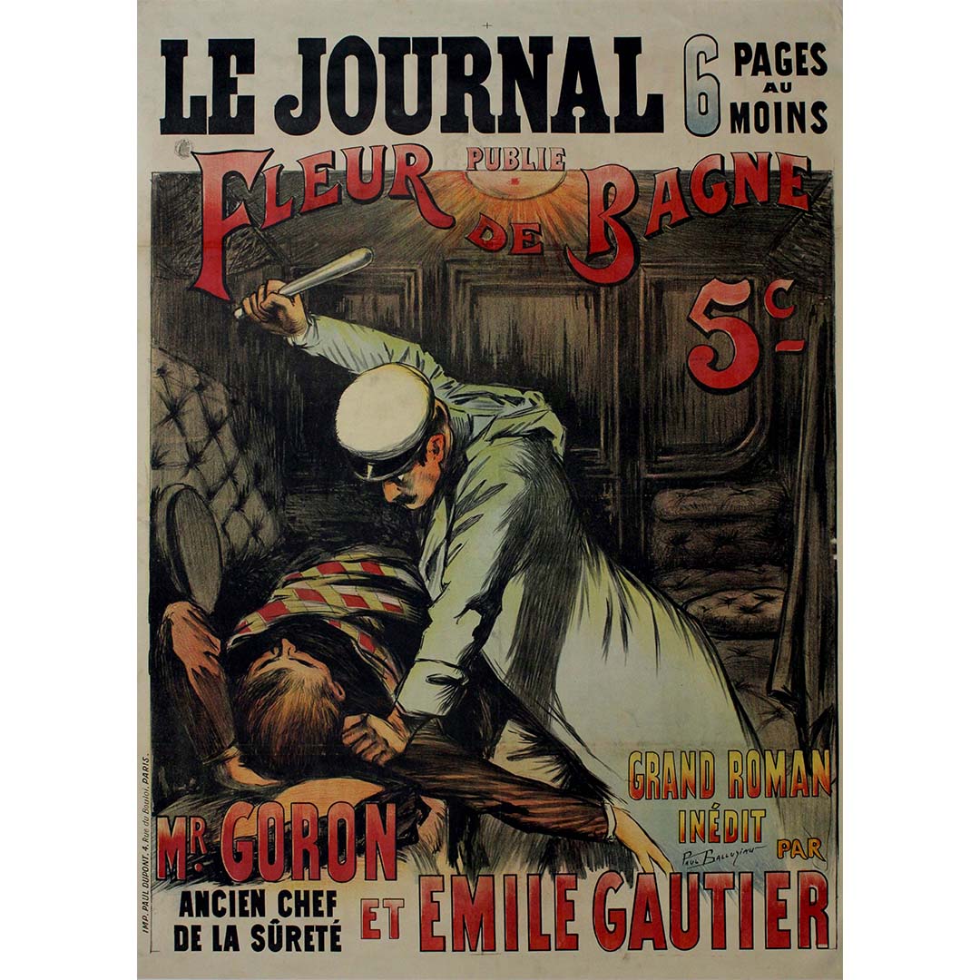 Au cœur de cette affiche réside la fascination pour « Fleur de Bagne », un roman-feuilleton publié semaine après semaine dans les pages du Journal. Écrit par M. Goron et Émile Gautier, ce roman plongeait le lecteur dans le récit dramatique et haletant de la vie dans les bagnes, captivant les lecteurs à chaque épisode. La mission de Balluriau était de condenser cette histoire passionnante en une seule image, visuellement saisissante.