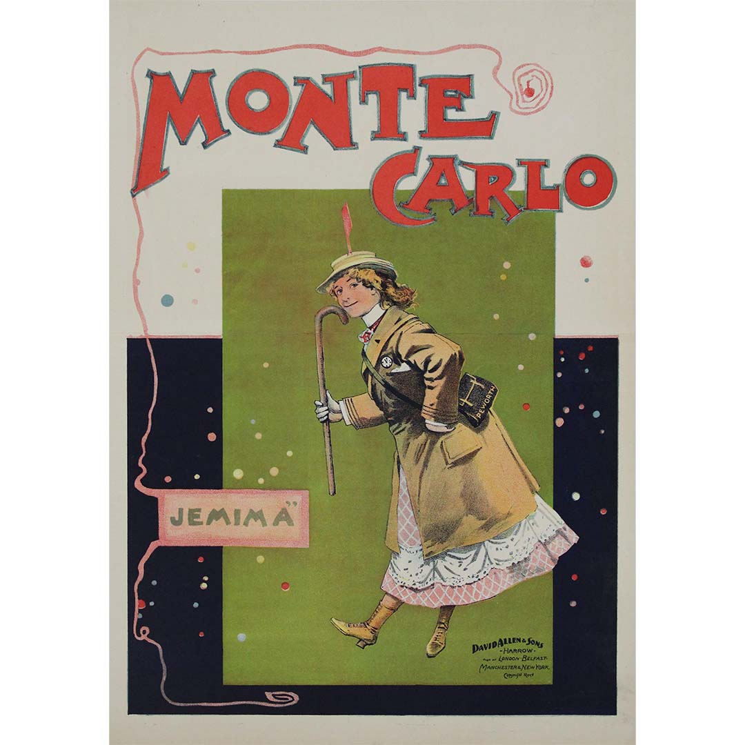 L'affiche de théâtre « Jemima » de Monte Carlo, datant d'environ 1900, est un exemple fascinant de l'art de l'affiche du début du XXe siècle, reflétant les tendances artistiques et culturelles de son époque. Conçue pour promouvoir une production théâtrale, cette affiche témoigne du dynamisme du monde du spectacle et de la communication visuelle durant la Belle Époque, période marquée par l'innovation artistique et le dynamisme social.