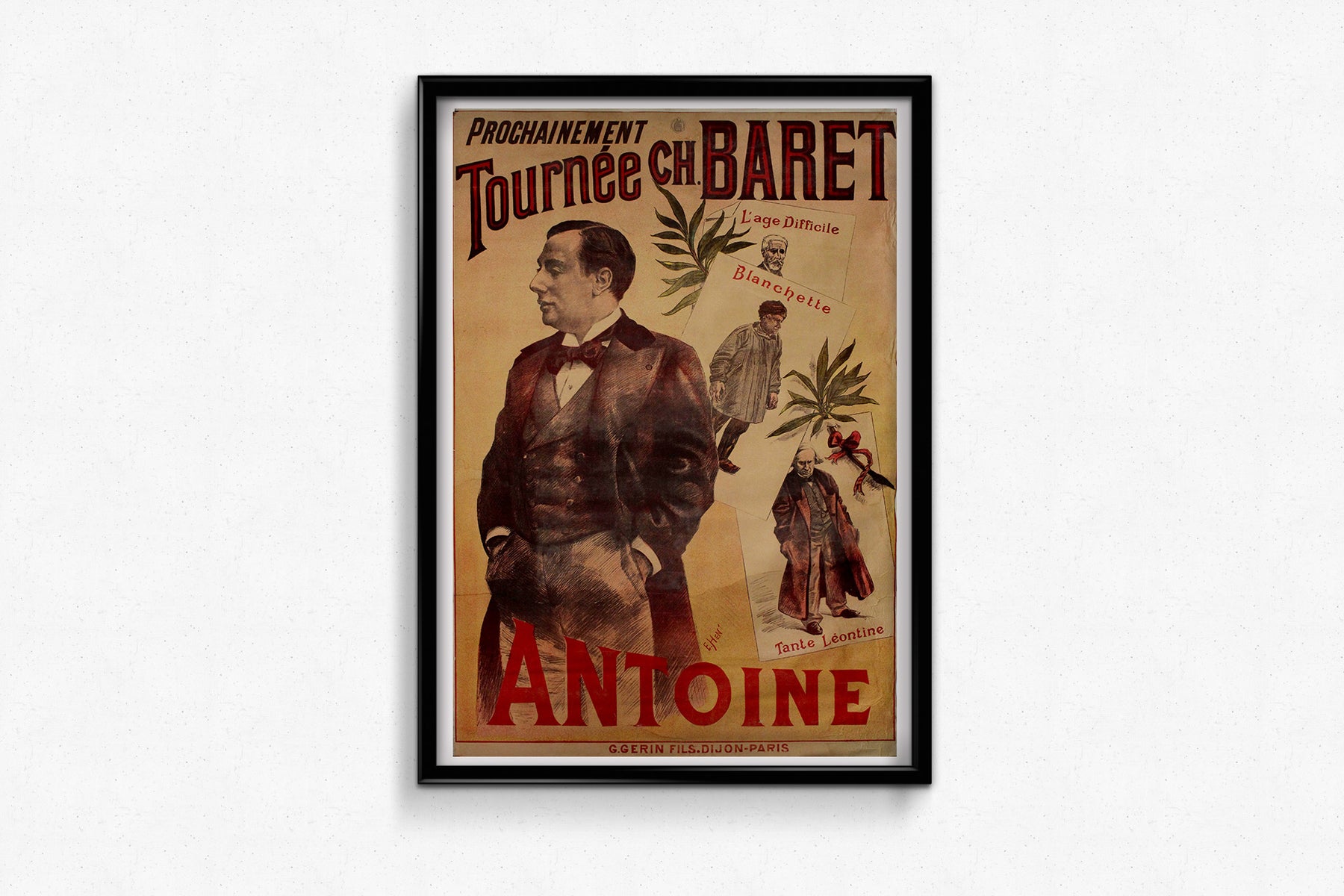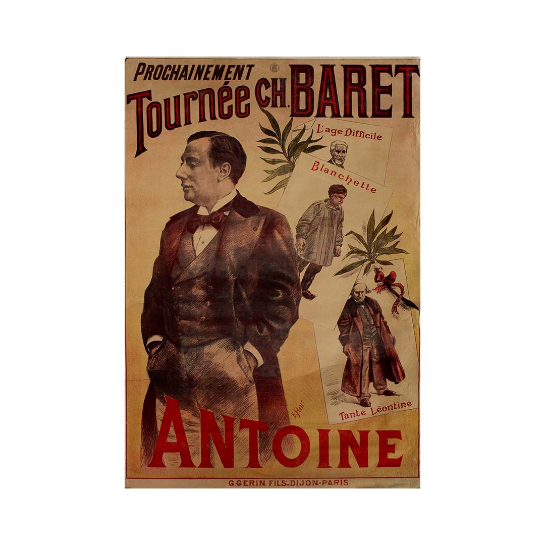 Affiche originale d'environ 1890, signée E. Hen, annonçant la Tournée Charles Baret – Antoine , imprimée par G. Gérin Fils à Dijon et Paris. Cette lithographie fait la promotion des représentations itinérantes du célèbre acteur André Antoine, figure révolutionnaire du théâtre français, connu pour avoir fondé le Théâtre Libre en 1887 et défendu une mise en scène et des techniques de jeu naturalistes.