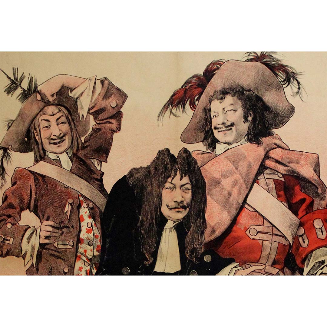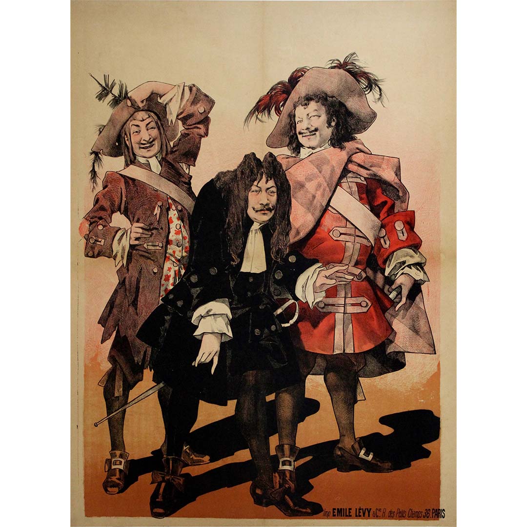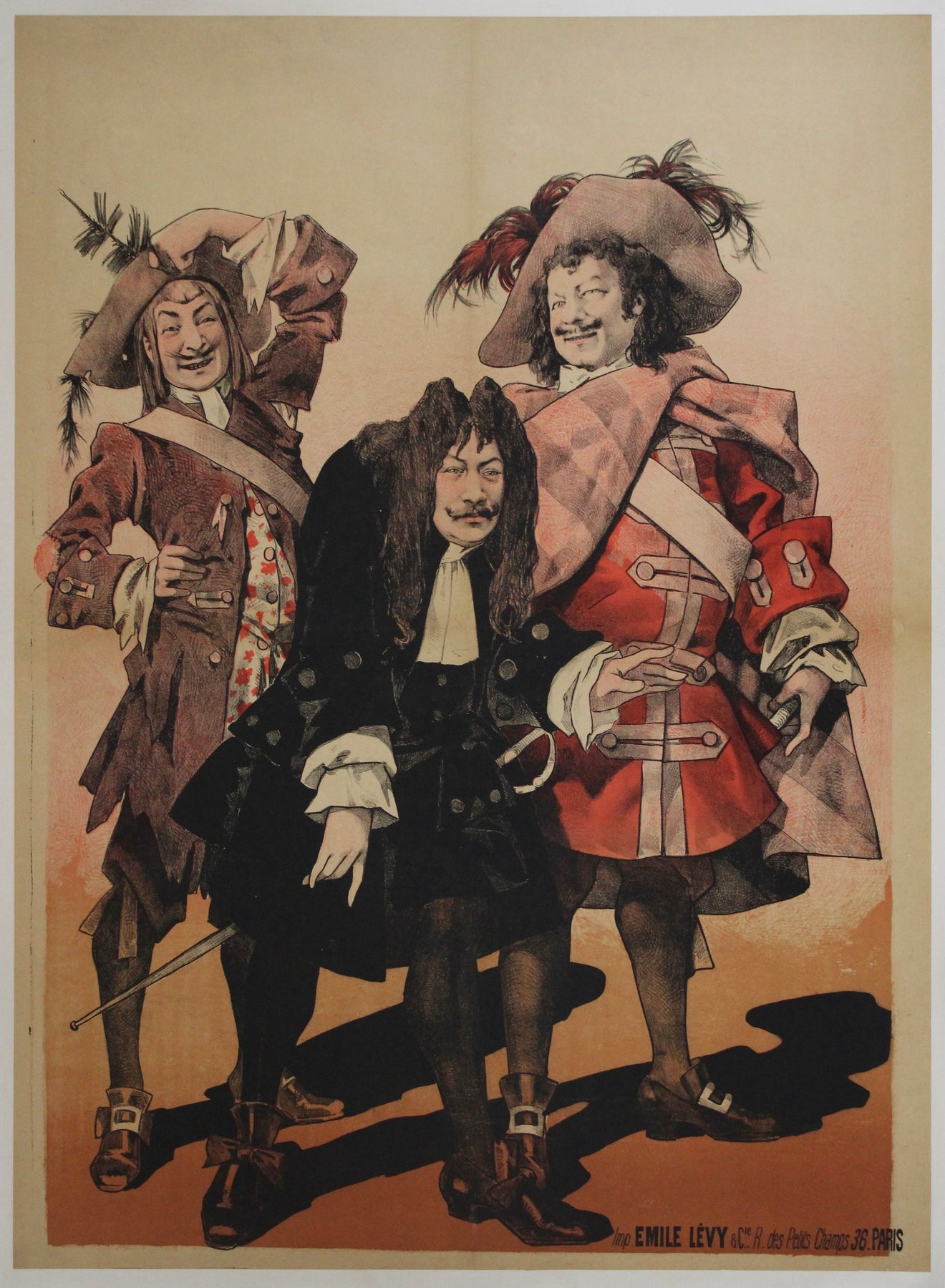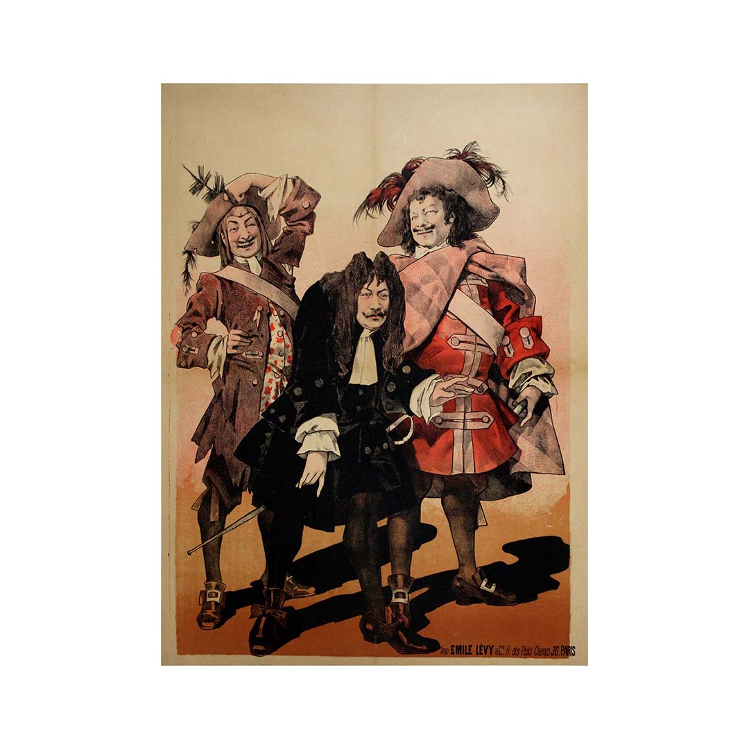 Imprimée dans des tons éclatants de pourpre, de sépia et de noir d'encre, cette affiche est un exemple remarquable de la publicité théâtrale de la Belle Époque. Les gestes et les costumes exagérés du trio font écho à la tradition de la Commedia dell'arte , tandis que la mention typographique soignée « Imp. Émile Lévy, 36 rue des Petits Champs, Paris » souligne le savoir-faire artisanal qui a présidé à sa réalisation.
