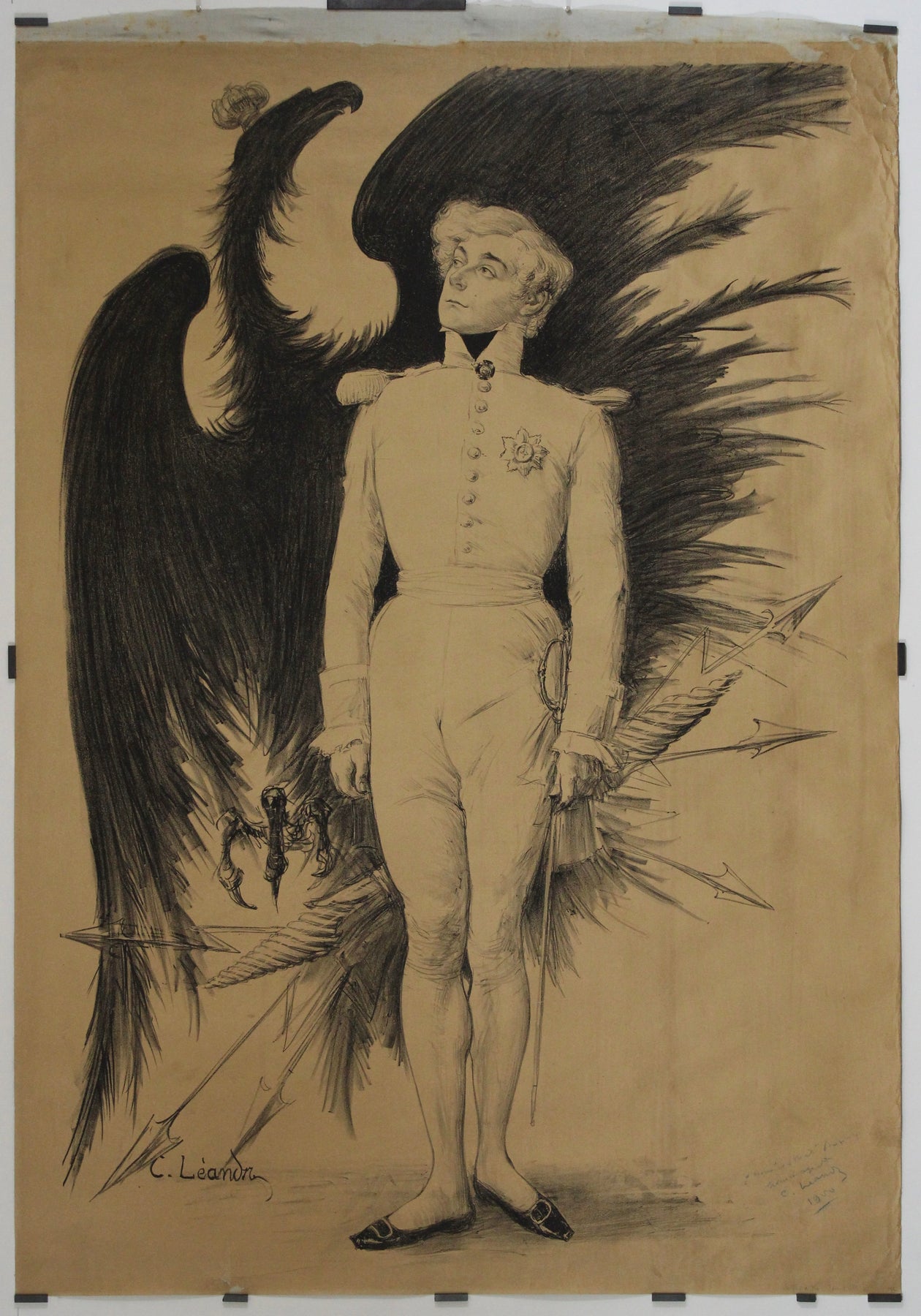 Cette lithographie originale de 1899, Le Roi de Rome – L'Aiglon , du célèbre illustrateur et caricaturiste français Charles Léandre, est une œuvre rare et évocatrice de la Belle Époque. Connu pour son travail magistral dans des publications satiriques comme Le Rire , Léandre s'attaque ici à un sujet d'une profonde résonance historique et émotionnelle : Napoléon II, fils de Napoléon Bonaparte, surnommé L'Aiglon .