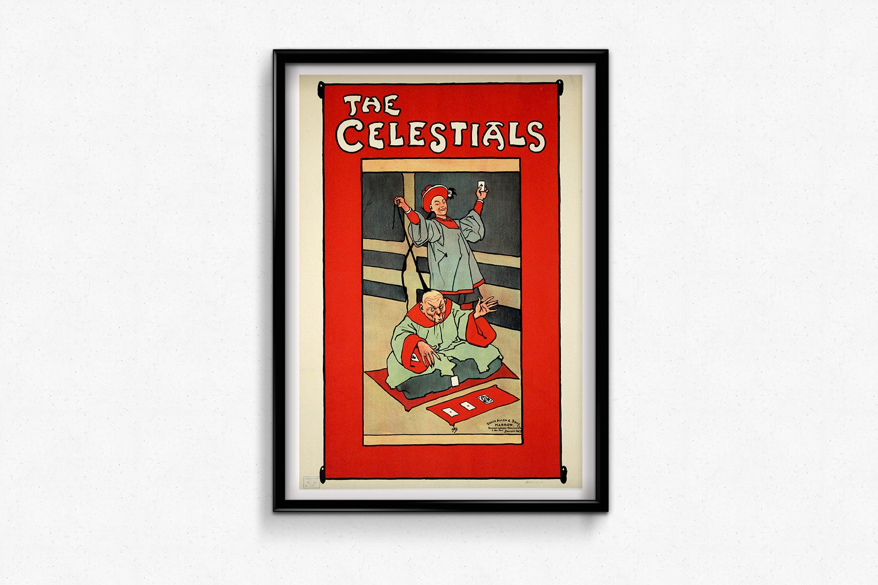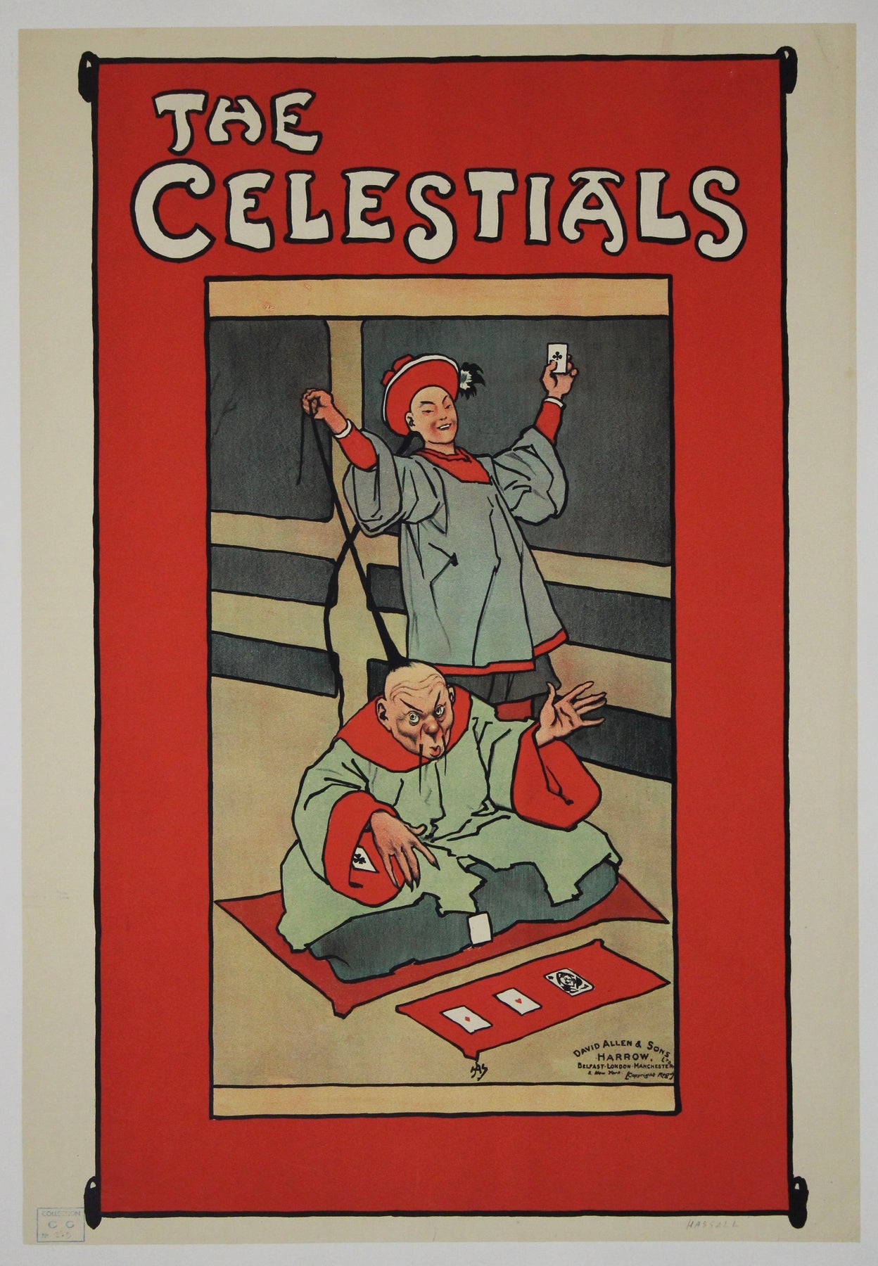 Voici une affiche originale de John Hassall intitulée « Les Célestes », créée au début du XXe siècle pour David Allen & Sons, à Harrow, Londres. Elle représente deux personnages chinois exécutant un tour de cartes de rue, dans le style iconique de Hassall : traits audacieux, aplats de couleurs, bordure rouge vif et lettrage net. John Hassall (1868-1948) fut l'un des illustrateurs et affichistes les plus influents de Grande-Bretagne, surnommé « Le Roi de l'Affiche » pour sa production prolifique d'affiches publicitaires, de théâtre et de voyage durant l'époque édouardienne. Cette affiche promouvait un spectacle de music-hall sur le thème des performances « orientales », alors en vogue, et témoigne du talent de Hassall pour allier humour, caricature et impact graphique dans une seule composition. Imprimée en lithographie sur pierre par David Allen & Sons, elle est en excellent état, avec des couleurs éclatantes et de légères marques du temps, caractéristiques d'une conservation en archives. Une pièce rare et de collection, témoin de l'âge d'or de l'affiche publicitaire illustrée britannique.