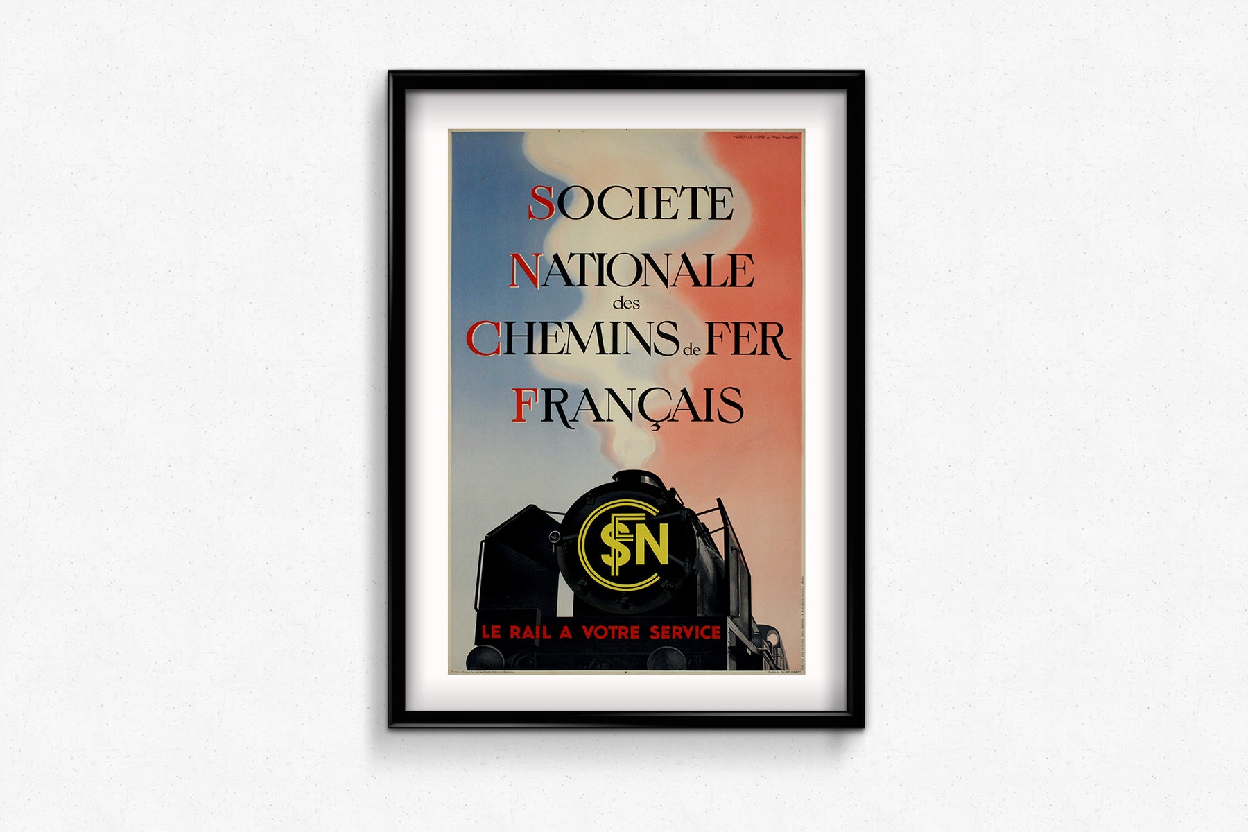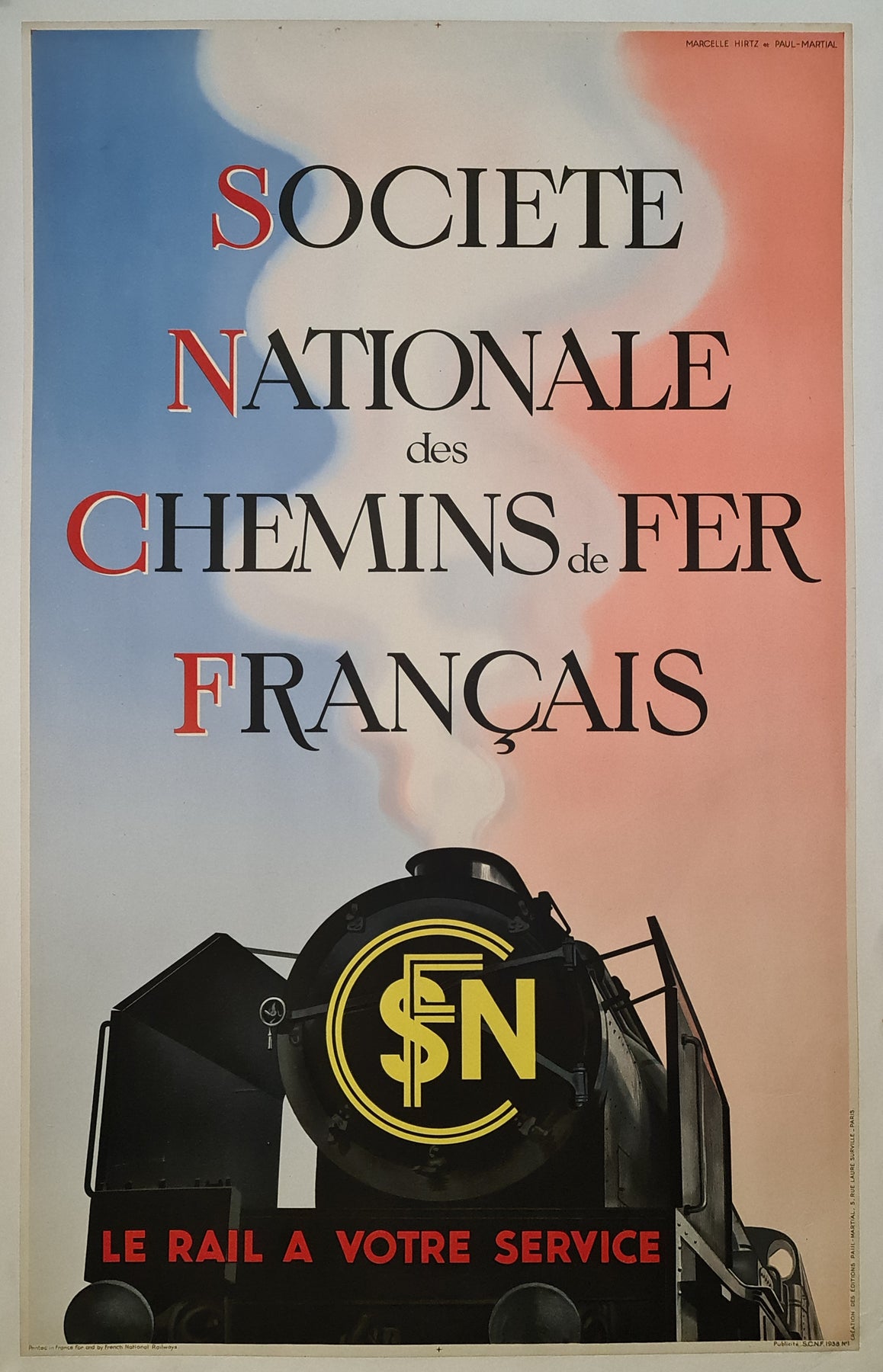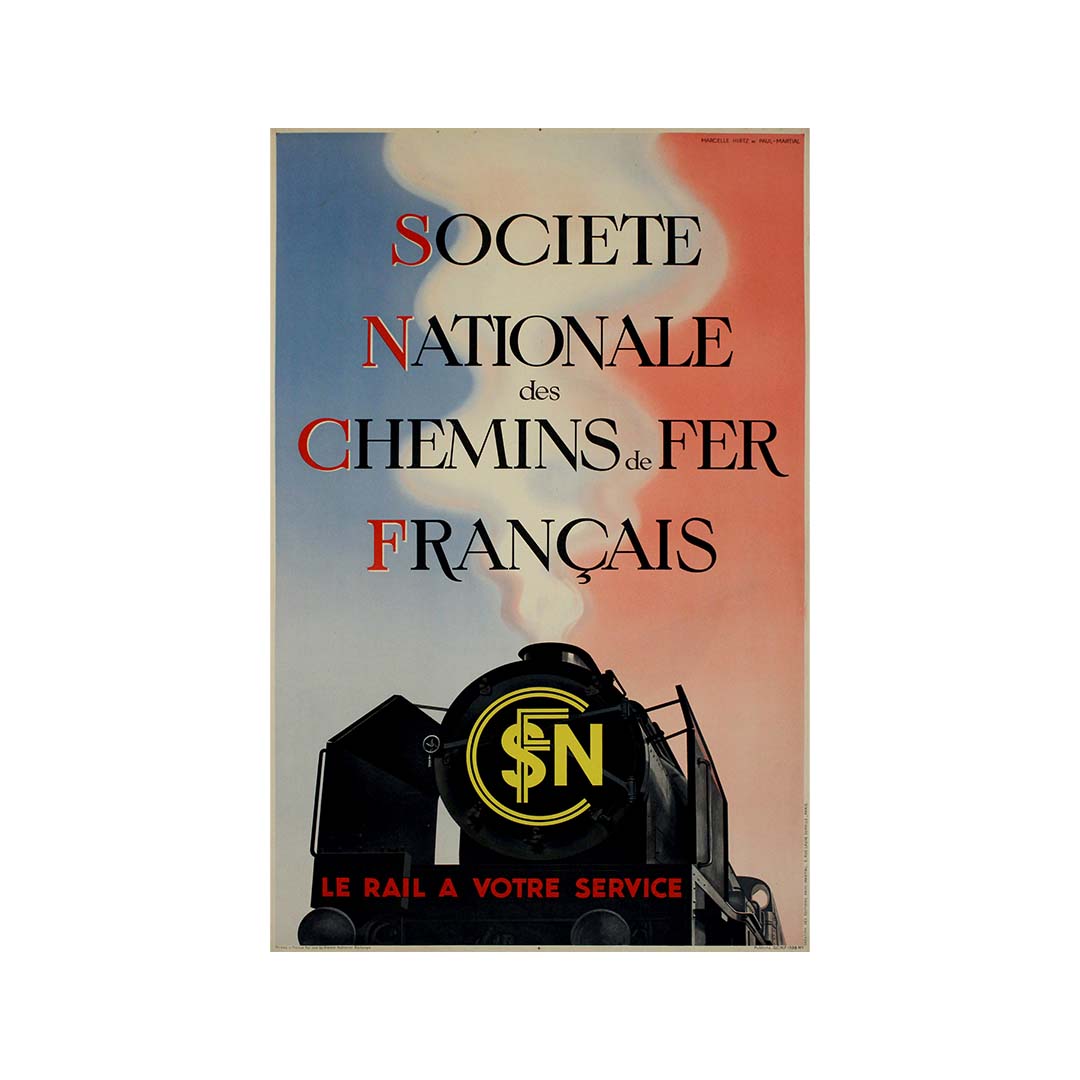 L'affiche de 1938 « Le Rail à Votre Service », créée par Marcelle Hirtz et Paul Martial pour la Société Nationale des Chemins de Fer Français (SNCF), constitue un témoignage majeur de l'histoire ferroviaire. Réalisée en 1938, année charnière de la création officielle de la SNCF et de l'unification des réseaux ferroviaires français au sein d'une seule entité nationalisée, cette affiche reflète l'optimisme et la modernisation de l'époque, soulignant l'importance du transport ferroviaire comme composante essentielle de l'infrastructure française.
