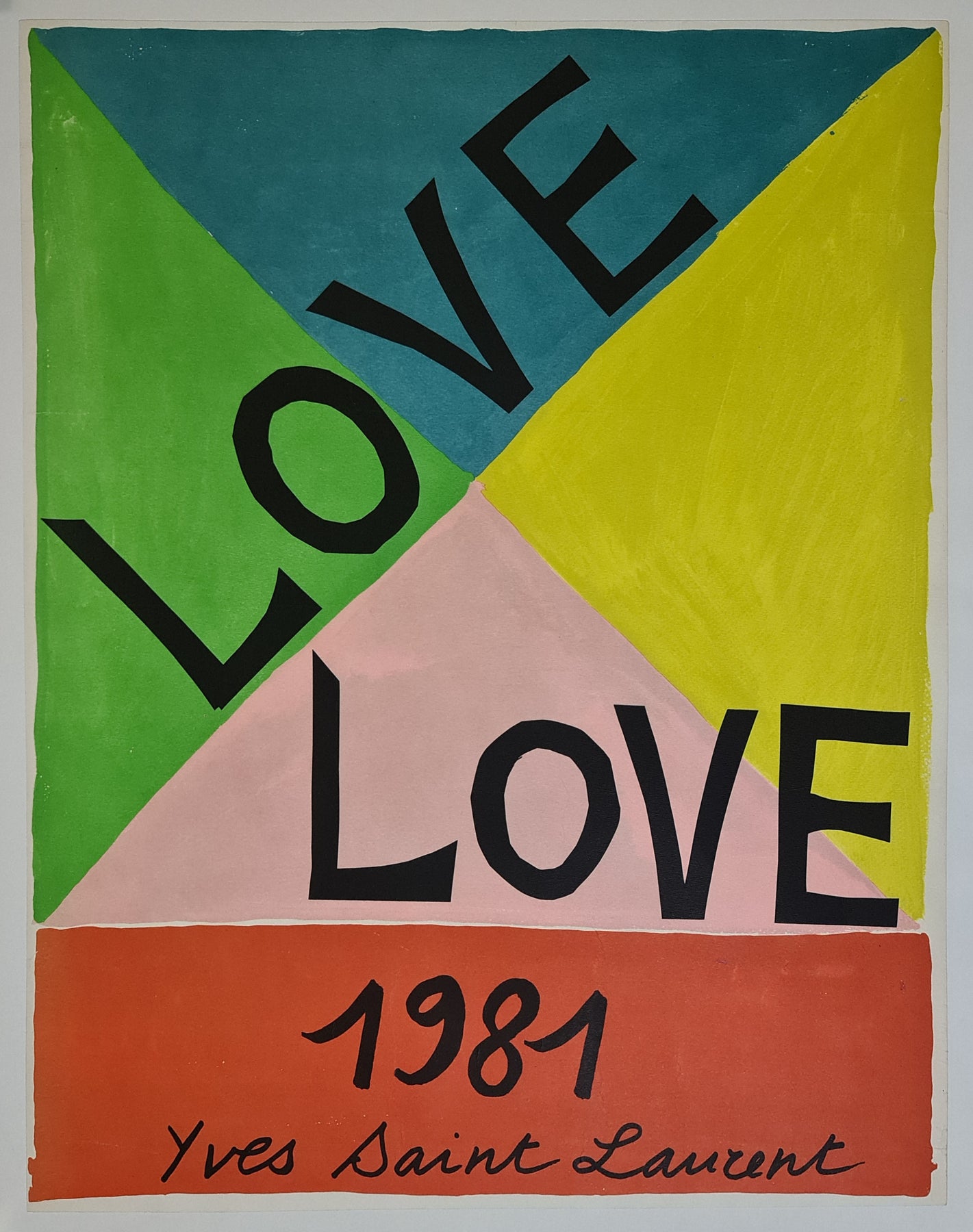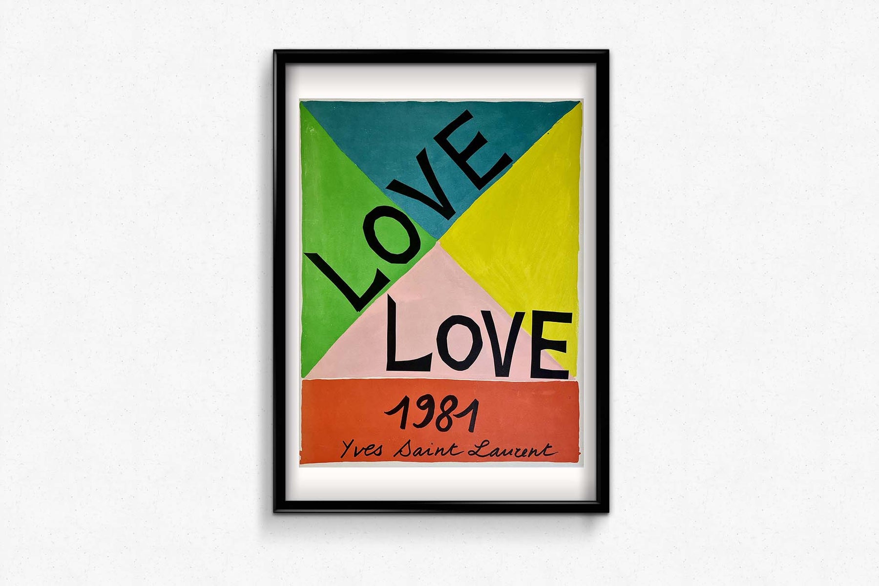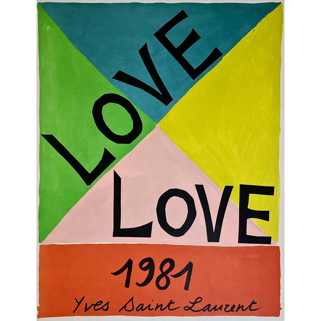 Créée en 1981 dans le cadre d'une série de cartes de vœux annuelles, l'affiche originale intitulée « Love » d'Yves Saint Laurent est un emblème précieux de l'expression artistique et de la sensibilité du couturier. Cette affiche s'inscrit dans une remarquable tradition qui s'est étendue de 1970 à 2007, durant laquelle Saint Laurent créait chaque année des cartes uniques sous forme d'affiches, qu'il envoyait à ses amis, collaborateurs et clients.