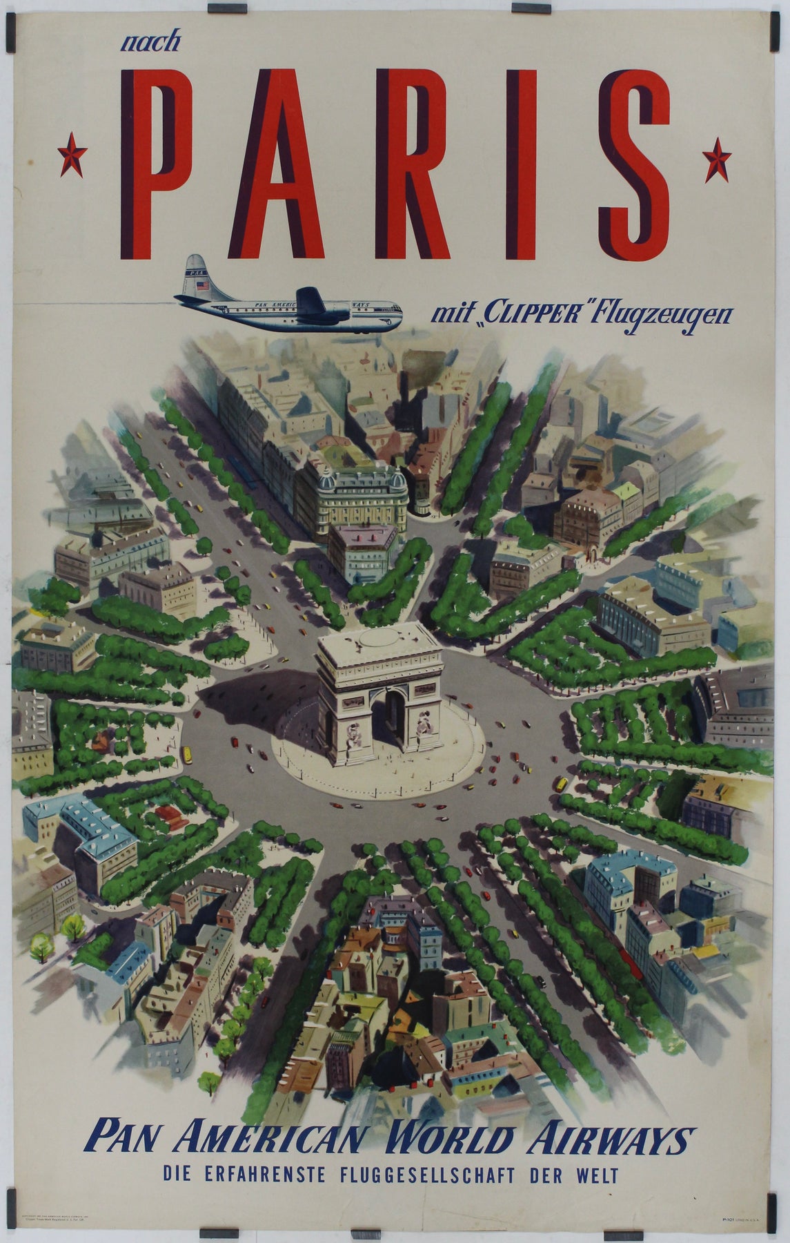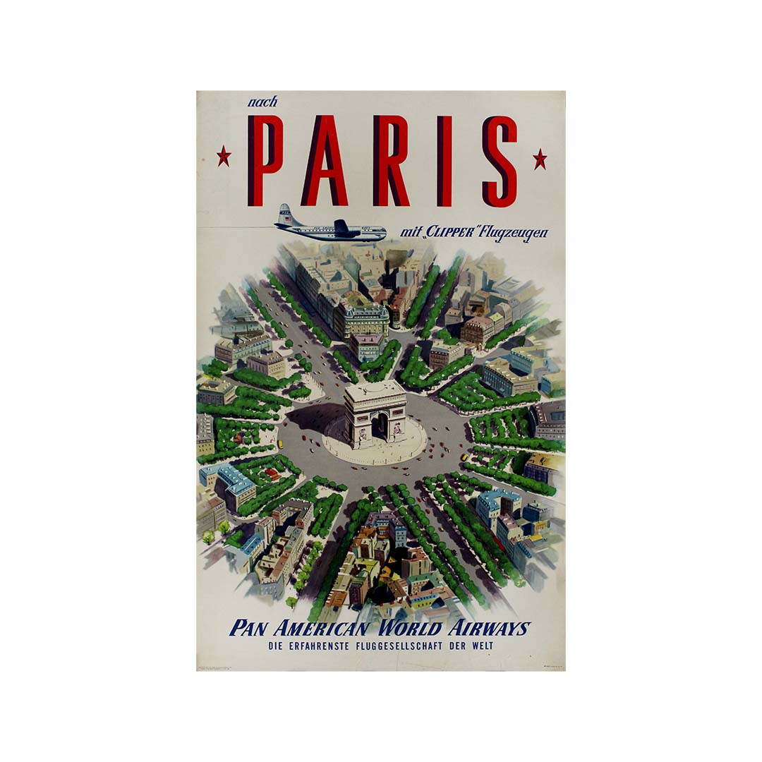 Cette affiche originale de 1951, créée pour Pan American World Airways, capture le glamour et le raffinement des voyages aériens vers Paris au milieu du XXe siècle. Arborant le slogan « Nach Paris mit Clipper Flugzeugen » (« Vers Paris avec les avions Clipper »), elle met en avant le service emblématique Clipper de Pan Am, qui a établi la norme d'excellence dans l'aviation internationale. Le slogan « Die erfahrenste Fluggesellschaft der Welt » (« La compagnie aérienne la plus expérimentée au monde ») souligne la réputation de Pan Am en matière de sécurité, de fiabilité et de prestige.