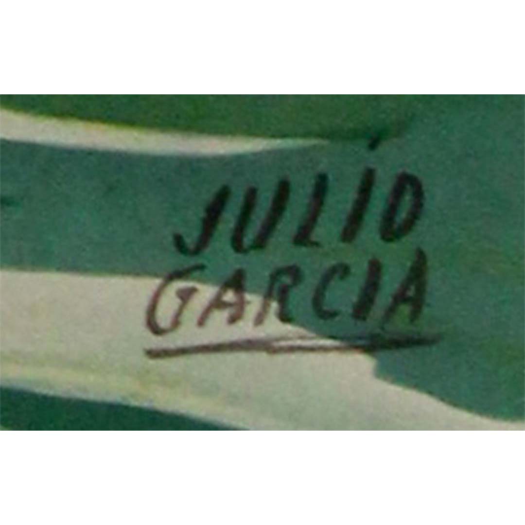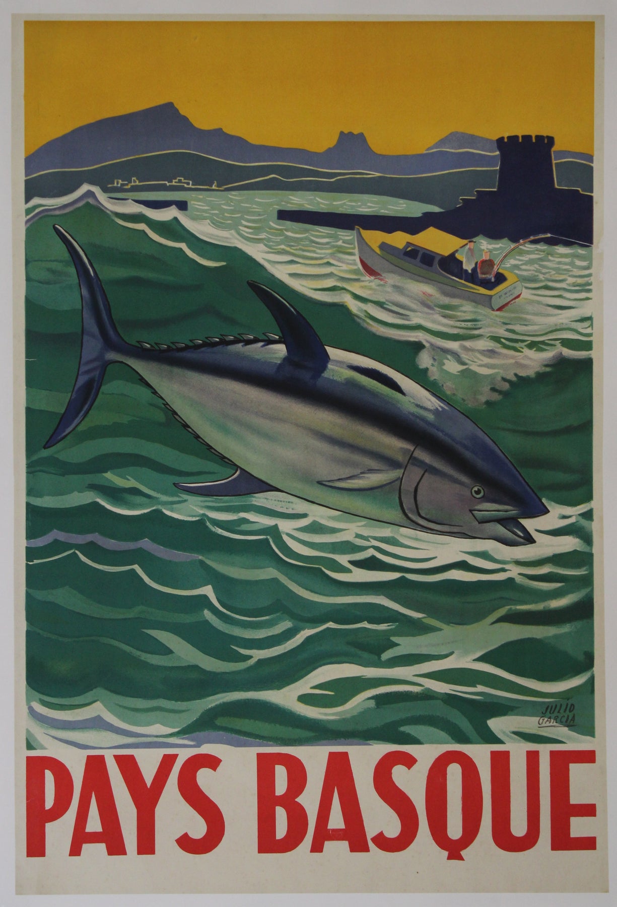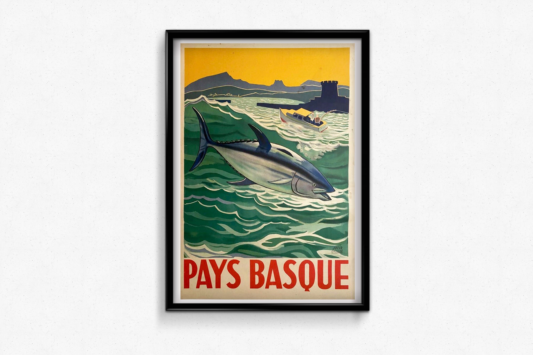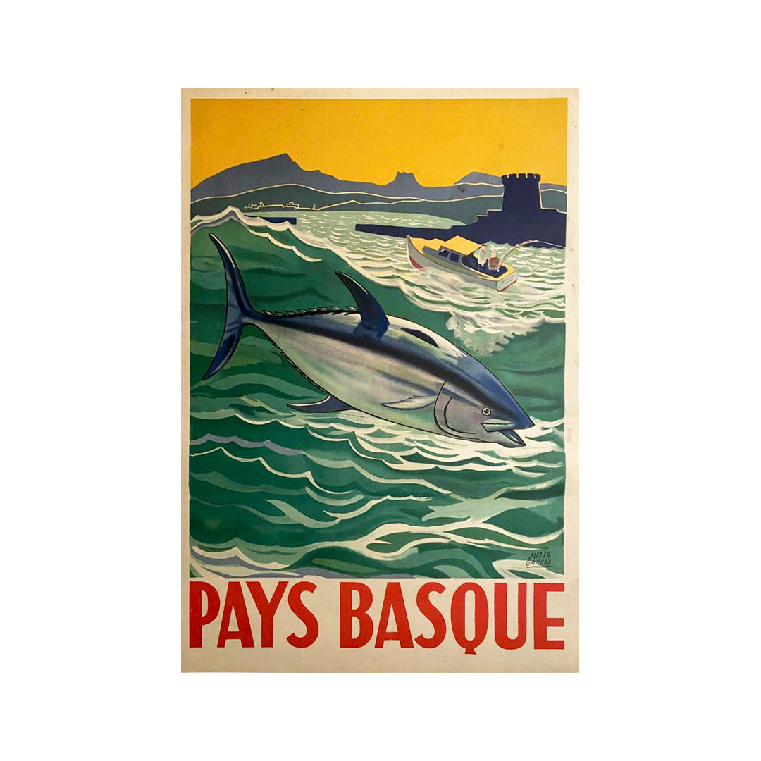Cette superbe affiche originale de Julio Garcia , datant d'environ 1940 , est un témoignage rare et éclatant des liens étroits qui unissent le Pays basque à la mer . Avec ses couleurs vives et sa composition stylisée, l'œuvre représente un thon dynamique nageant dans les eaux vertes de l'Atlantique, tandis qu'un bateau de pêche, emblématique du patrimoine maritime de la région, fend les vagues à l'arrière-plan.