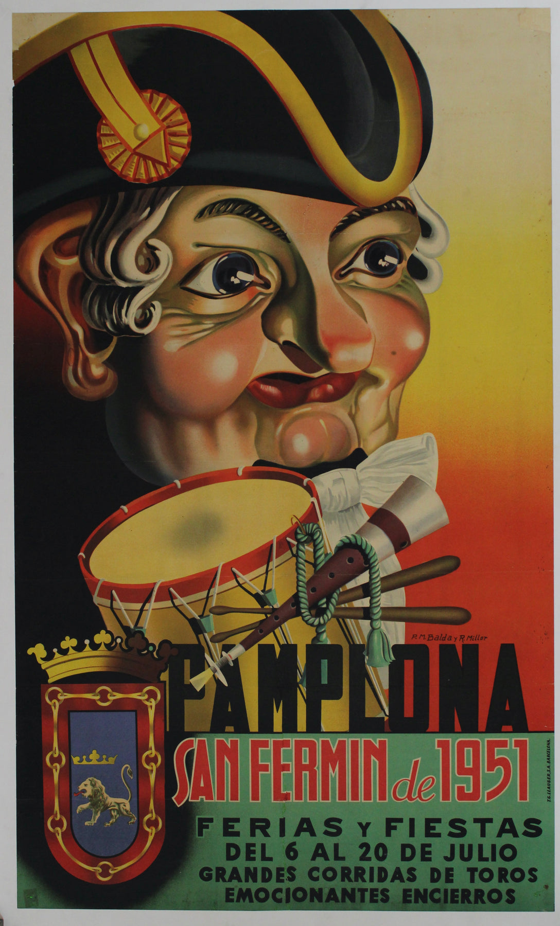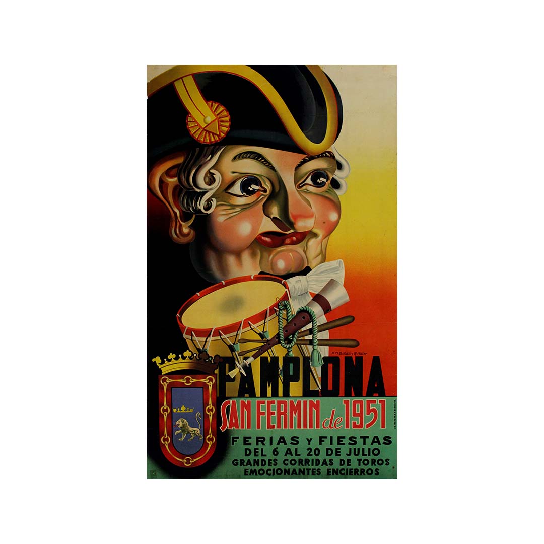 Le dessin de Balda y Millor illustre parfaitement le style artistique de l'époque, avec son utilisation audacieuse d'éléments graphiques et une approche ludique de la composition. La figure caricaturale sert non seulement de point d'ancrage visuel, mais aussi d'emblème de l'esprit joyeux et festif de la fête. L'affiche parvient à transmettre l'essence même de San Fermín, invitant ainsi les locaux comme les touristes à se joindre aux festivités.