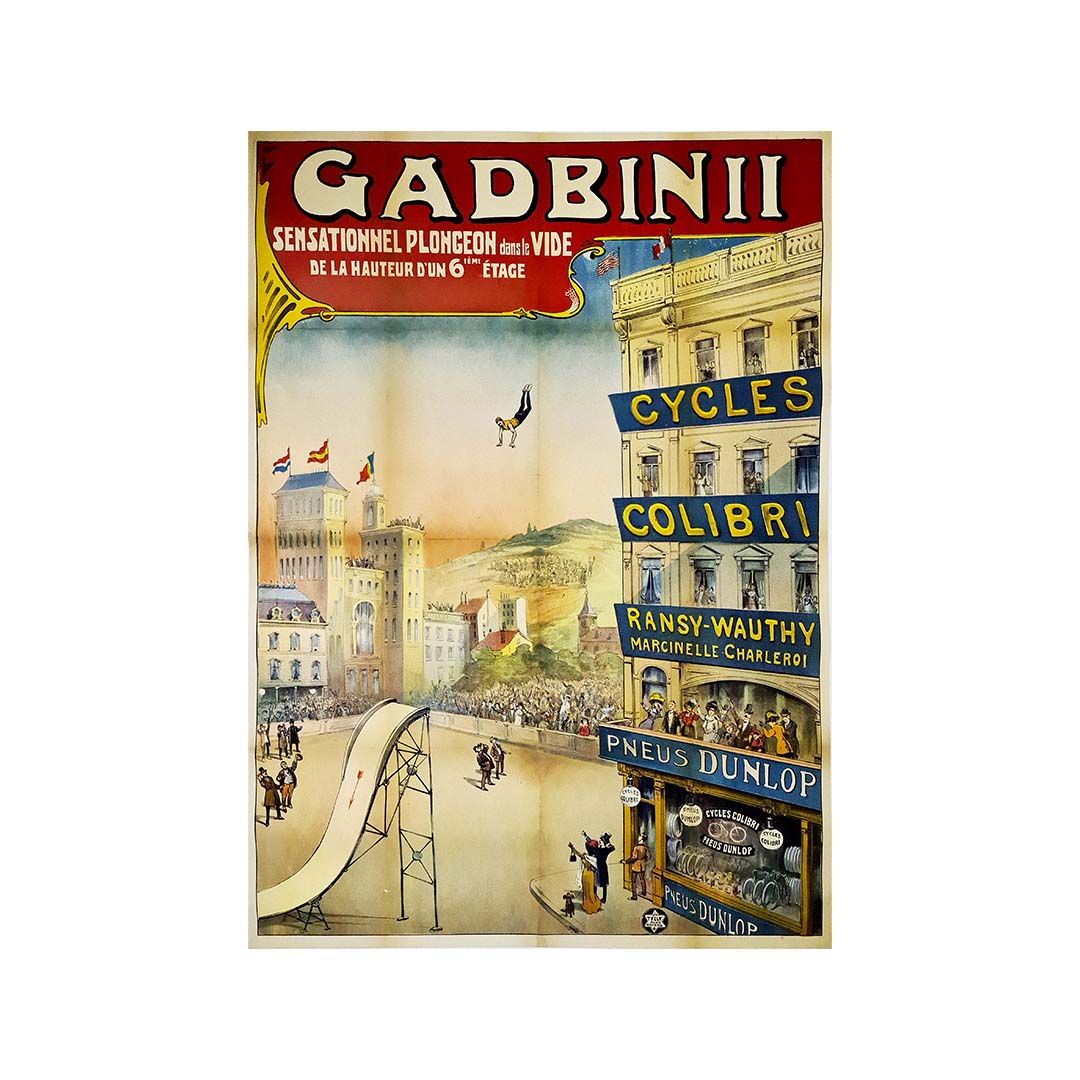 Magnifique affiche originale des années 30 pour le spectacle Gadbini et sa plongée sensationnelle dans le vide du 6e étage.