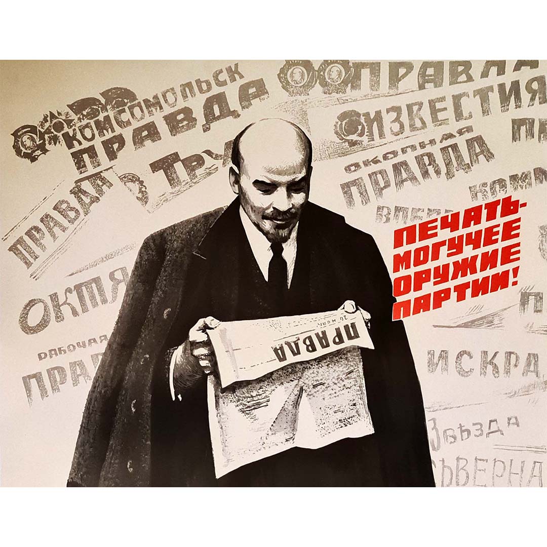 On le voit lire un journal intitulé « Правда », ce qui signifie Vérité.