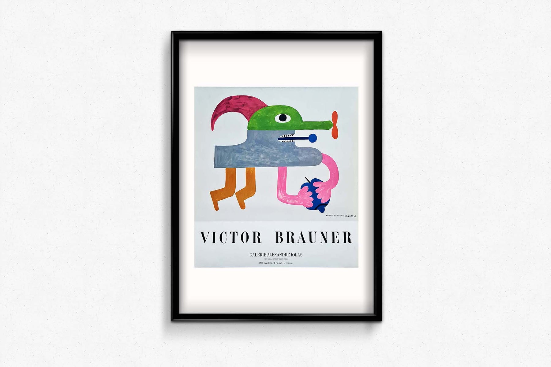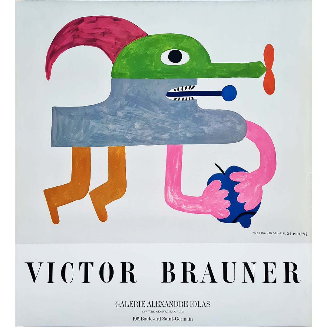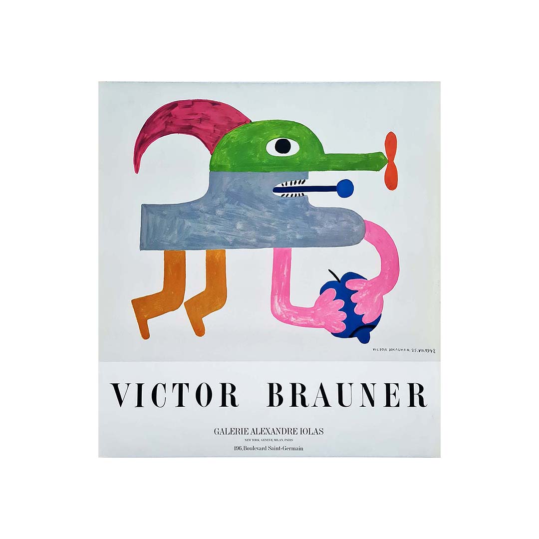 Magnifique affiche de Victor Brauner datant des années 70, réalisée pour une exposition à la Galerie Alexandre Iolas à Paris. Victor Brauner était un peintre et sculpteur roumain du mouvement surréaliste.