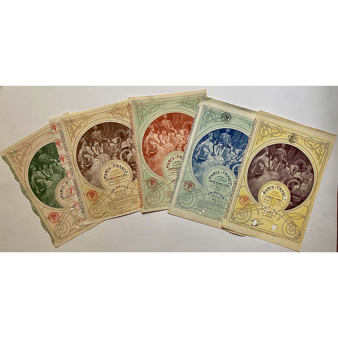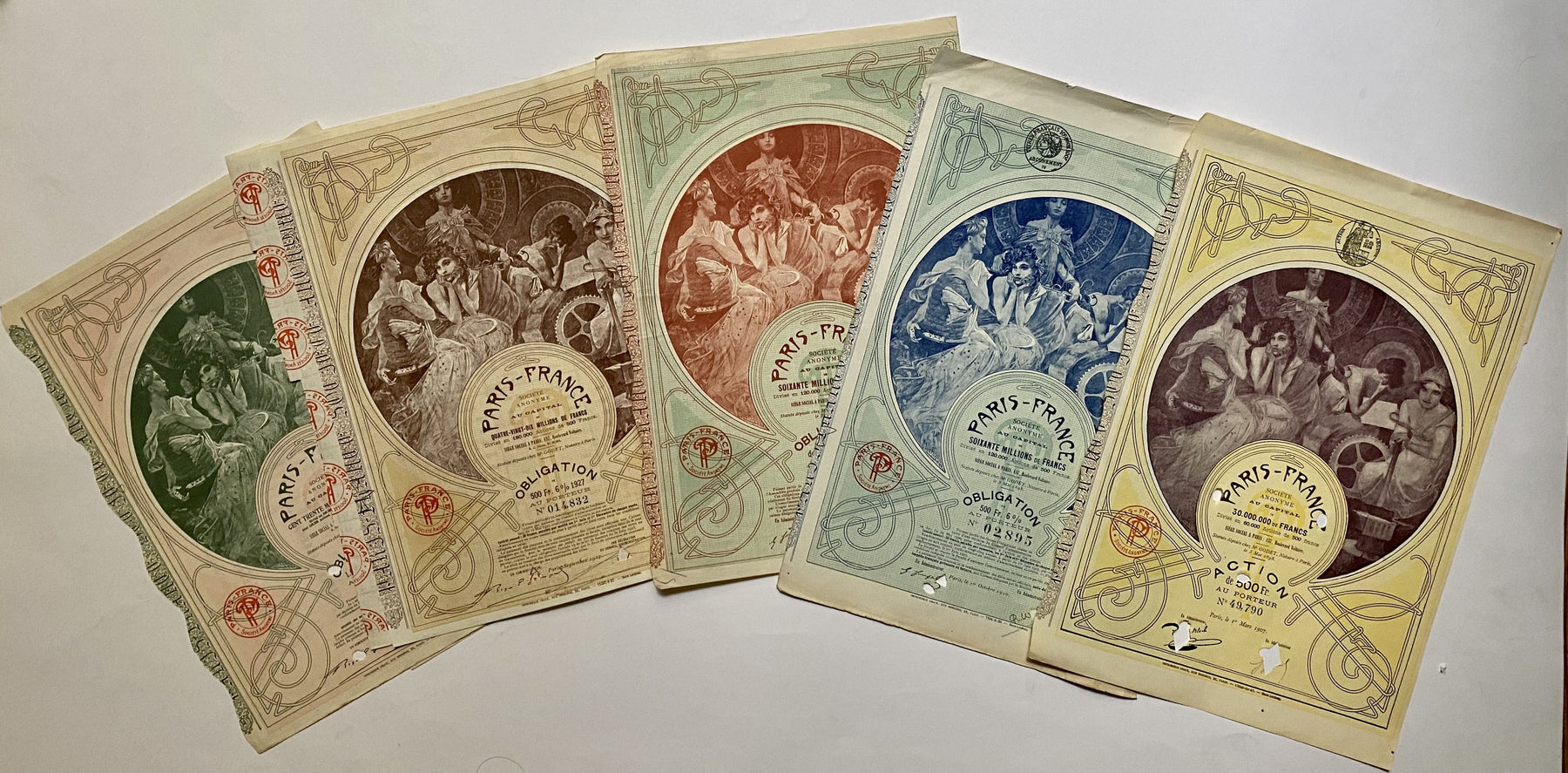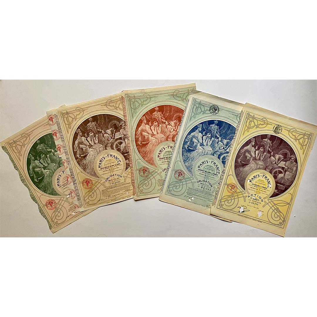 L'ouvrage original « Obligation et Action au Porteur », illustré par Alphonse Mucha, représente un mélange captivant de finance et d'art, mettant en valeur le style distinctif de Mucha et contribuant à la tradition de l'art décoratif dans les documents financiers.