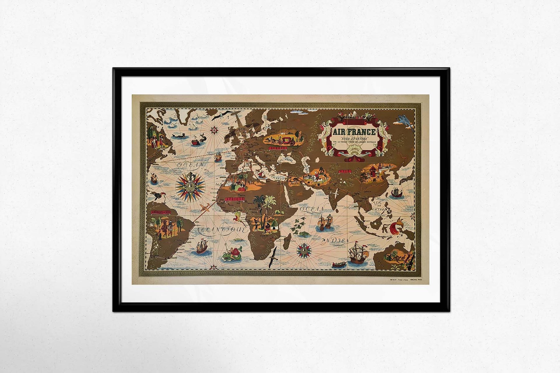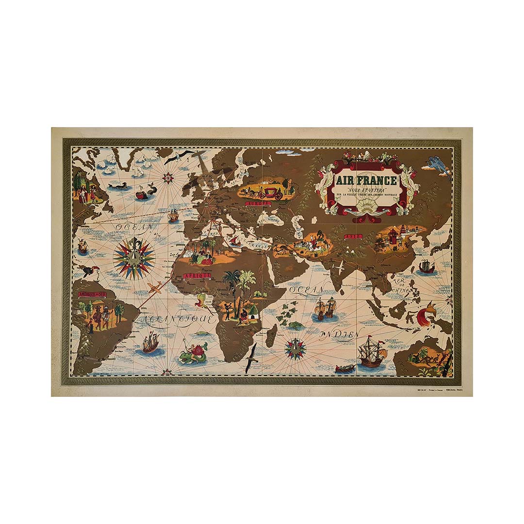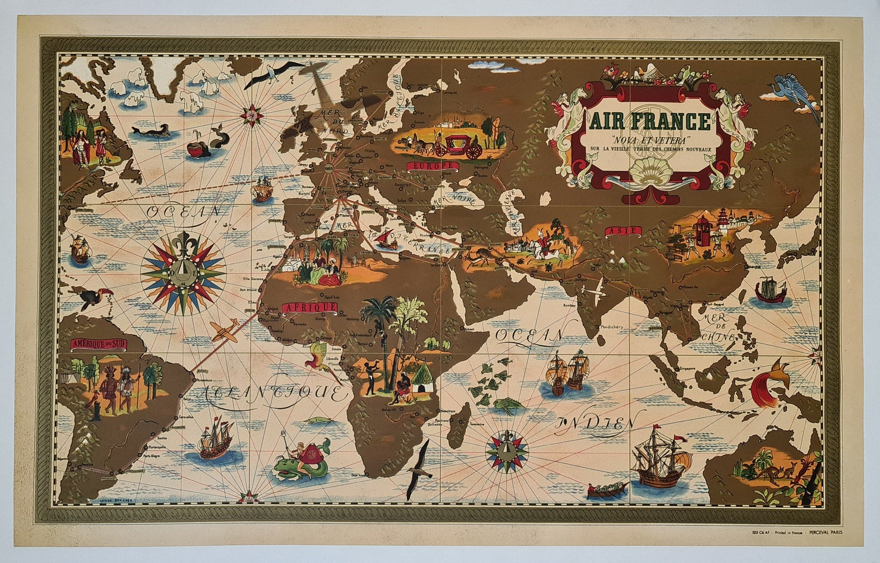 En 1939, Lucien Boucher, artiste et illustrateur français de renom, créa pour Air France une carte captivante intitulée « Nova et Vetera » , soit « Nouveau et Ancien » en latin. Cette affiche lithographique originale est une remarquable fusion entre l'art cartographique ancien et l'aviation moderne, conçue comme support publicitaire pour la compagnie aérienne. Elle symbolise avec élégance le lien entre les routes historiques de l'exploration et les nouvelles routes rendues possibles par le transport aérien.