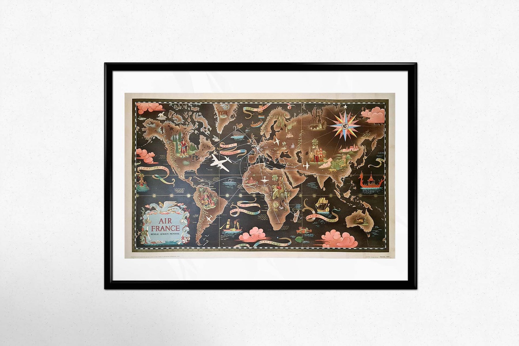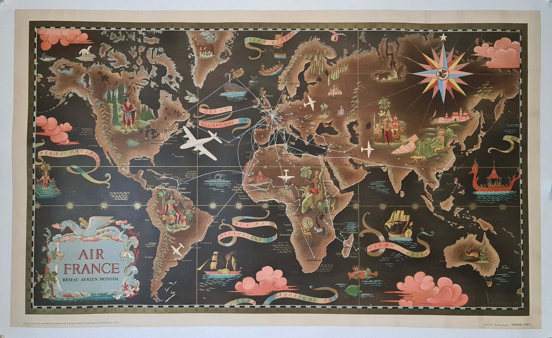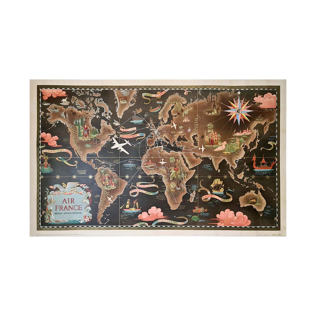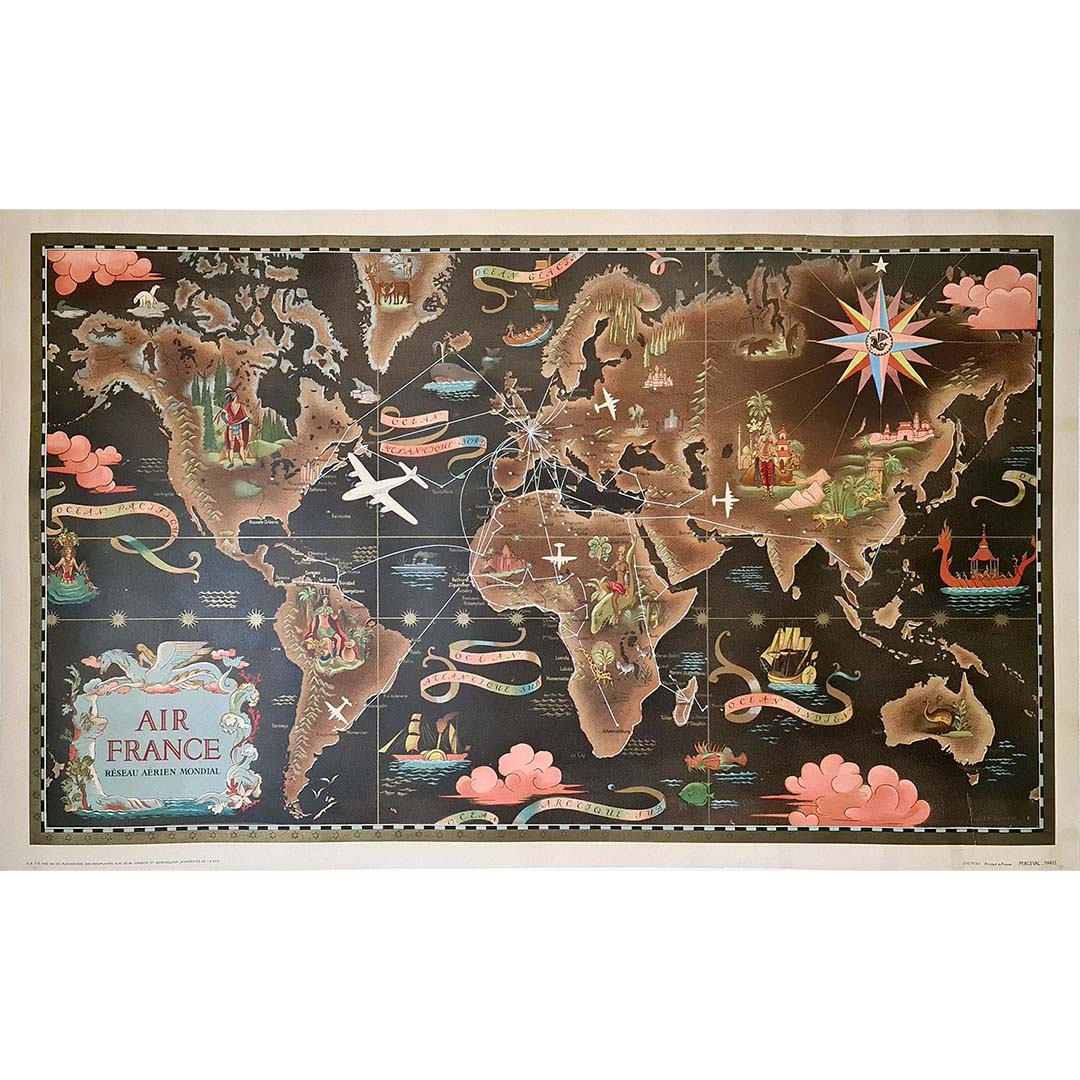 Ces affiches étaient souvent imprimées par l'atelier de lithographie français Perceval, réputé pour la qualité de sa production, ce qui sublimait l'œuvre de Boucher. Les affiches cartographiques du Réseau Aérien Mondial ne sont pas de simples publicités de voyage ; ce sont aussi des œuvres d'art de collection, très prisées des collectionneurs d'affiches d'aviation vintage, de design du milieu du XXe siècle et d'art publicitaire.