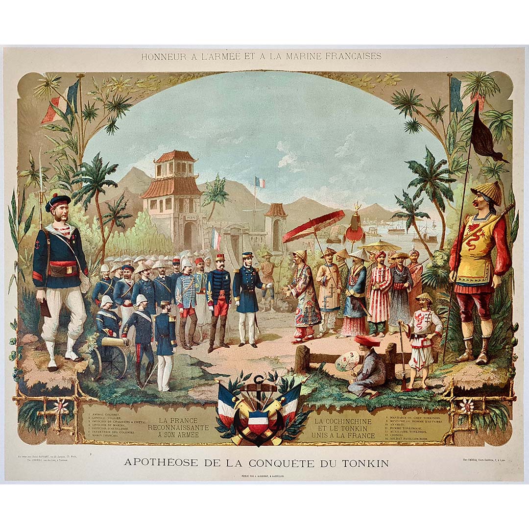 Affiche de la fin du XIXe siècle commémorant la conquête du Tonkin. Honneur à l'armée et à la marine françaises, la France reconnaissante envers son armée, la Cochinchine et le Tonkin unis à la France.