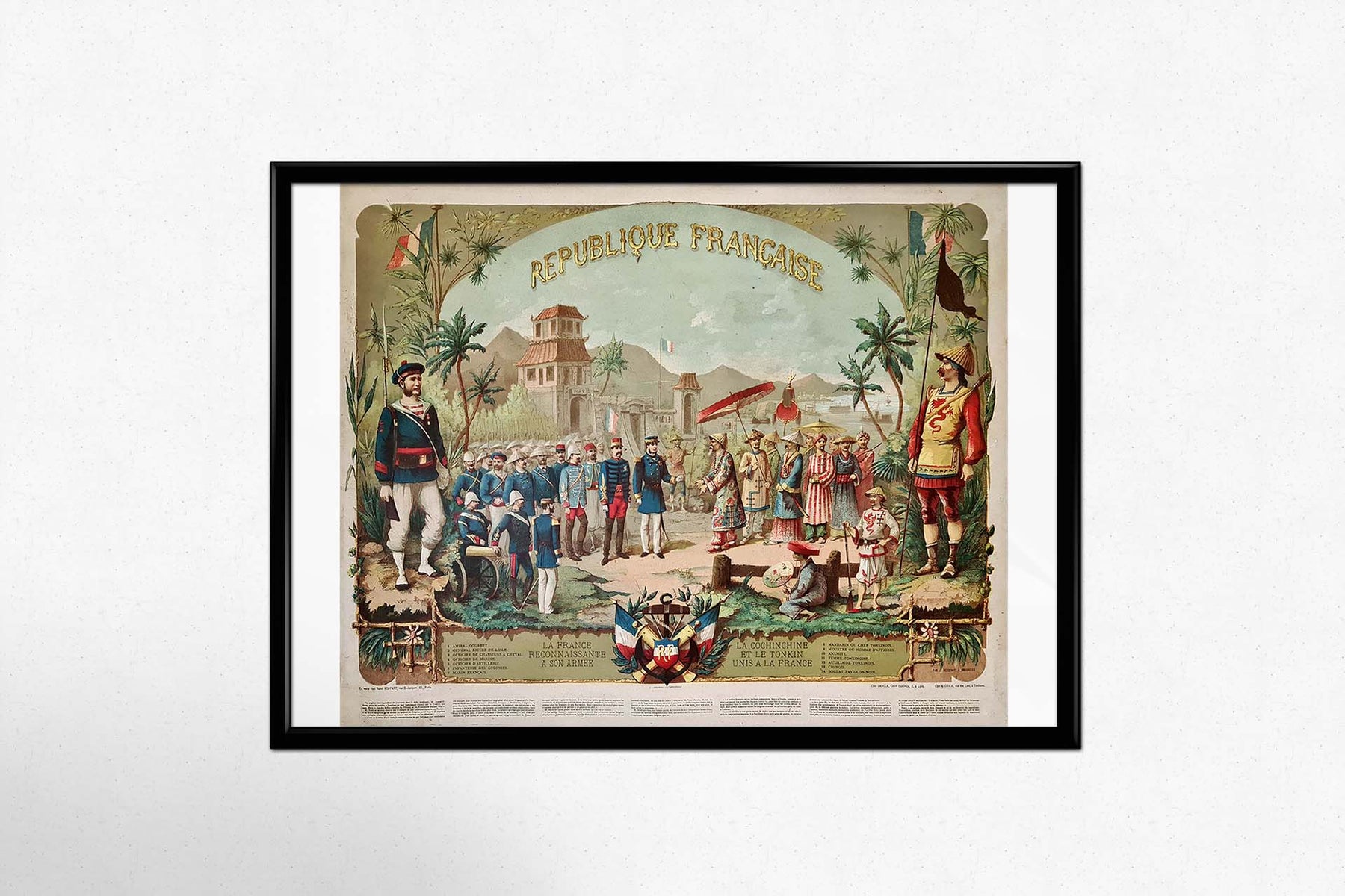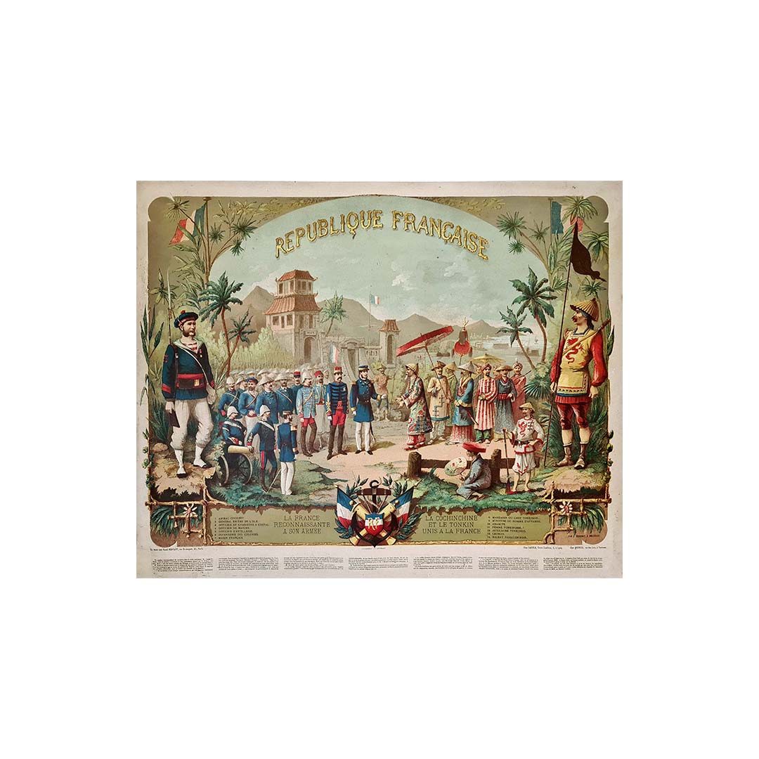 Belle affiche de la fin du XIXe siècle sur la Cochinchine et le Tonkin rattachés à la France. Honneur à l'armée et à la marine françaises, la France reconnaissante envers son armée.