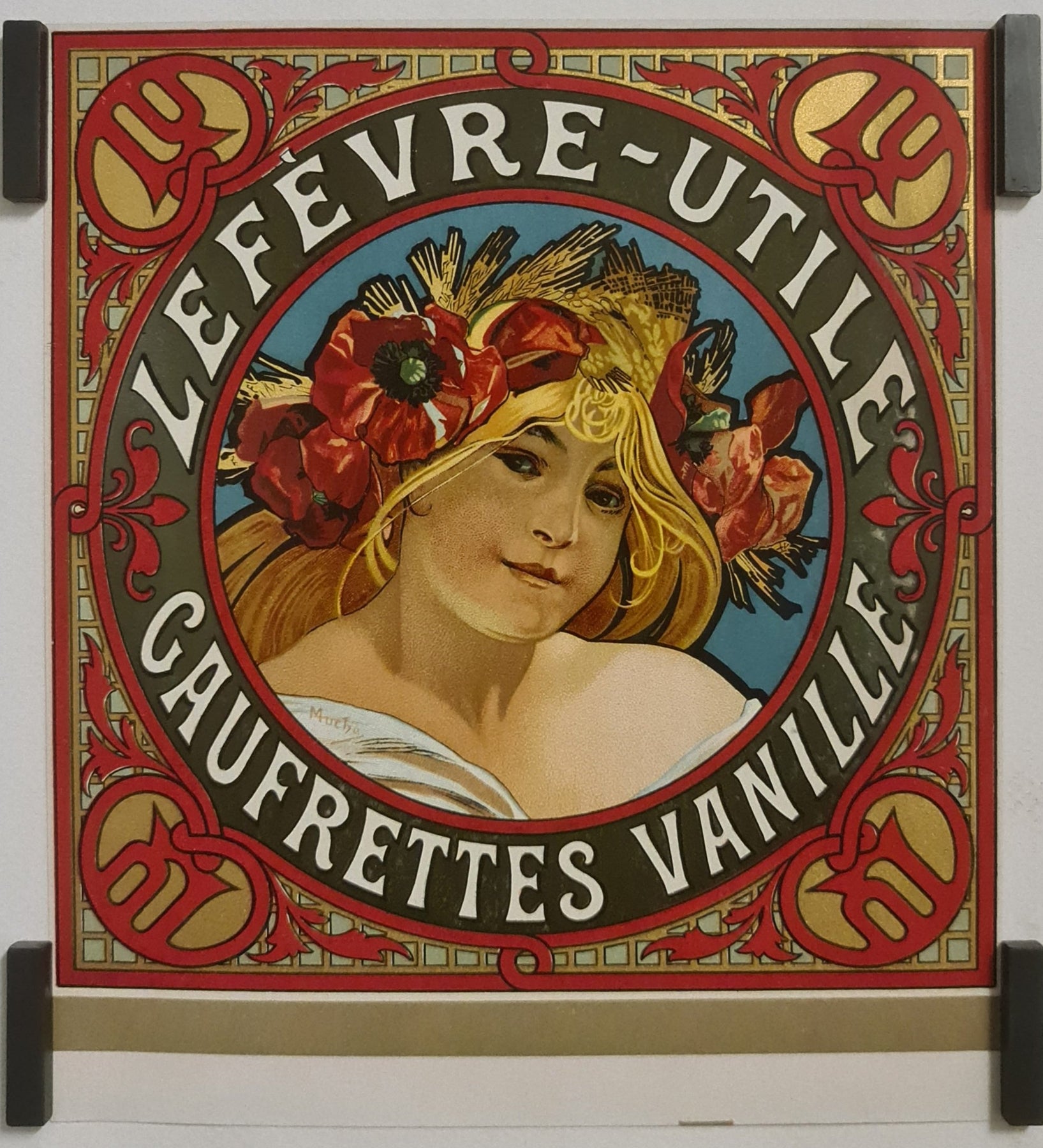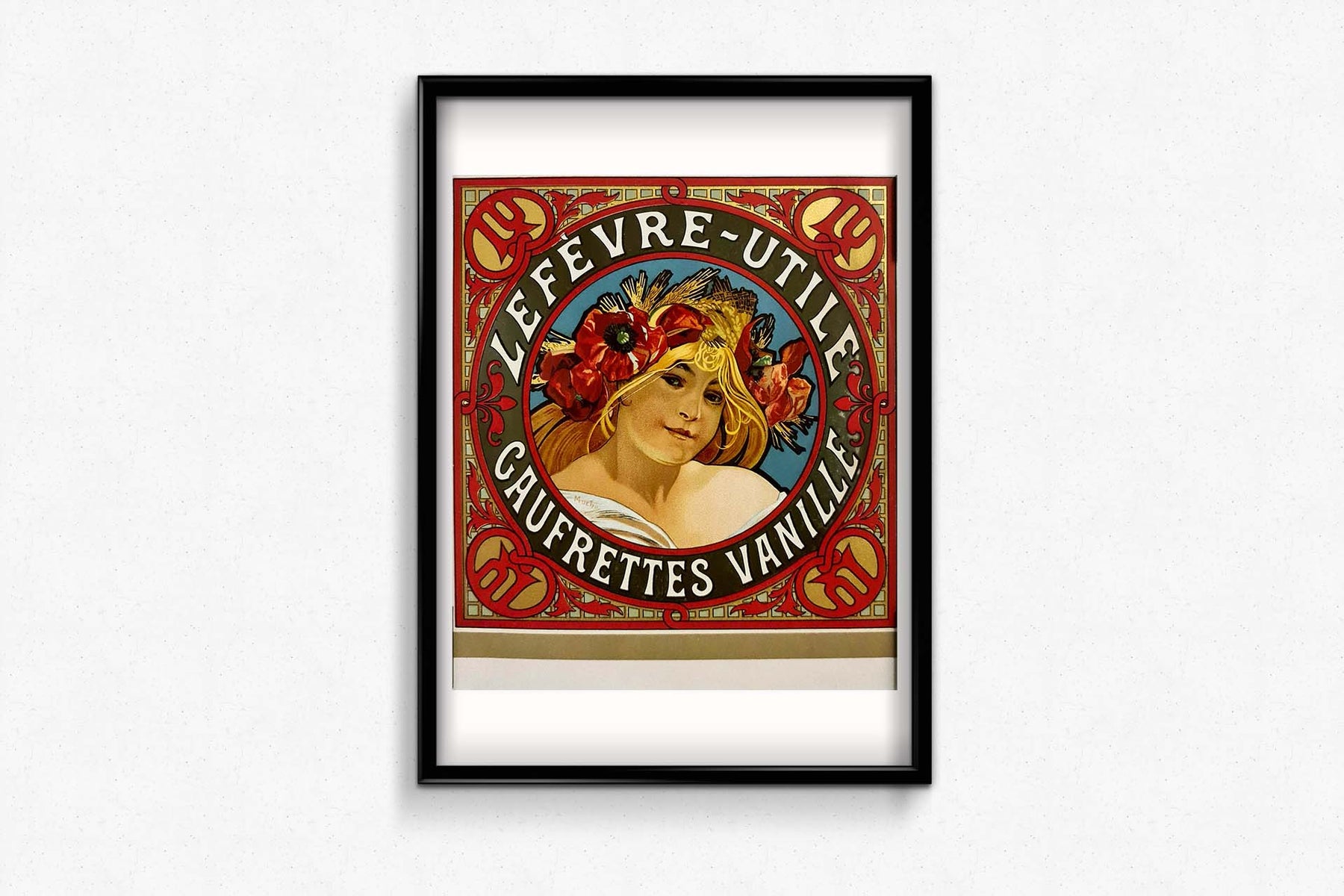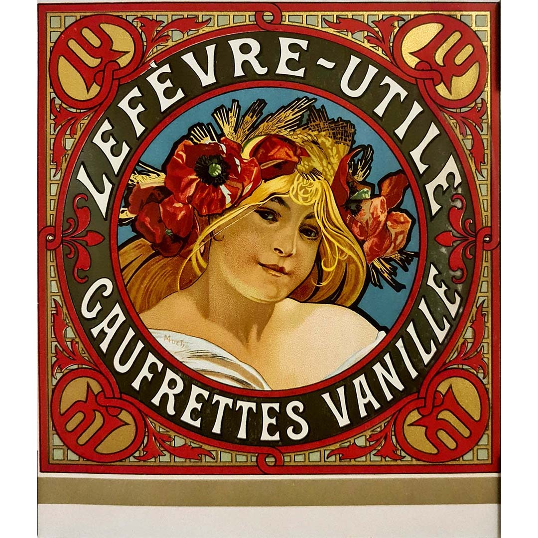La chromolithographie d'Alphonse Mucha de 1898 pour les gaufrettes à la vanille de la marque Lefèvre Utile (LU) est une œuvre emblématique qui incarne l'esthétique Art nouveau et témoigne du génie créatif de l'artiste. Mucha, célèbre pour son style orné et élégant, a contribué à redéfinir l'art de l'affiche et a marqué durablement le monde de l'illustration et du design.