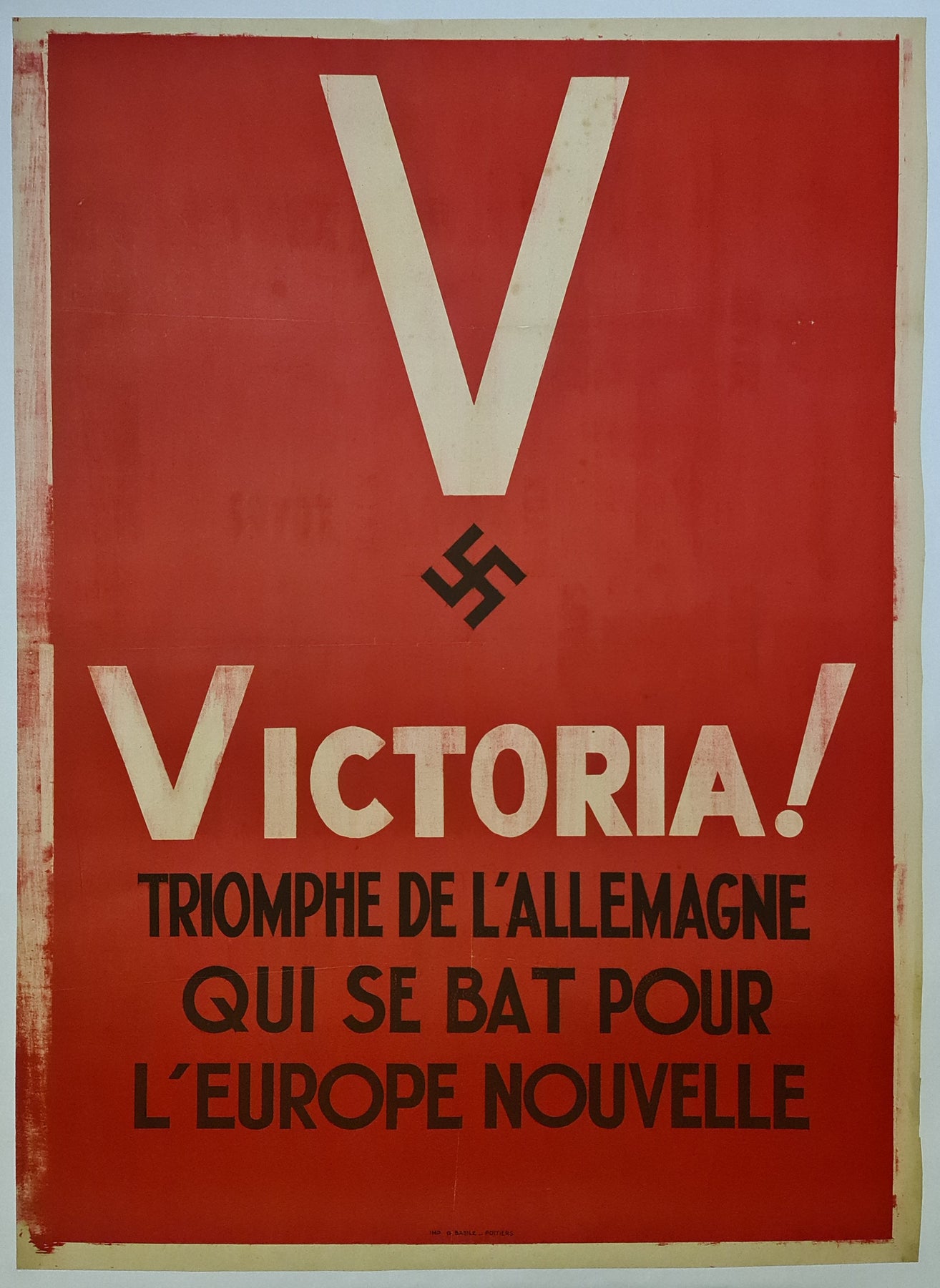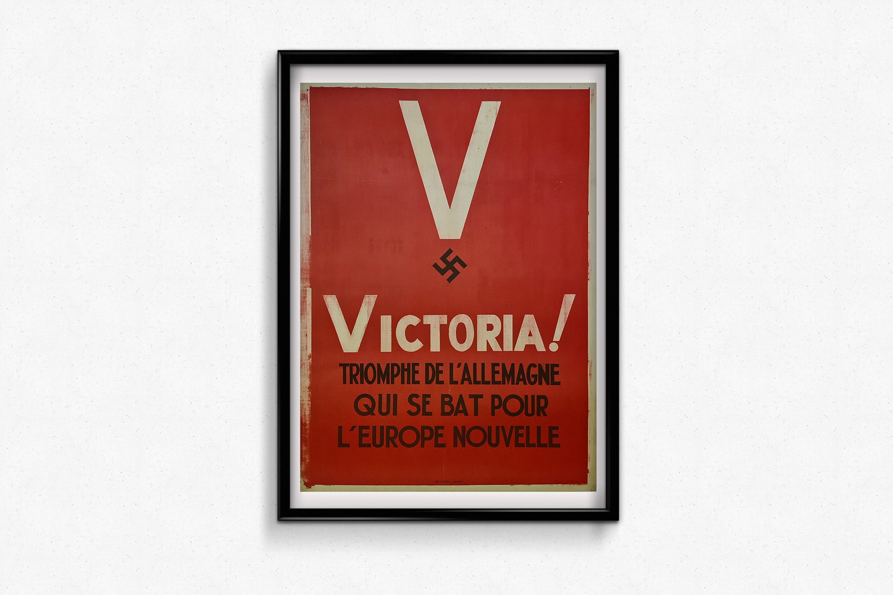 Cette affiche de propagande originale de 1943, intitulée « Victoria ! Triomphe de l'Allemagne qui se bat pour l'Europe nouvelle » , a été produite pendant la Seconde Guerre mondiale et reflète le langage visuel et le message idéologique diffusés en Europe occupée sous contrôle allemand. Conçue comme une œuvre percutante, l'affiche illustre l'esthétique austère et provocatrice typique de la propagande politique en temps de guerre.