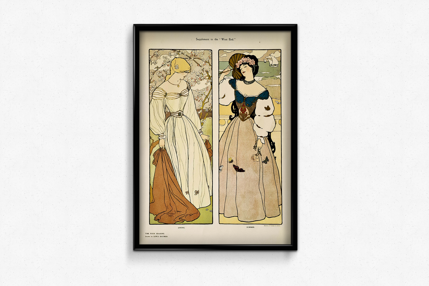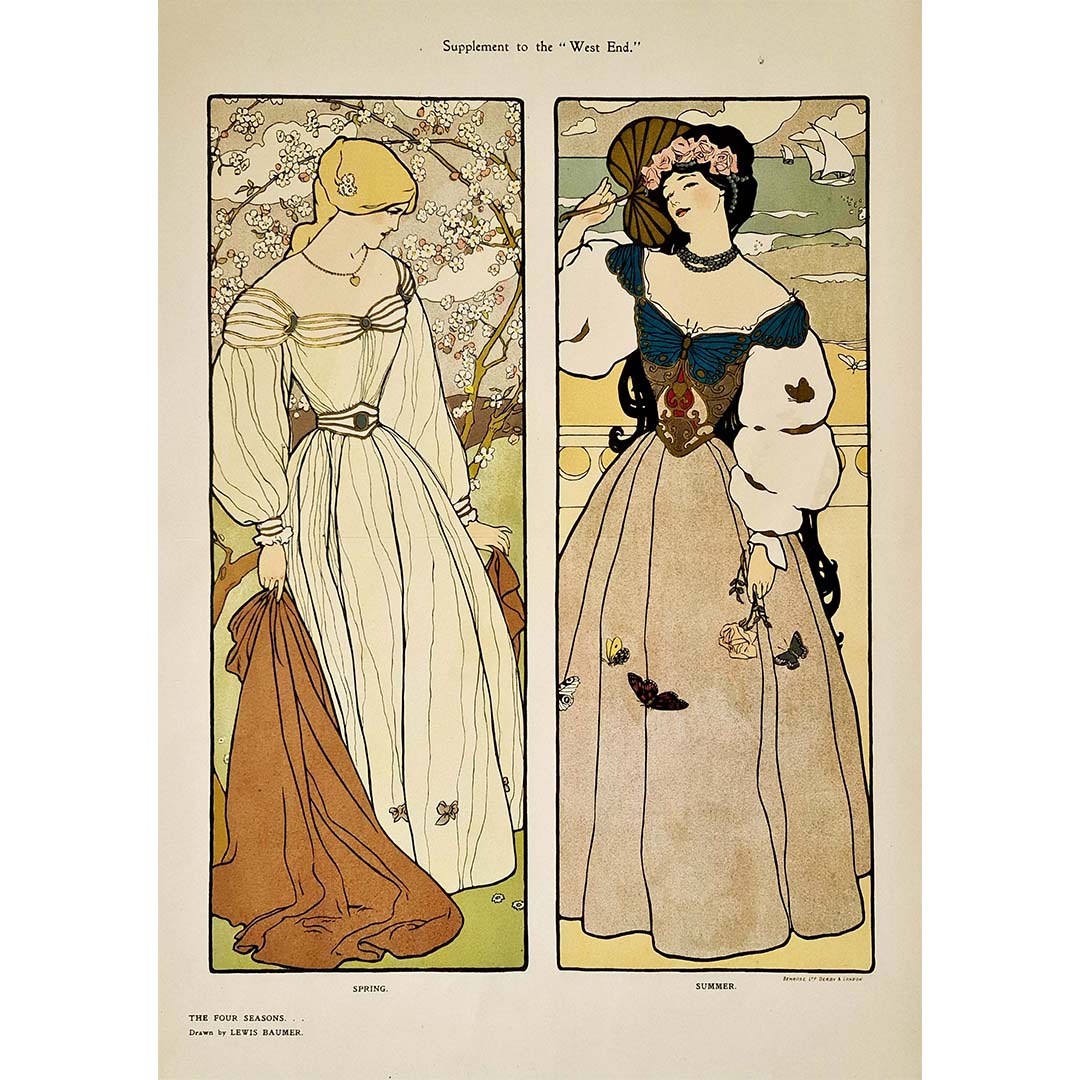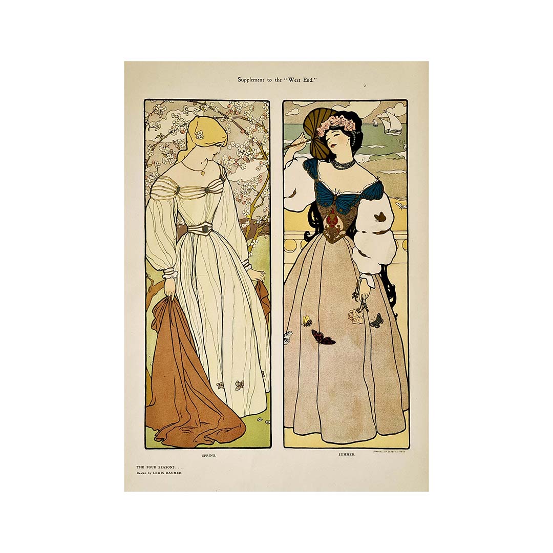 Magnifique affiche de style Art nouveau de Lewis Baumer illustrant les saisons du printemps et de l'été.