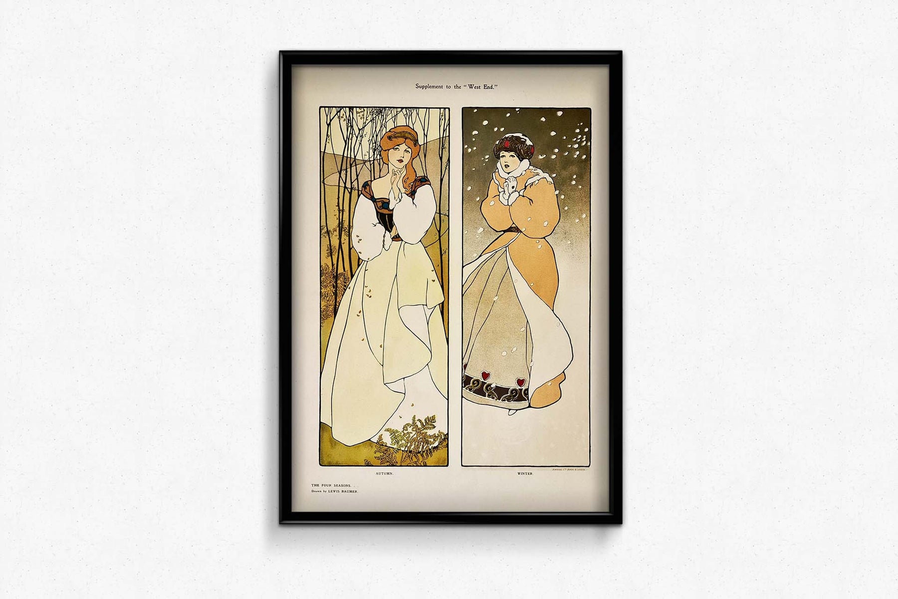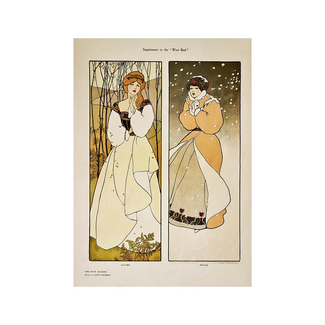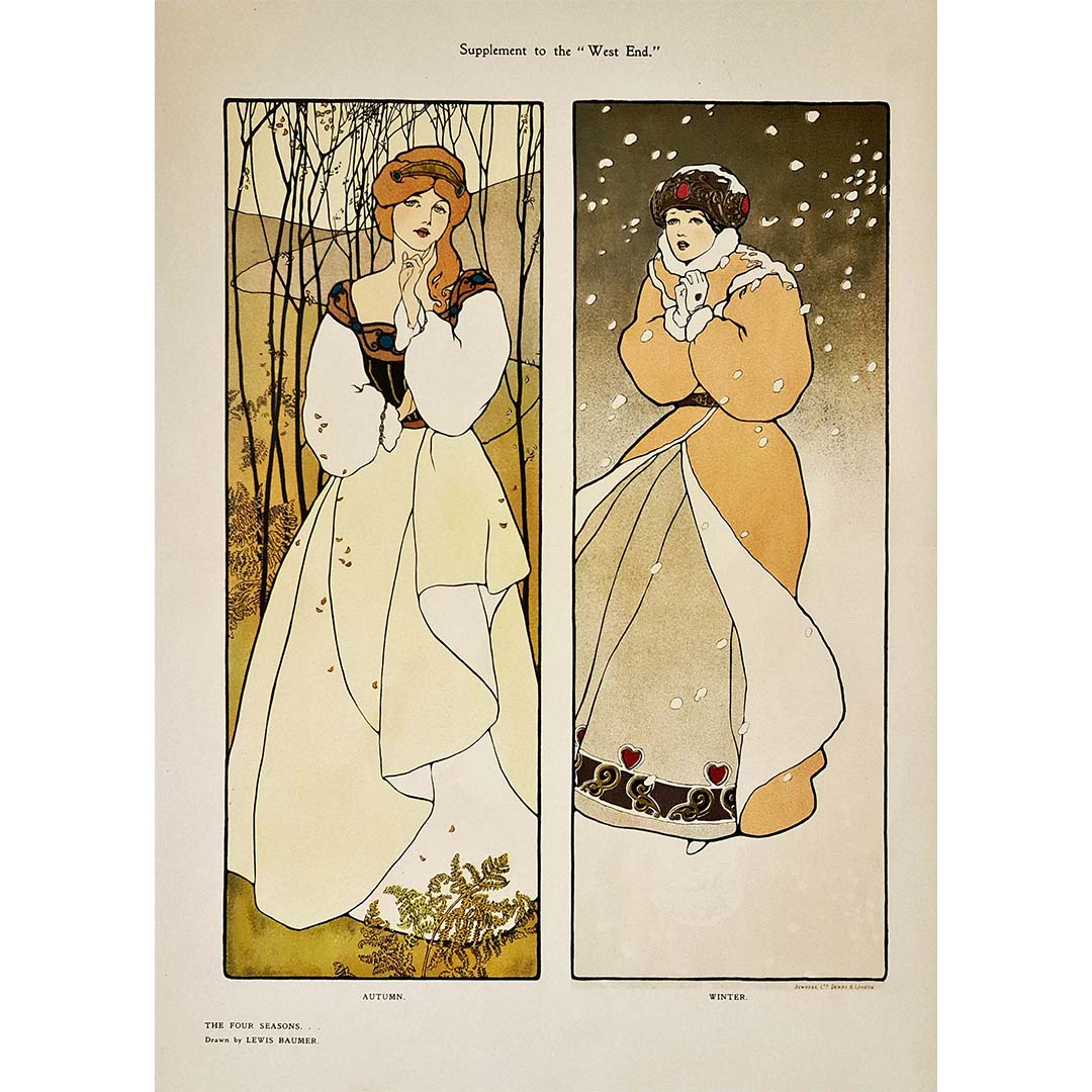 Magnifique affiche de style Art nouveau de Lewis Baumer illustrant les saisons d'automne et d'hiver.