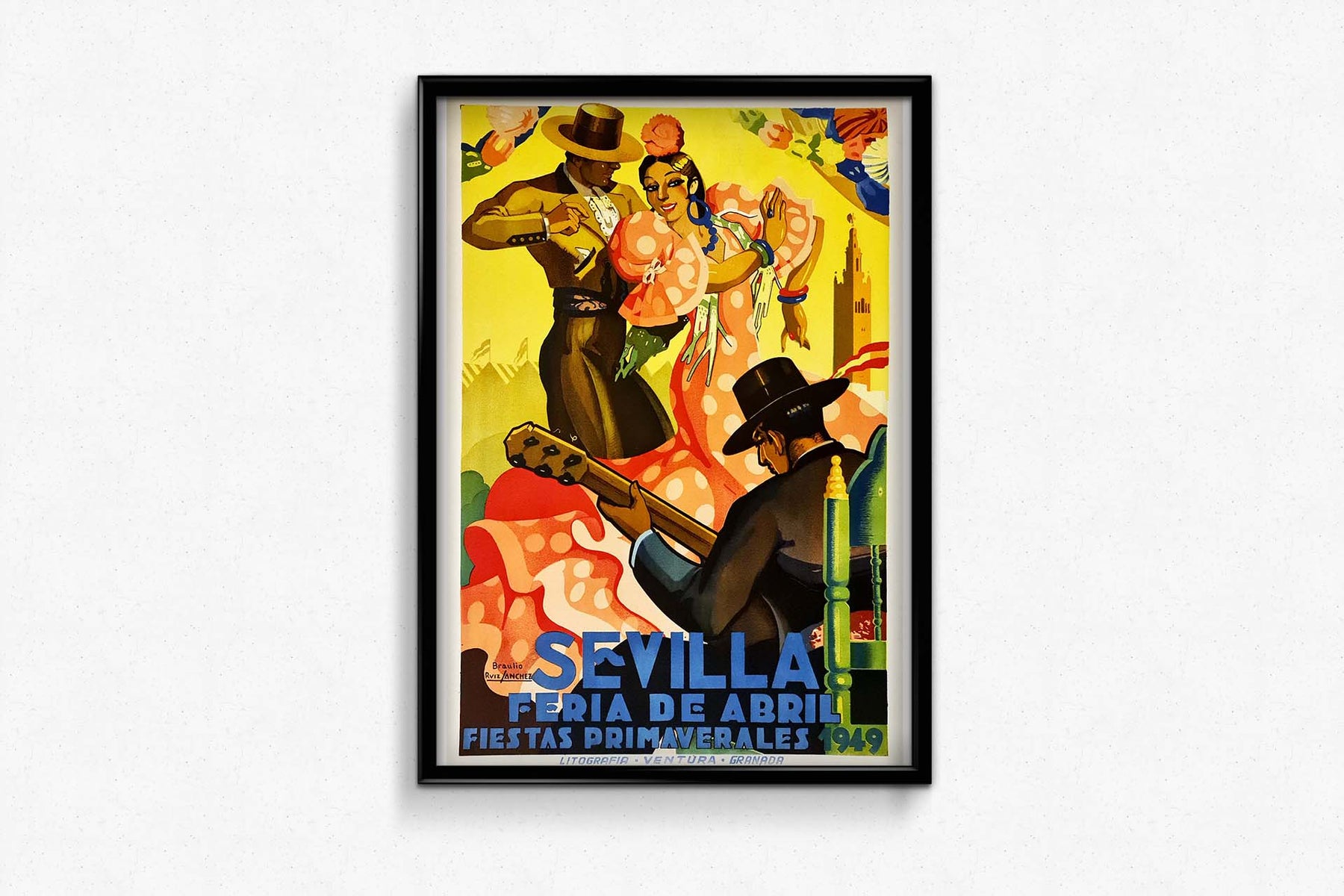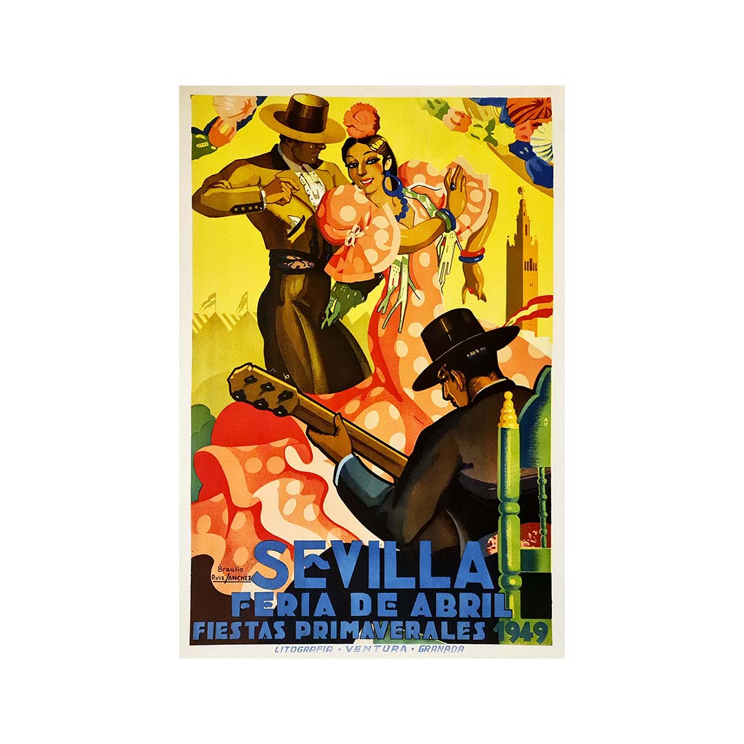 Affiche lithographiée de Braulio Ruiz Sánchez 🇪🇸 (1911-1967) faisant la promotion de la traditionnelle « Feria de Abril » à travers des éléments typiques du folklore local : un guitariste assis, appuyé sur son instrument, et deux danseuses de flamenco. La Giralda se dresse en arrière-plan. Imprimée par Litografía Ventura (Grenade).
