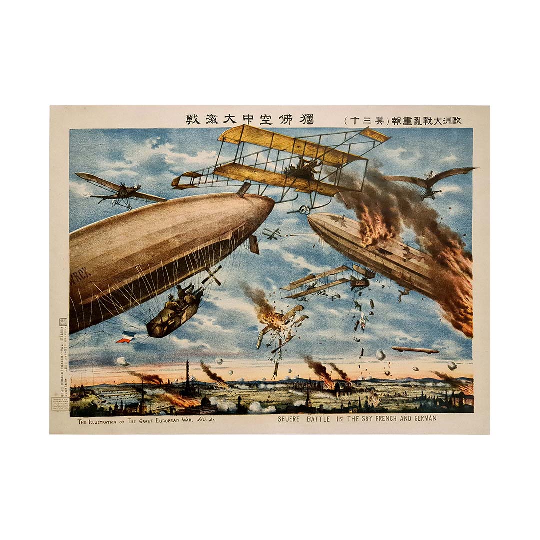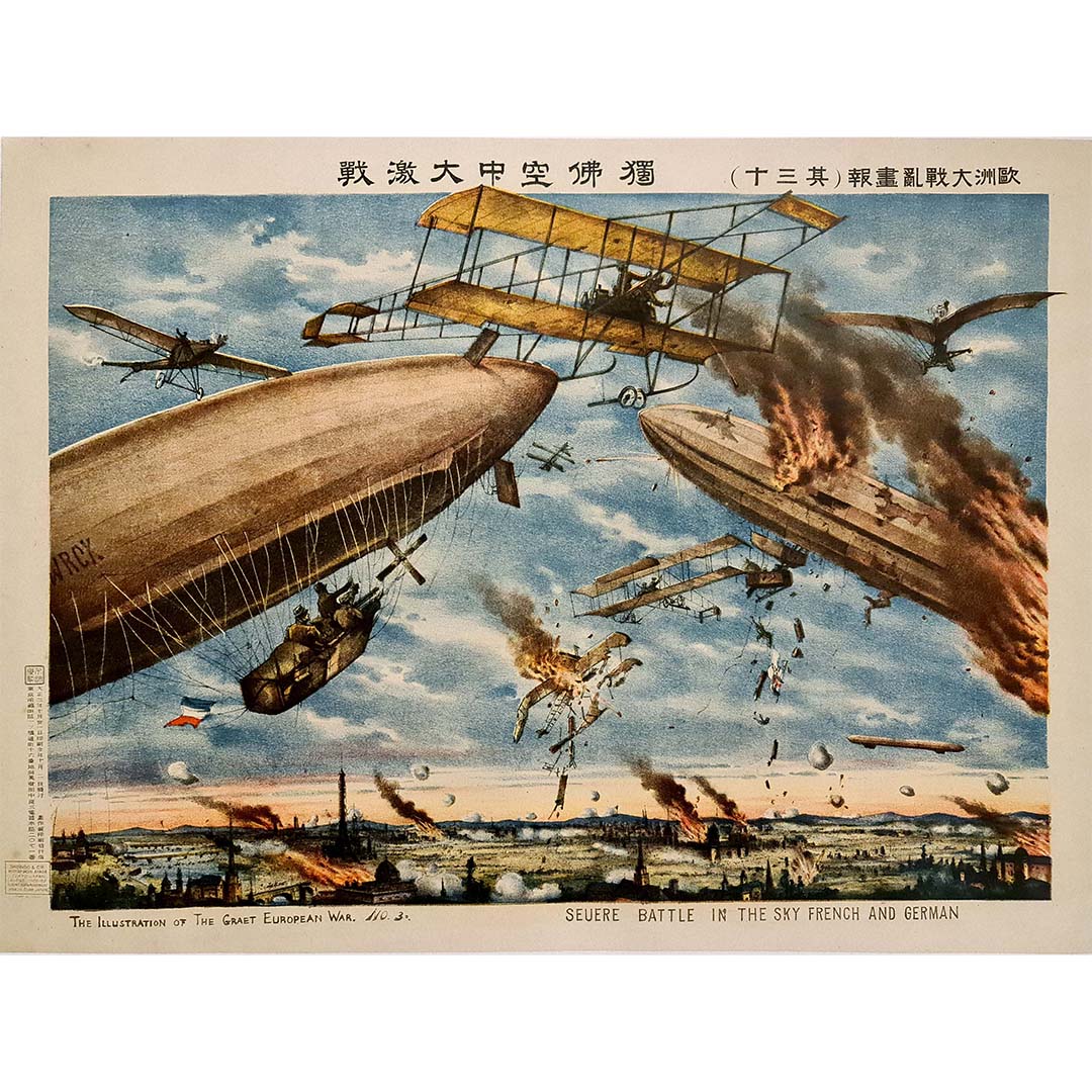 L'affiche originale de 1914, représentant la bataille aérienne de la Süère entre les forces françaises et allemandes, offre un aperçu saisissant de la période tumultueuse de la Première Guerre mondiale. Réalisée en plein conflit et imprimée par Shobido & Co à Tokyo, cette œuvre témoigne de l'intensité et de la gravité des combats aériens durant ce conflit majeur.