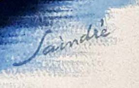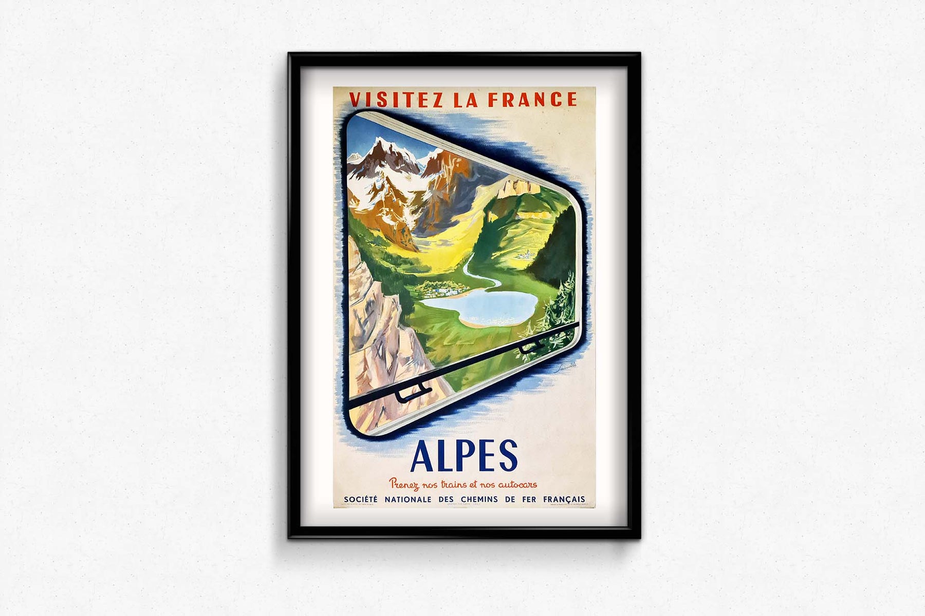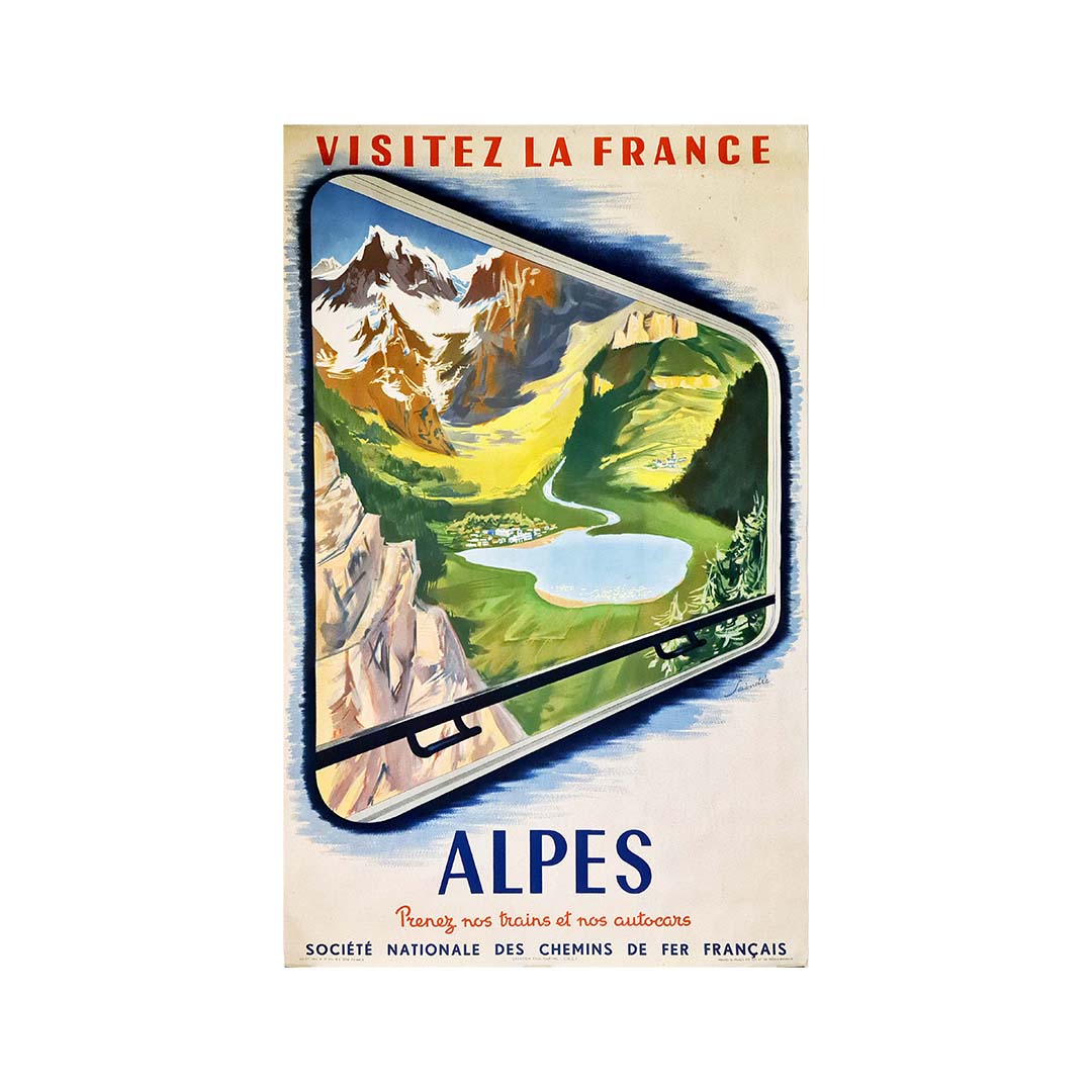 Affiche touristique originale pour la promotion de la SNCF. L'affiche repose sur une mise en scène originale : l'image suggère que le paysage est vu depuis la fenêtre d'un train traversant les Alpes. Saindré parvient à capturer l'essence des Alpes dans une image idéalisée : un cadre montagneux verdoyant et préservé.