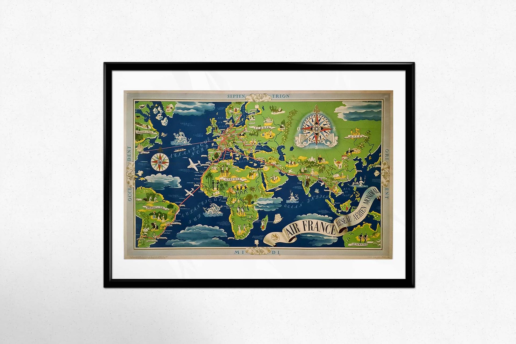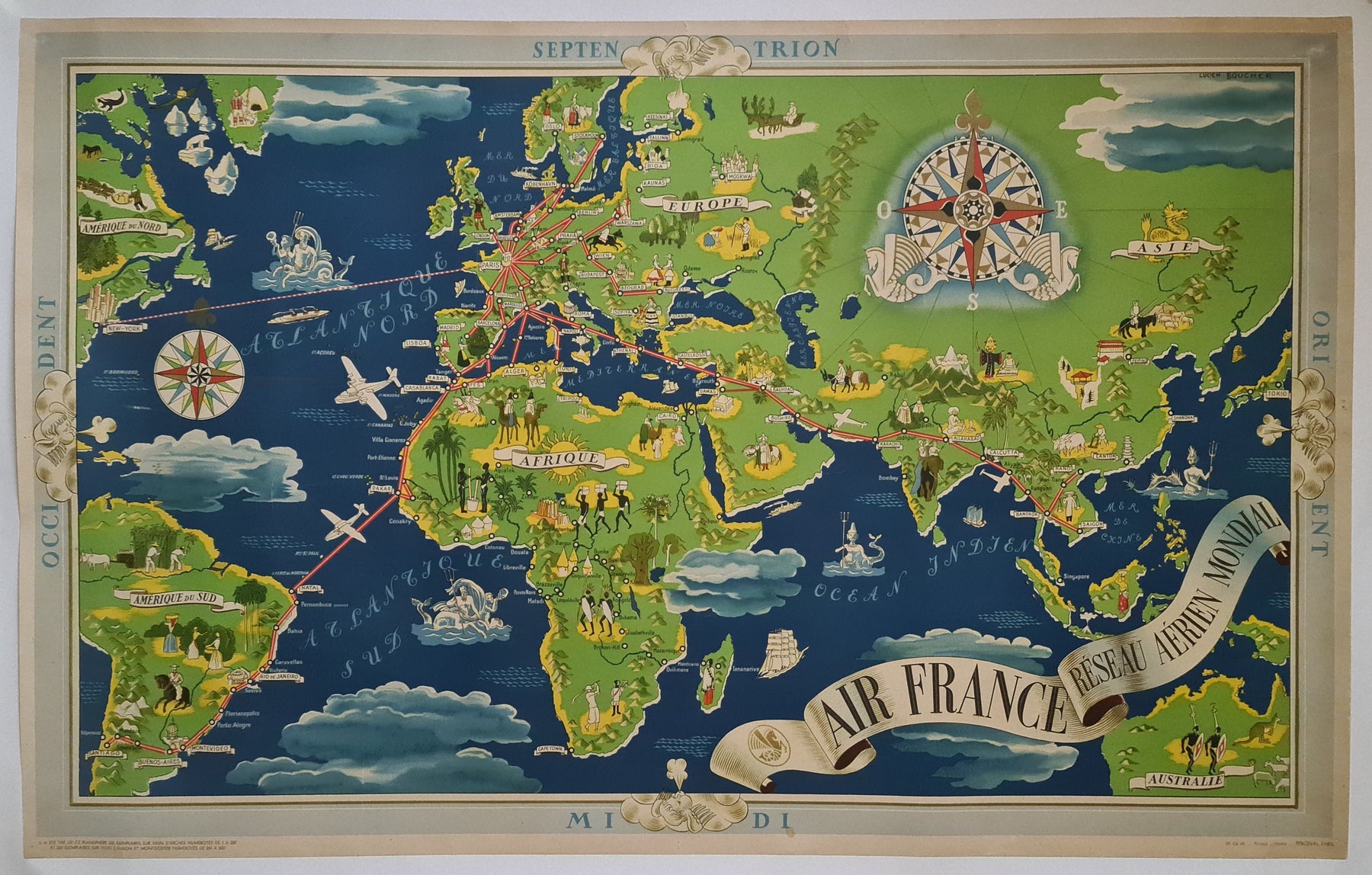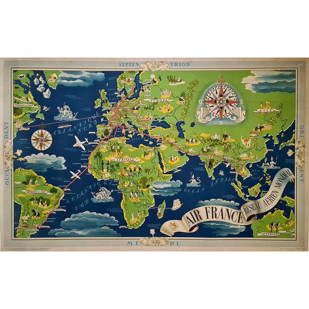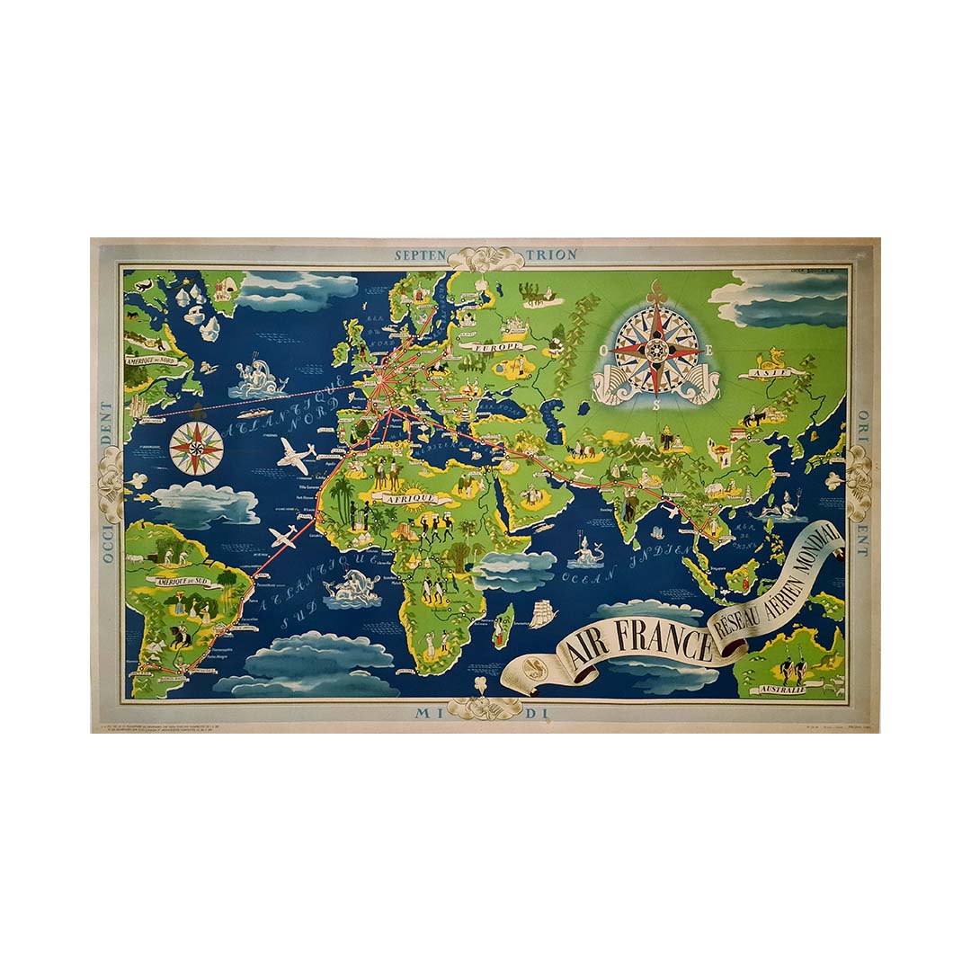 En 1937, Lucien Boucher, illustrateur français de renom, dévoilait son chef-d'œuvre, le « Planisphère Air France Réseau Aérien Mondial ». Cet extraordinaire planisphère n'est pas seulement un outil de navigation, mais une véritable symphonie visuelle qui résume avec élégance le rayonnement mondial et le raffinement d'Air France à une époque charnière de l'aviation.