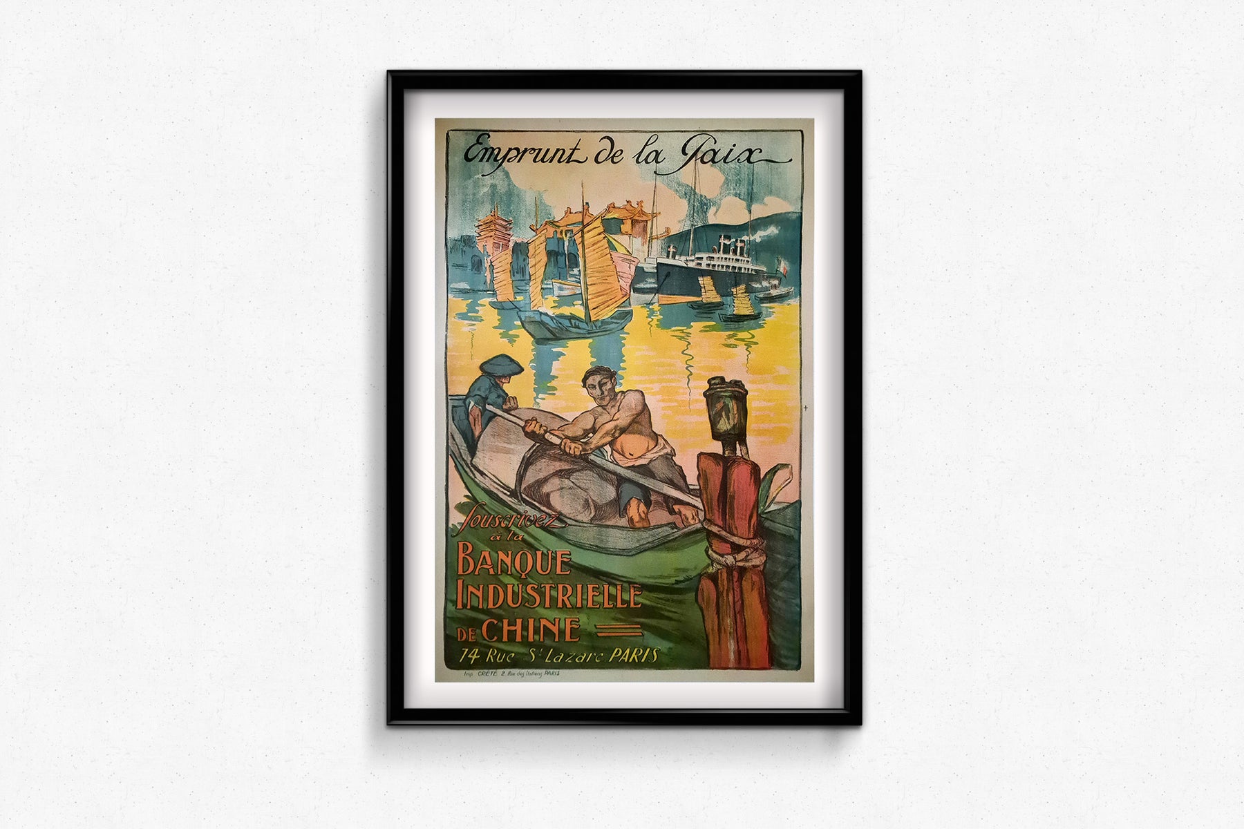 L'affiche « Souscrivez à la Banque Industrielle de Chine – Emprunt de la Paix » offre un témoignage saisissant du contexte financier et géopolitique du début du XXe siècle. Créée vers 1920, elle s'inscrivait dans une campagne plus vaste visant à encourager l'investissement dans le développement économique de la Chine par le biais d'obligations garanties par la France. Elle symbolise le renforcement des liens financiers entre l'Europe et l'Asie après la Première Guerre mondiale, soulignant le rôle de la banque internationale dans la reconstruction et la modernisation économiques.