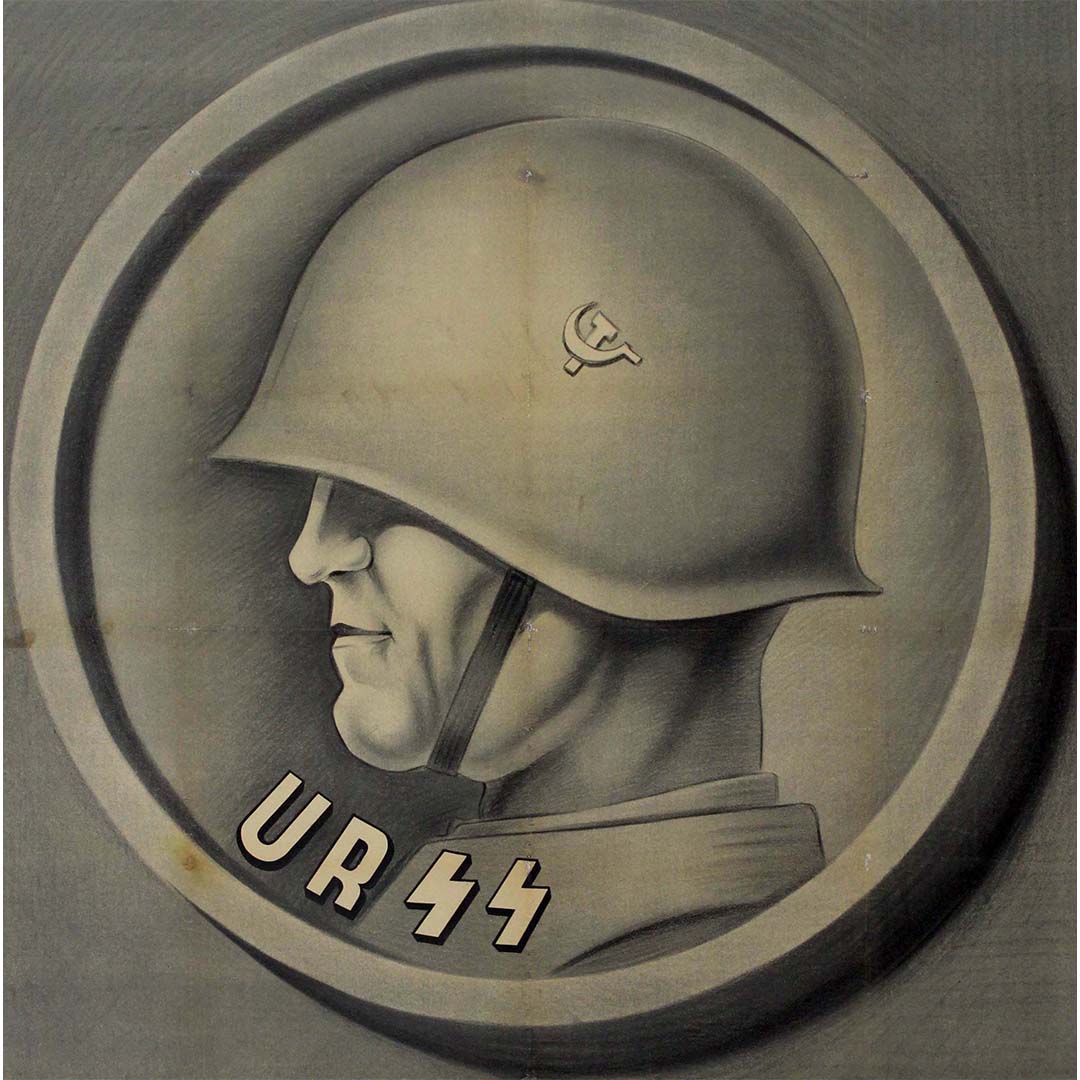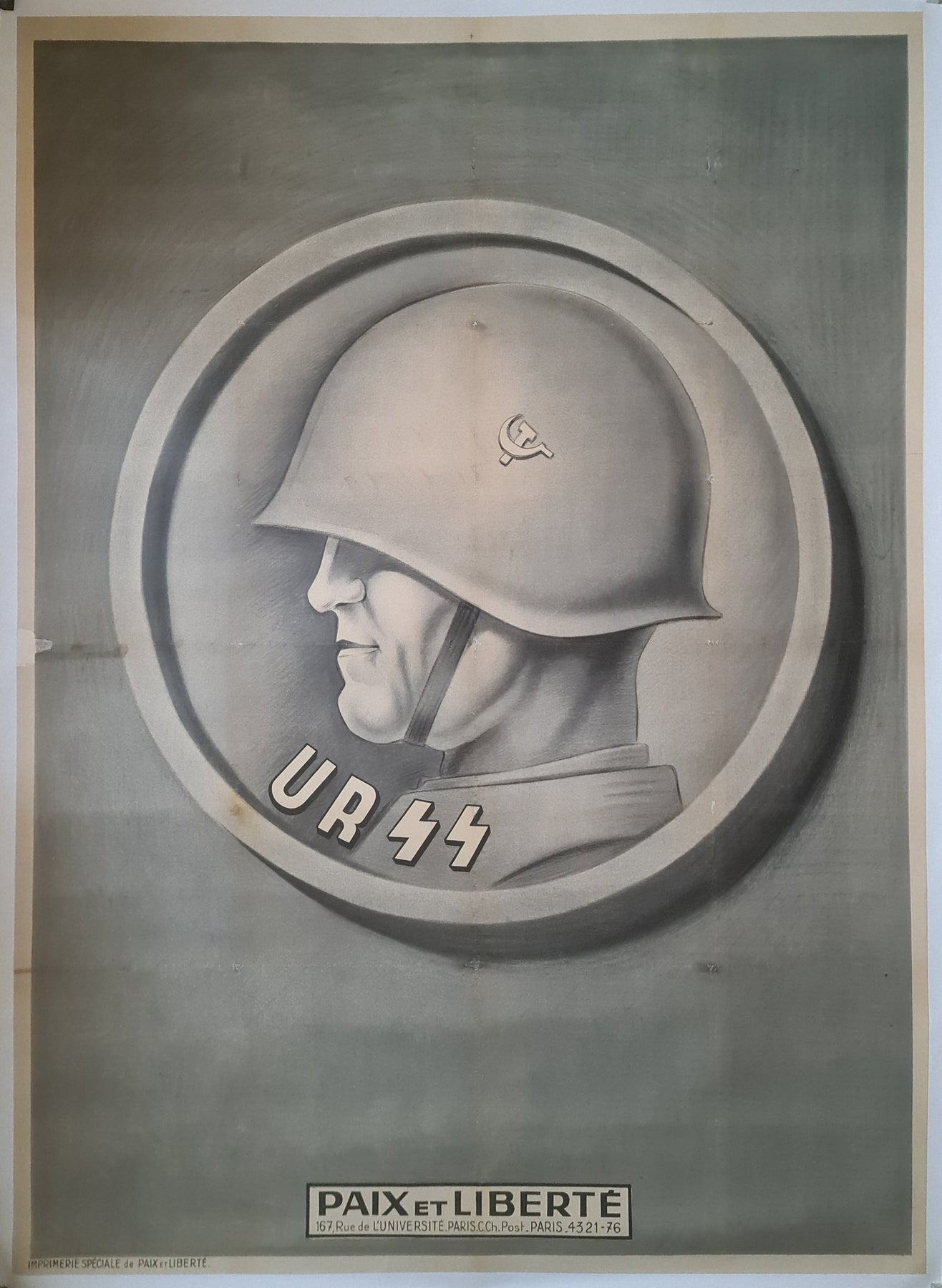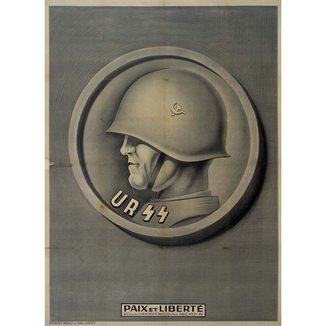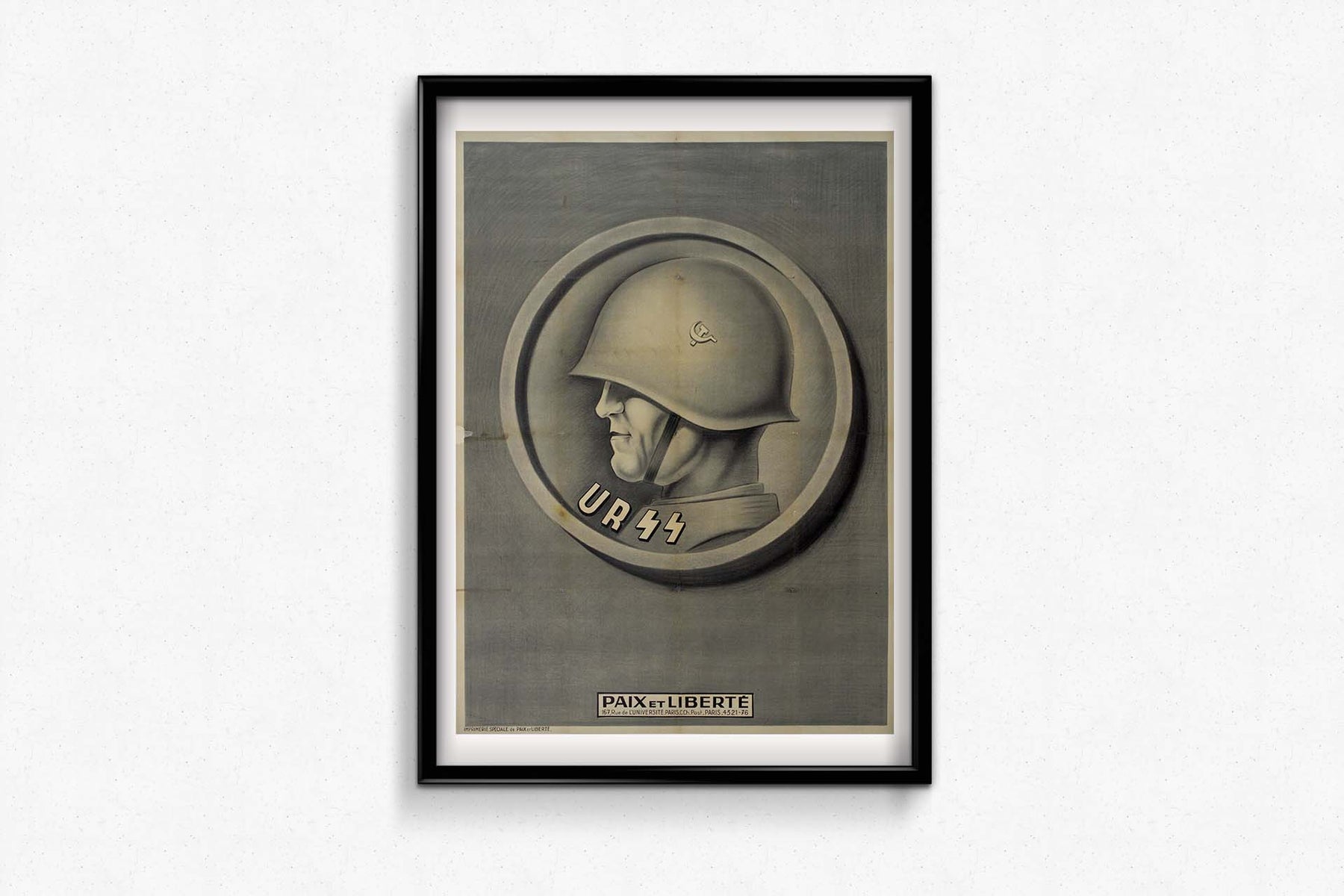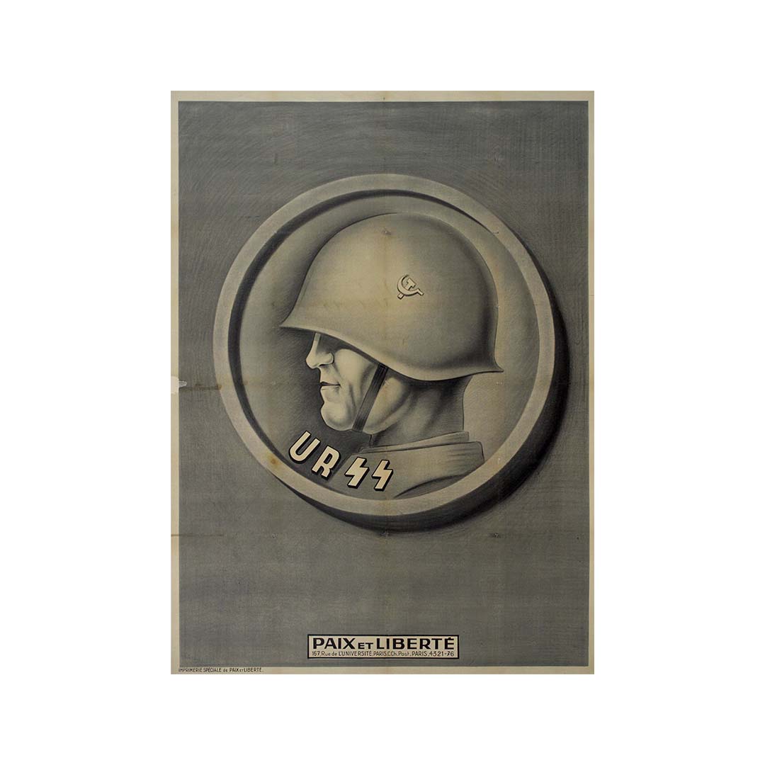 Réalisée vers 1950, l'affiche originale intitulée « Paix et liberté - URSS » présente une juxtaposition visuelle saisissante qui résume la lutte idéologique de la Guerre froide. On y voit un soldat soviétique debout, fier, avec le symbole caractéristique des SS nazis superposé à l'acronyme « URSS », l'abréviation française de l'Union soviétique.