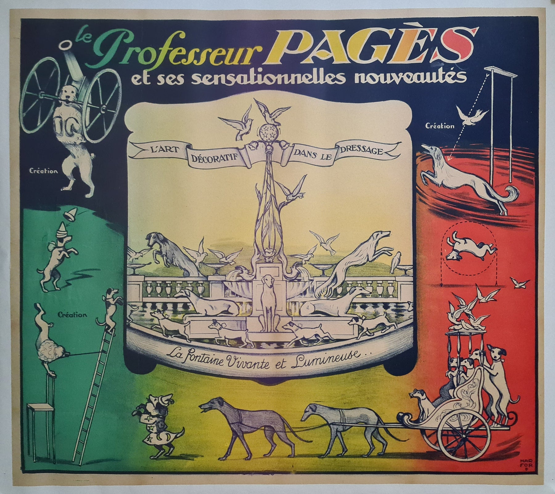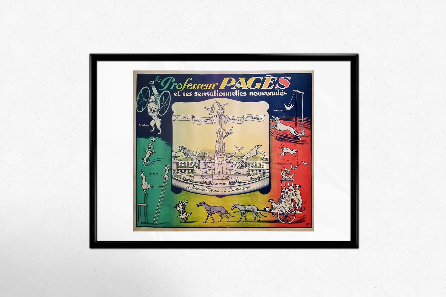 L'affiche originale de Harford, intitulée « Professeur Pagès et ses sensationnelles nouveautés L'art décoratif dans le dressage - La fontaine vivante et lumineuse », dévoile un spectacle captivant d'art décoratif et d'innovation. Créée pour promouvoir les exploits remarquables du professeur Pagès, l'affiche offre un aperçu d'un monde où l'expression artistique rencontre l'attrait fascinant de la performance.
