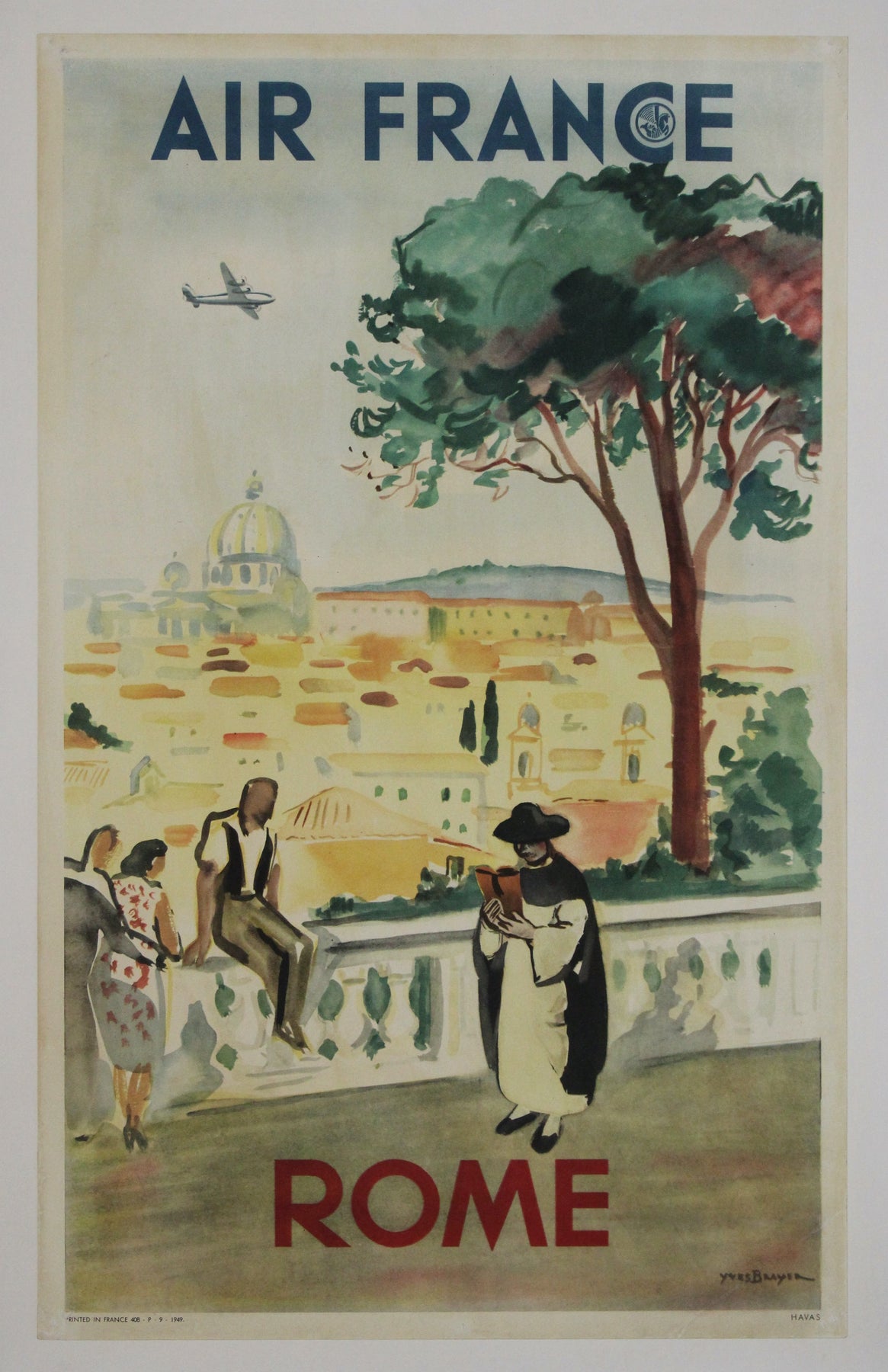 L'affiche de voyage originale de 1949, signée Yves Brayer et promouvant les vols Air France vers Rome, incarne à merveille le charme et l'élégance des voyages du milieu du XXe siècle. Créée par le célèbre artiste français Yves Brayer, cette affiche est à la fois une œuvre d'art saisissante et une invitation irrésistible à découvrir la ville intemporelle de Rome.