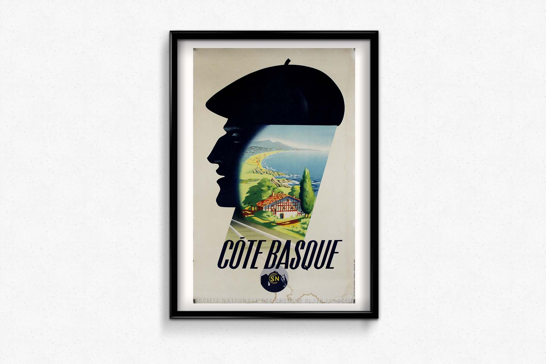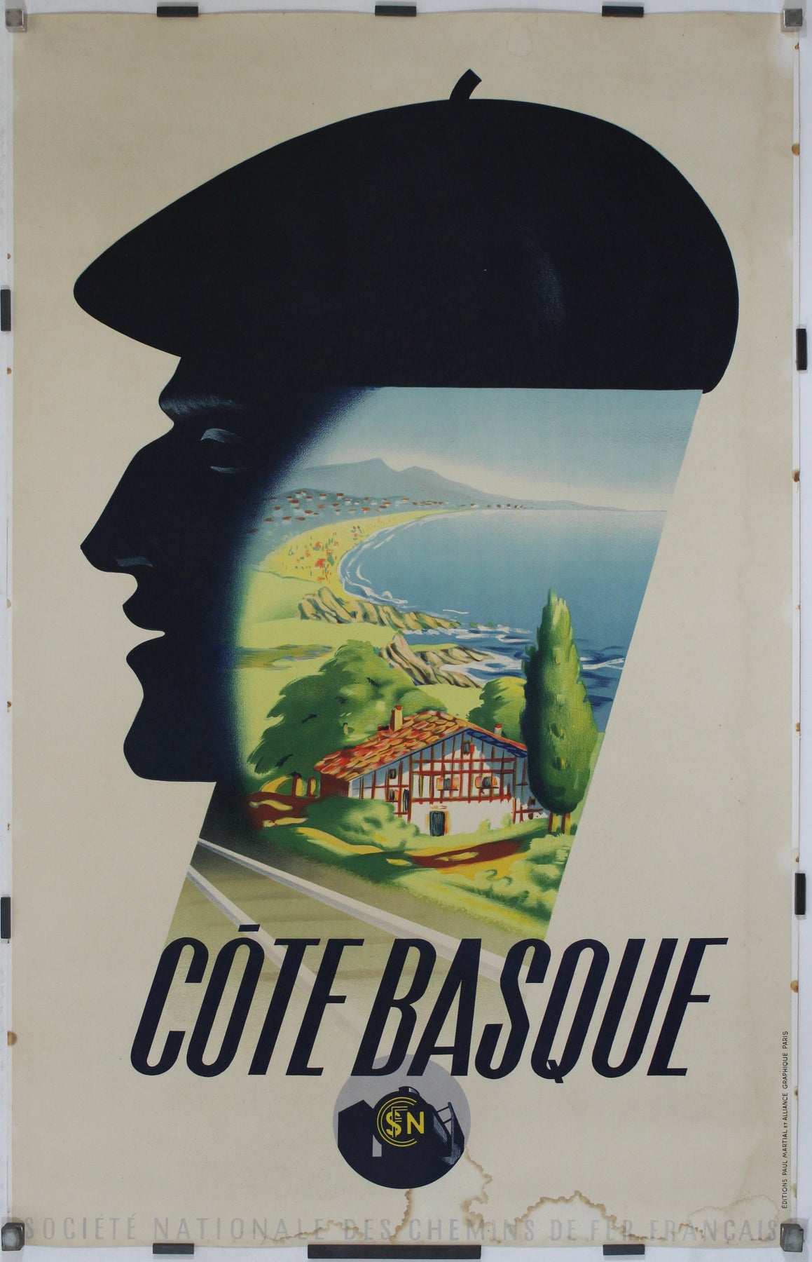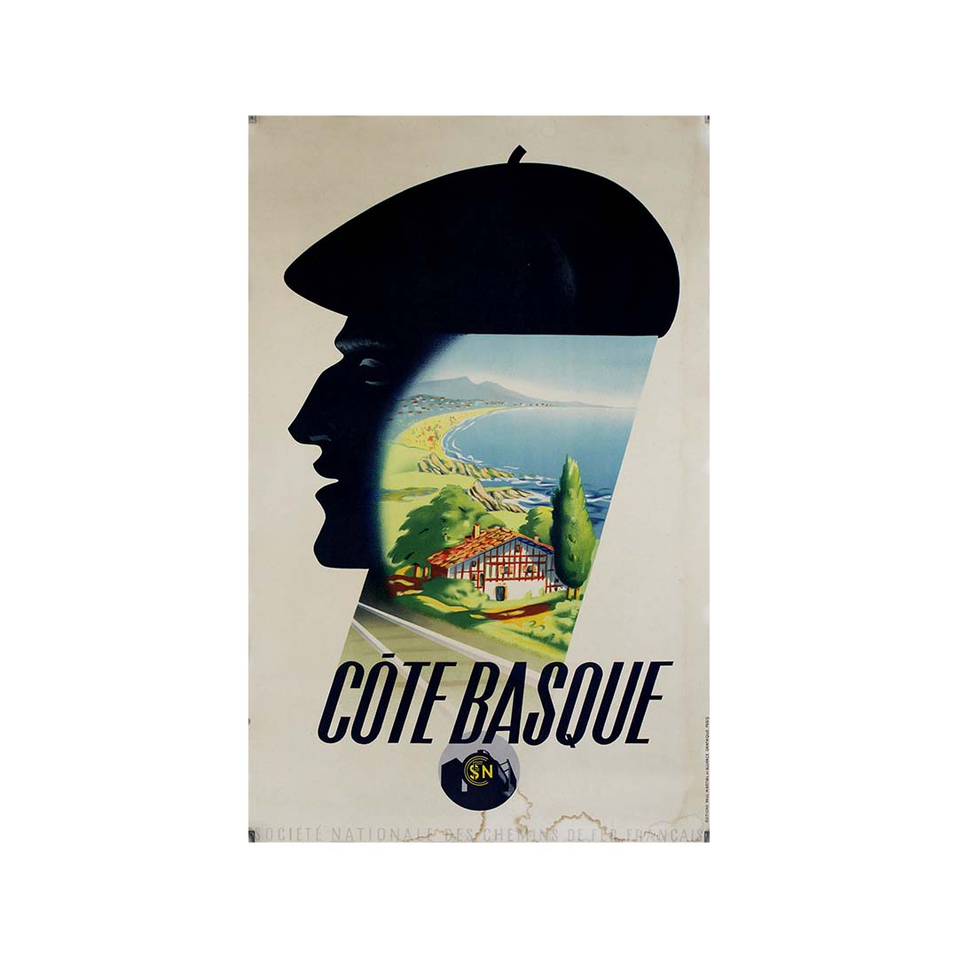 L'affiche touristique originale créée par Roland Hugon pour la SNCF, promouvant le tourisme sur la Côte Basque, capture le charme et l'attrait de cette destination côtière pittoresque. Réalisée avec une grande finesse artistique et une palette de couleurs éclatantes, l'affiche invite les voyageurs à découvrir la beauté du littoral basque.