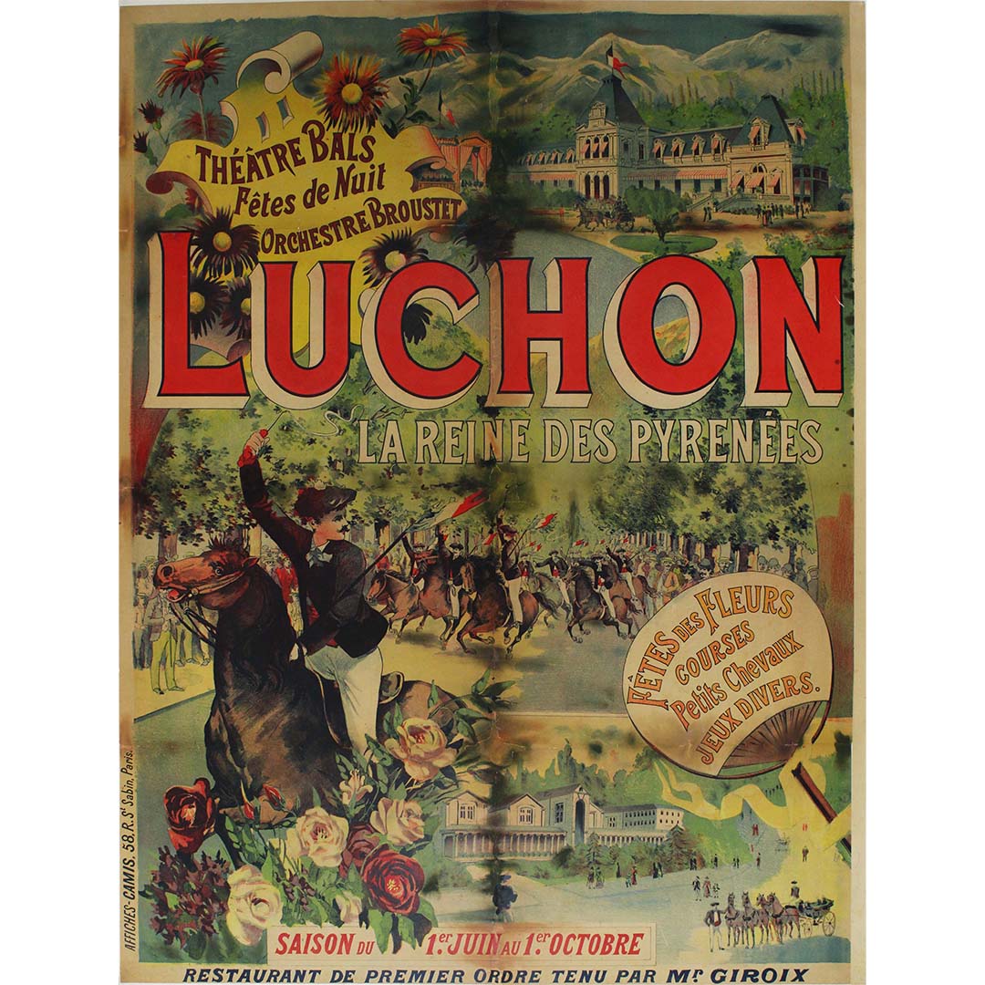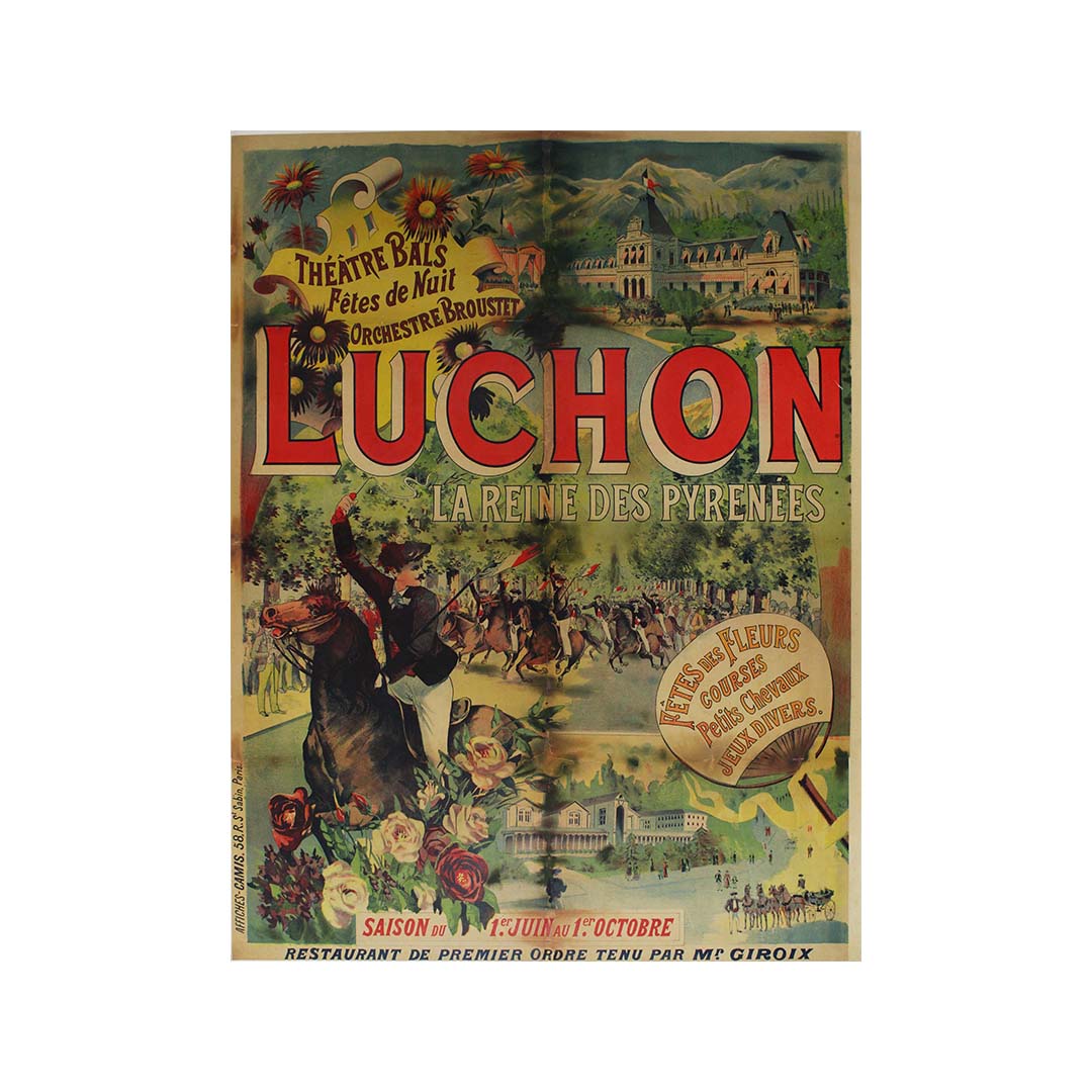L'affiche de voyage originale intitulée "Luchon la reine de Pyrénées - Fêtes des fleurs Théâtre Bals Fêtes de nuit Orchestre Broustet" est un aperçu captivant du charme de Luchon, souvent saluée comme la "reine des Pyrénées". Cette affiche, faisant la promotion des différentes festivités et attractions de Luchon, résume l'esprit de loisirs et de divertissement qui caractérisait la Belle Époque.