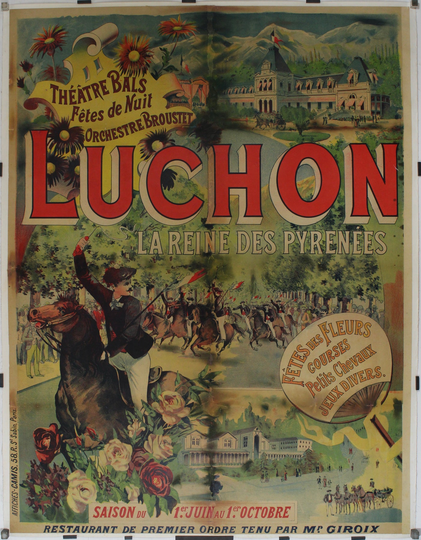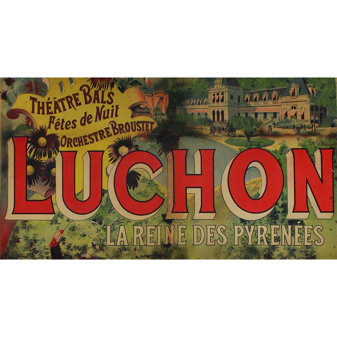 Luchon, ville thermale réputée nichée au cœur des Pyrénées, était une destination prisée des touristes en quête de détente et de ressourcement. L'affiche met en avant la diversité des activités proposées aux visiteurs : fêtes des fleurs, spectacles de théâtre, bals et soirées animées par le célèbre orchestre Broustet.