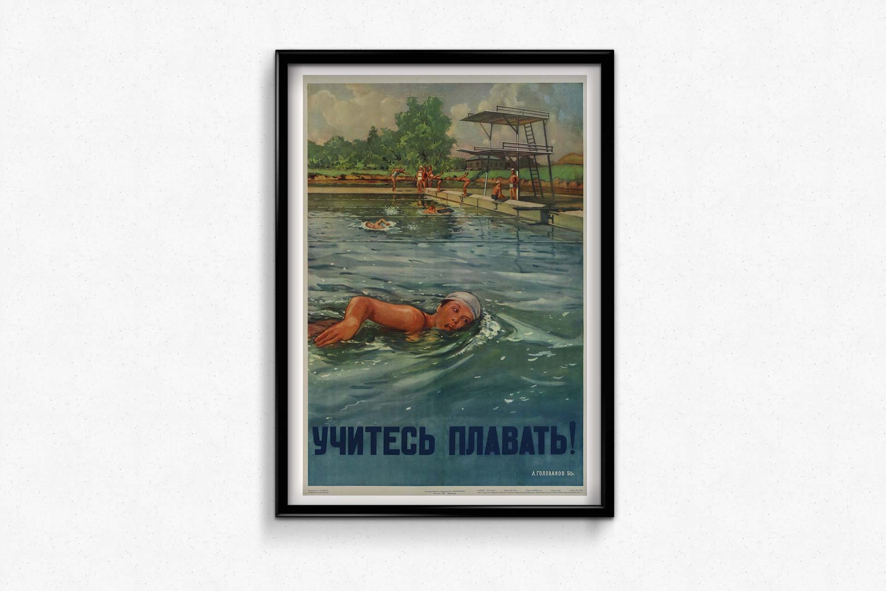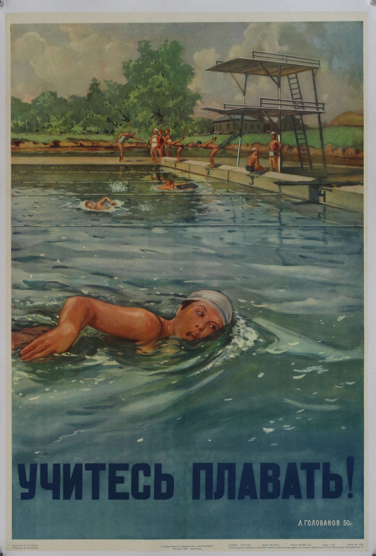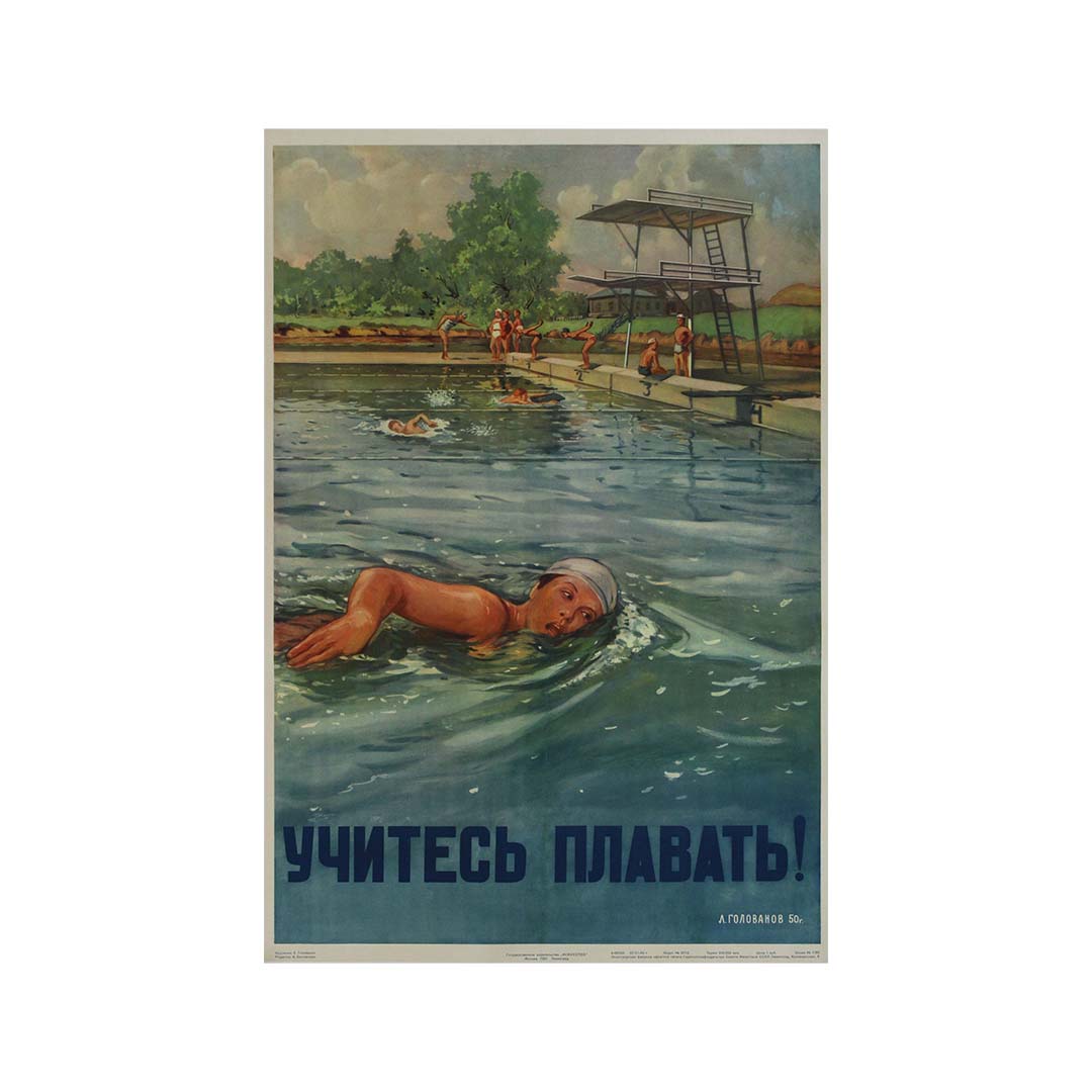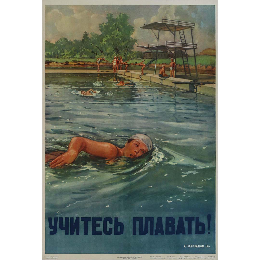 Créée en 1951 par l'artiste soviétique L. Golovanov, l'affiche de propagande originale « Apprenez à nager ! » est une œuvre marquante destinée à promouvoir l'apprentissage de la natation et la sécurité aquatique en Union soviétique. Cette affiche s'inscrit dans le cadre d'une campagne soviétique plus vaste visant à encourager la forme physique et la préparation de la population.