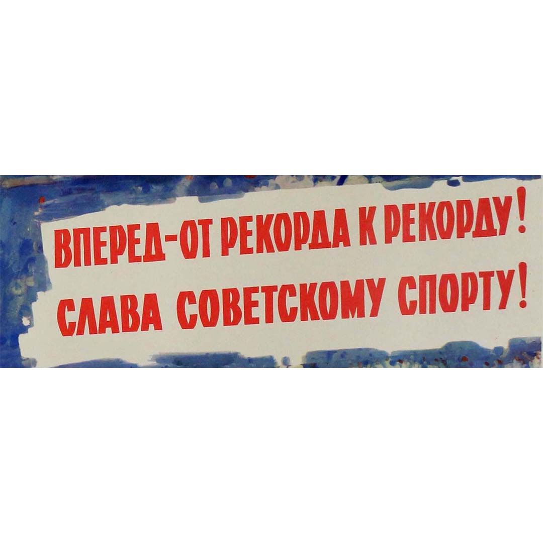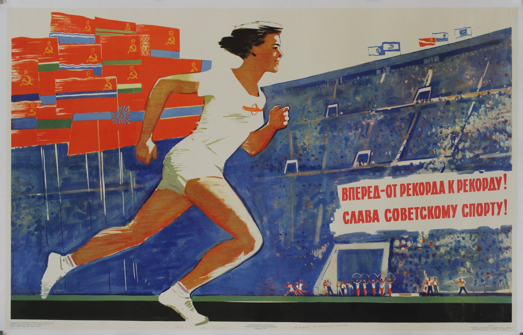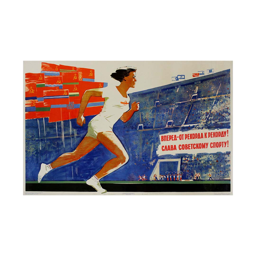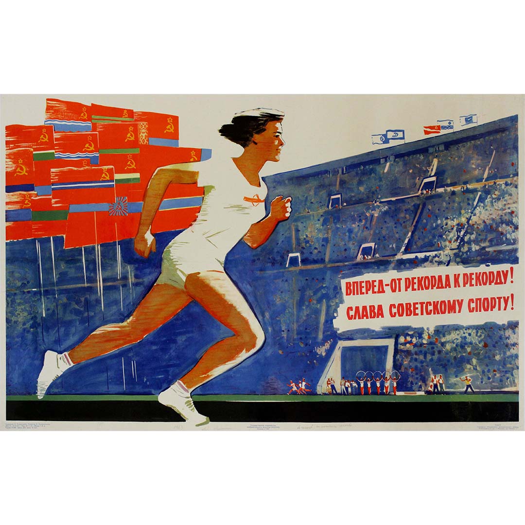 L'affiche de propagande soviétique originale créée par Vladimirov en 1963, intitulée « De record en nouveaux records ! Gloire aux sports soviétiques ! », illustre l'importance accordée par l'Union soviétique à la forme physique, à l'athlétisme et à la performance sportive comme moyen de promouvoir la fierté nationale et la supériorité idéologique.