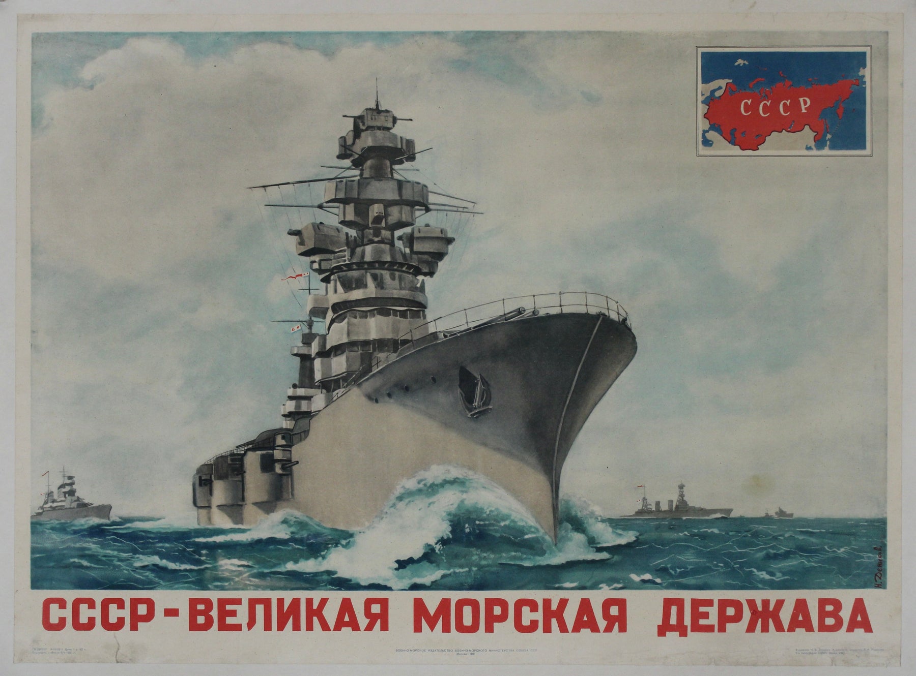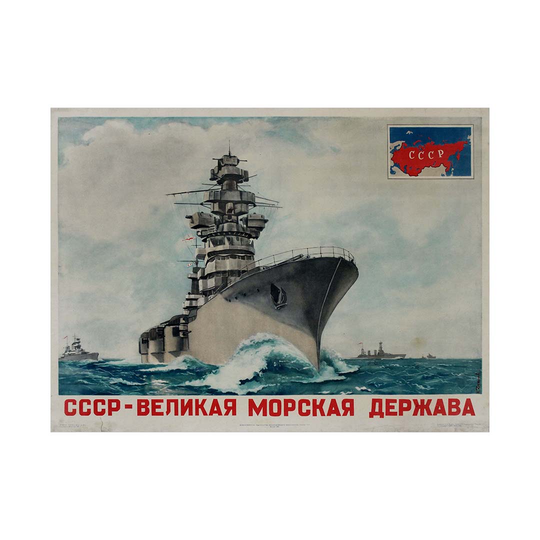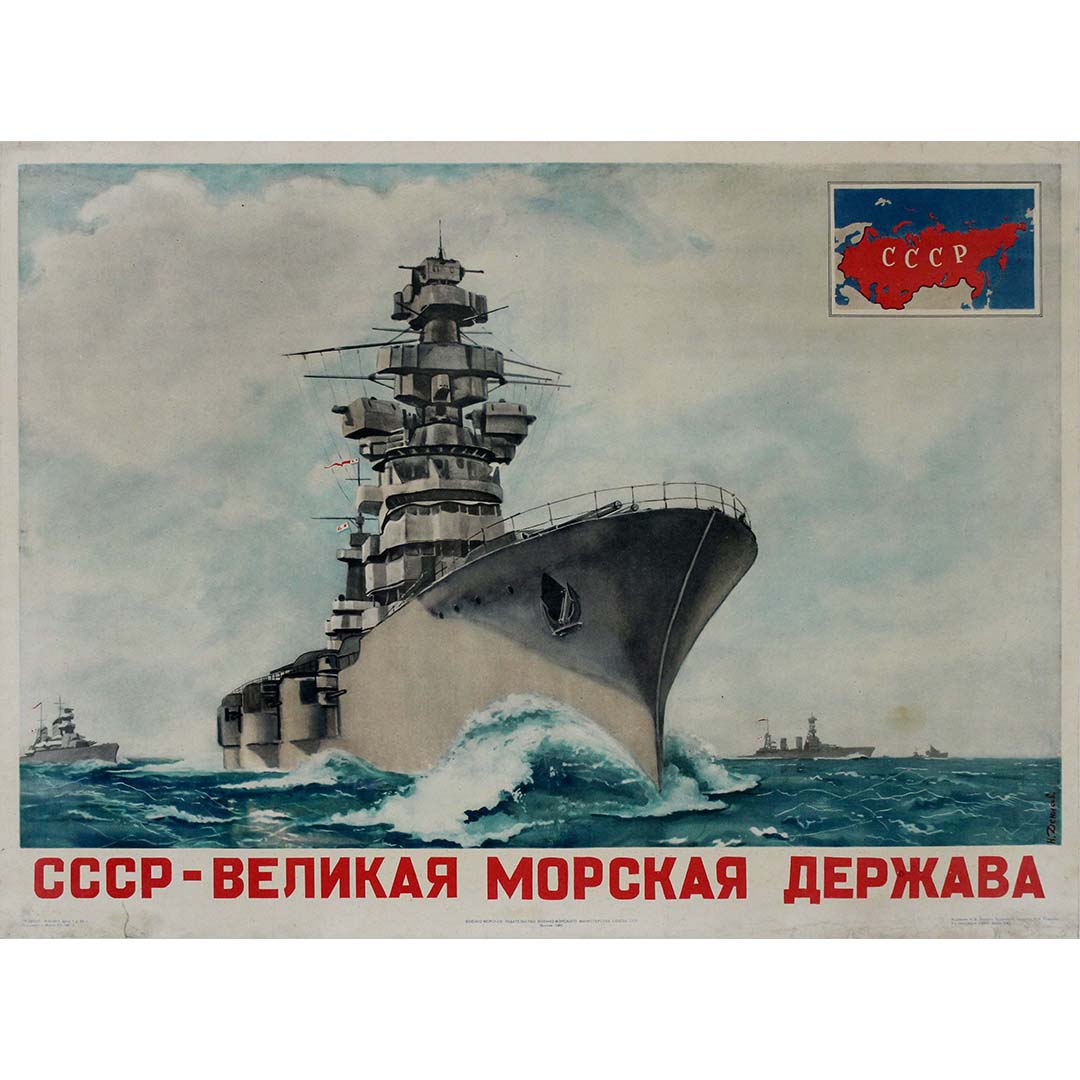 L'affiche de propagande soviétique originale créée par N. Denisov en 1951, intitulée « URSS Grande puissance maritime », témoigne des aspirations de l'Union soviétique à s'affirmer comme une force navale redoutable sur la scène mondiale au début de la guerre froide.
