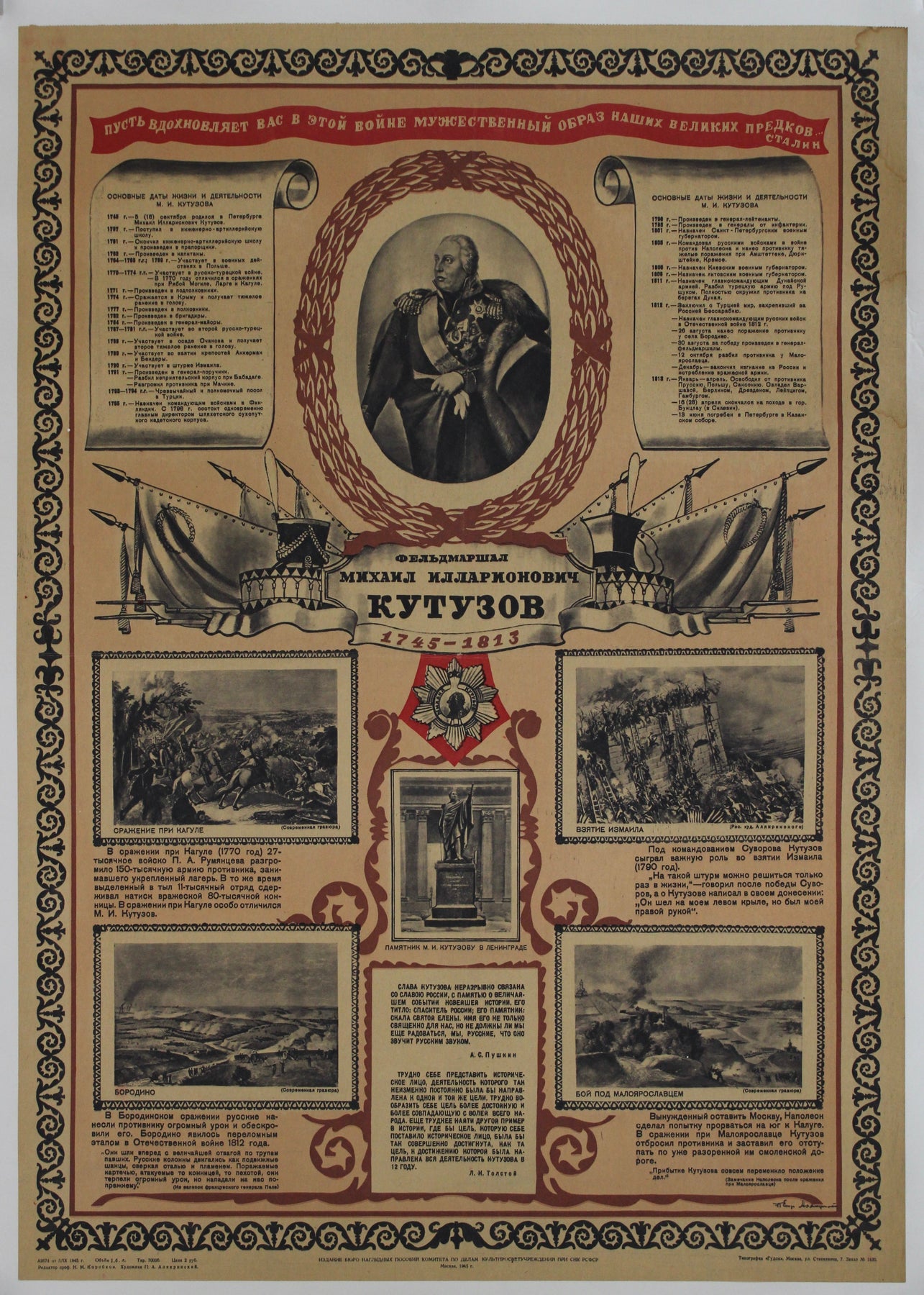 Créée en pleine Seconde Guerre mondiale, cette affiche témoigne avec émotion de l'héritage de Koutouzov et de l'esprit indomptable du peuple russe face à l'adversité. Représentant Koutouzov dans une pose digne et résolue, l'œuvre incarne le courage, la détermination et la résilience qui ont marqué sa carrière militaire.