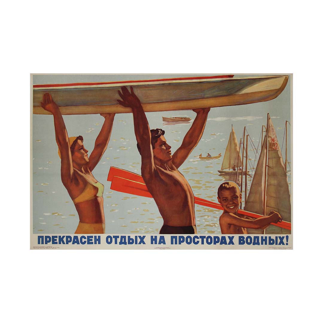 L'affiche de propagande soviétique originale de 1960, créée par Kalensky & Kalenskaya, met en avant avec audace les activités nautiques. À l'instar de nombreuses autres affiches de l'époque, elle visait à renforcer les idéologies et les valeurs soviétiques tout en encourageant la pratique d'activités récréatives par les citoyens.
