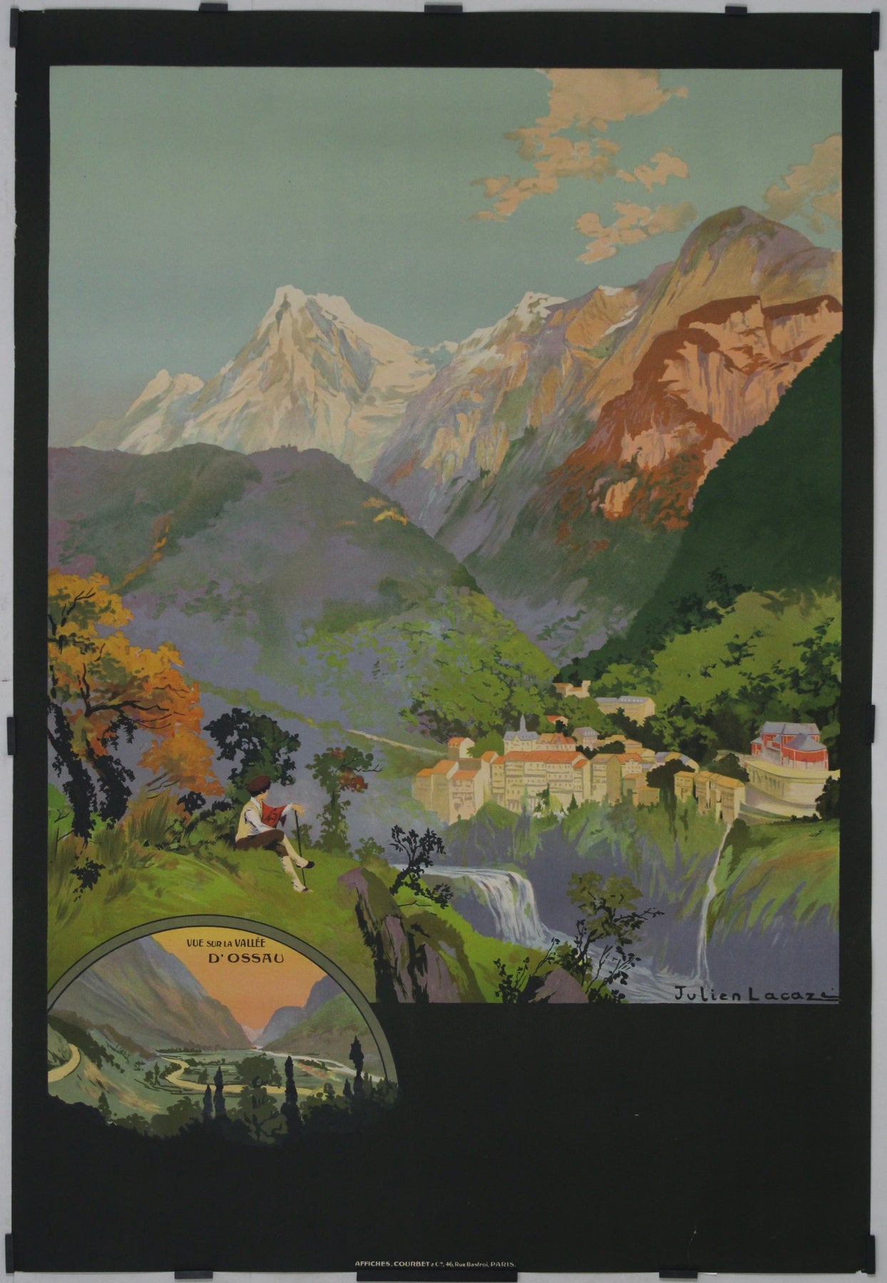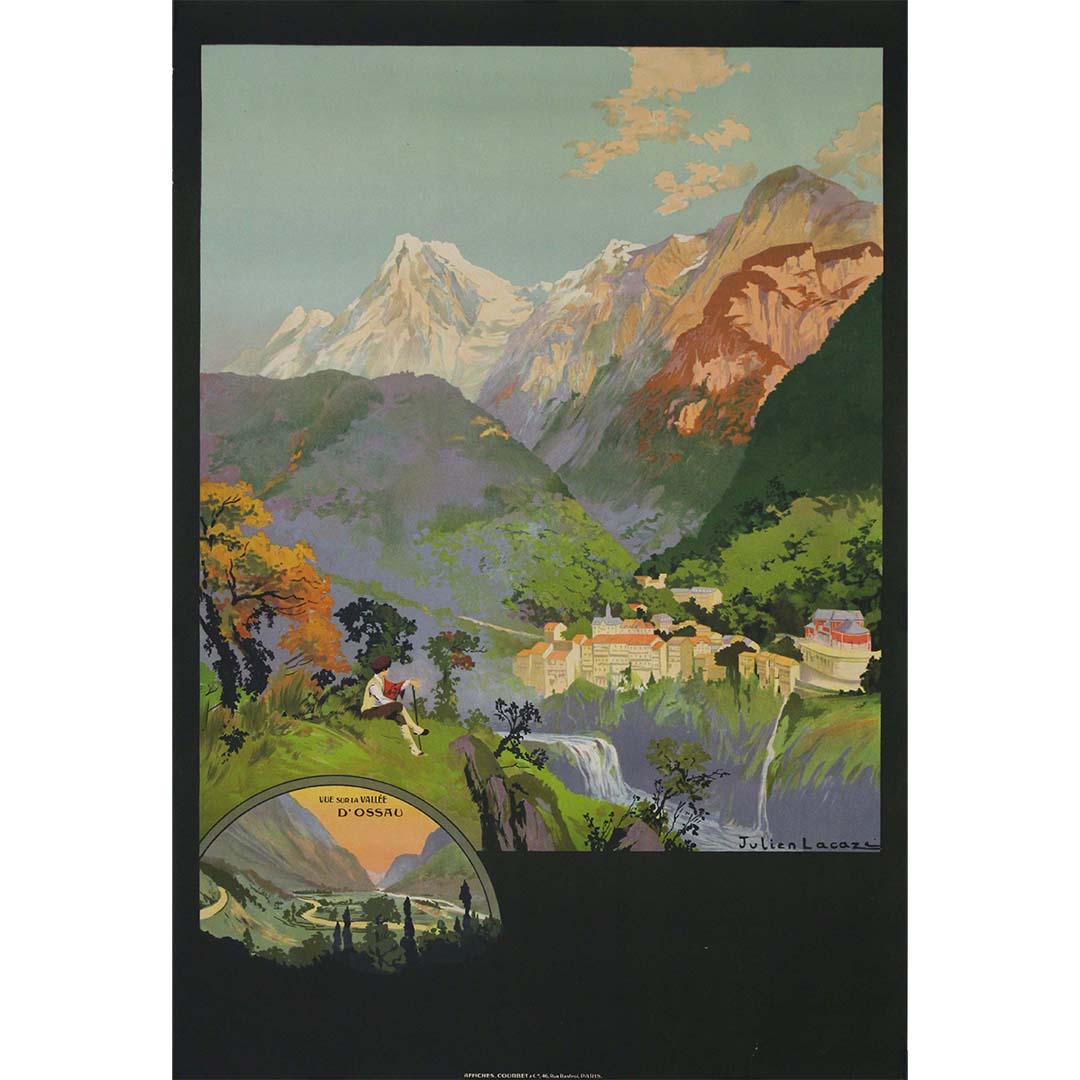 Réalisée vers 1925 par le talentueux artiste Julien Lacaze, l'affiche touristique originale intitulée « Eaux Bonnes Avant la Lettre » exhale le charme et l'attrait de cette destination pittoresque. Commandée par le Chemin de Fer du Midi et d'Orléans, elle fait la promotion des Eaux Bonnes, station thermale renommée des Pyrénées françaises.