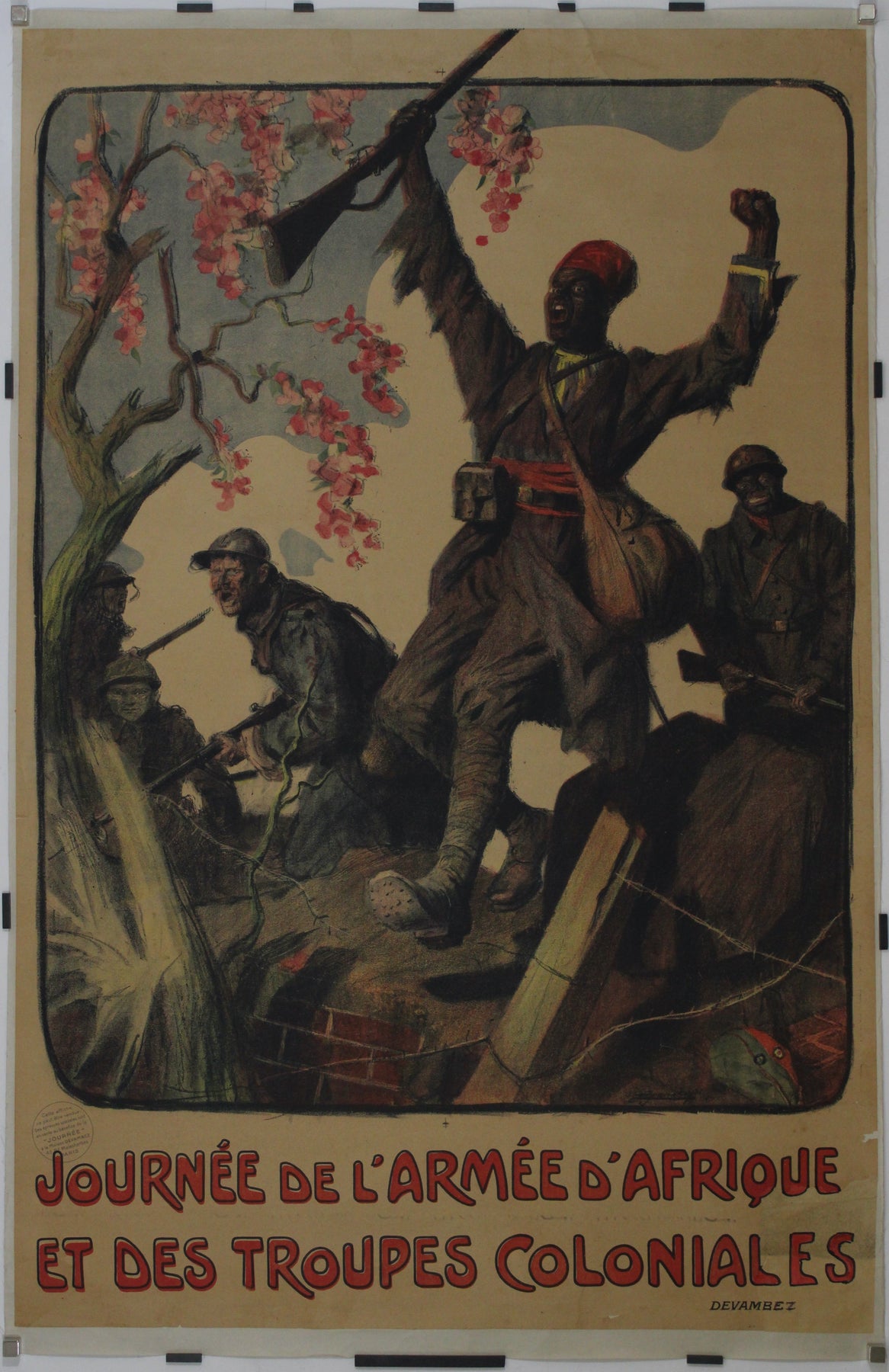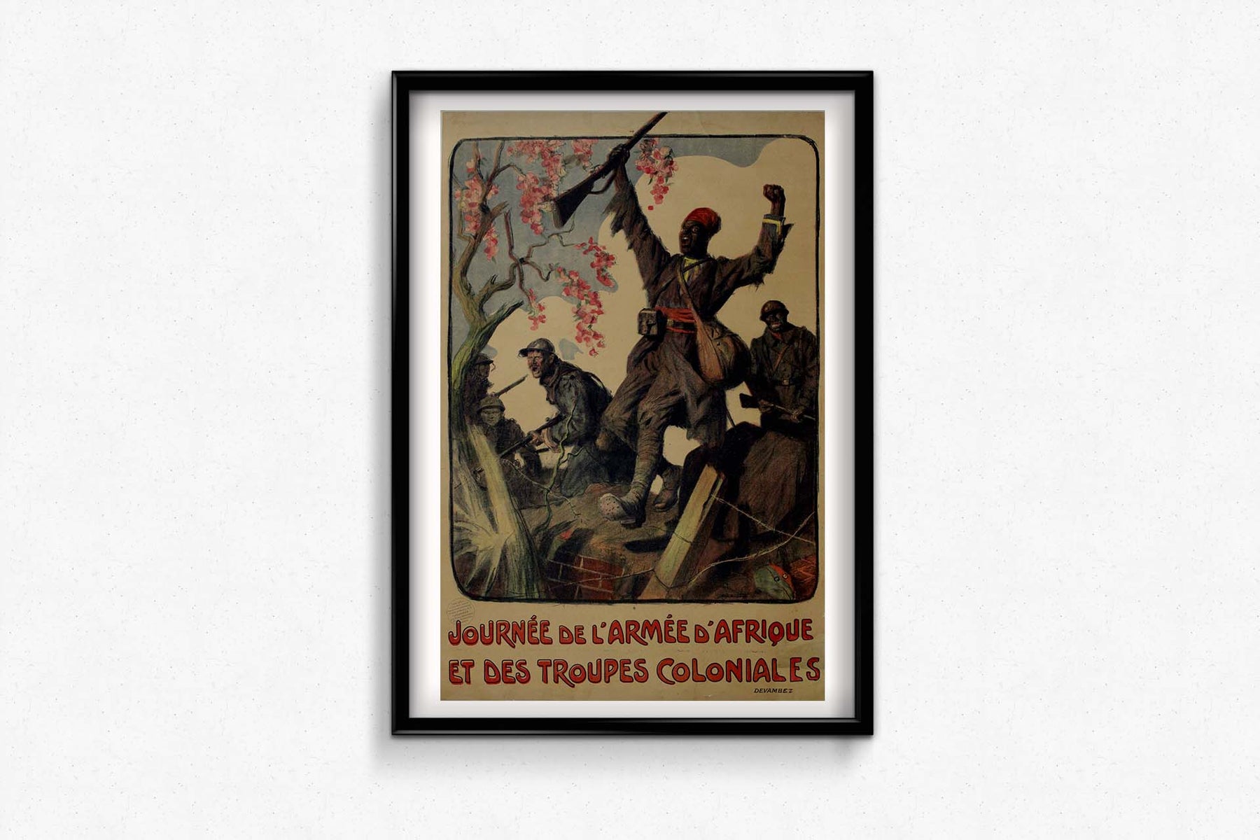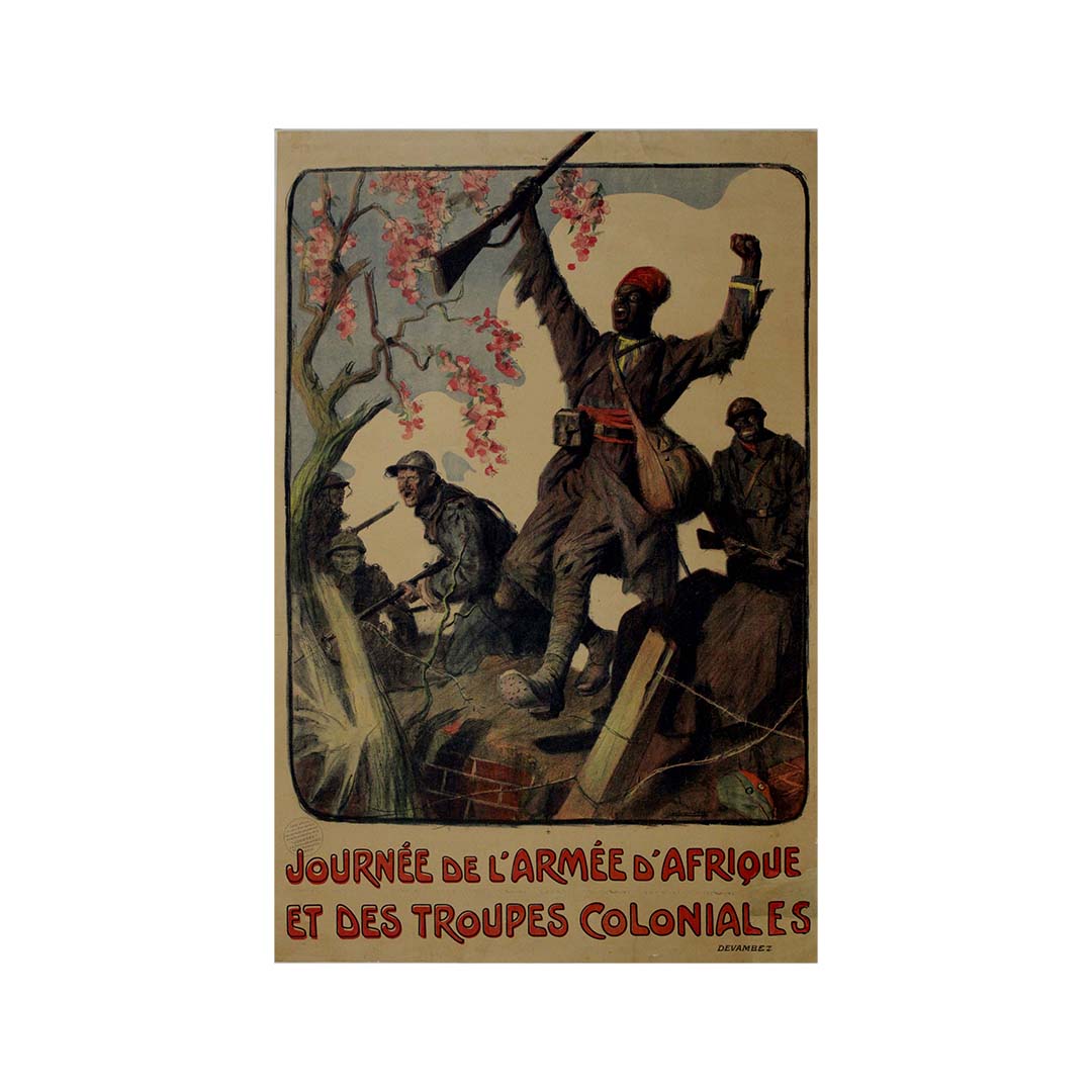 La figure centrale de l'affiche est un soldat résolu, emblème de la force et de la résilience collectives de l'Armée d'Afrique et des troupes coloniales. Vêtu de son uniforme militaire, sa posture respire la détermination, reflétant l'engagement indéfectible de ces forces face aux défis de la guerre.