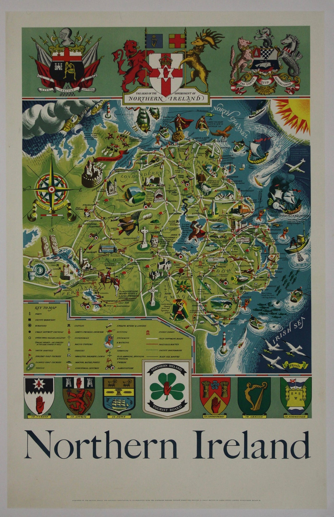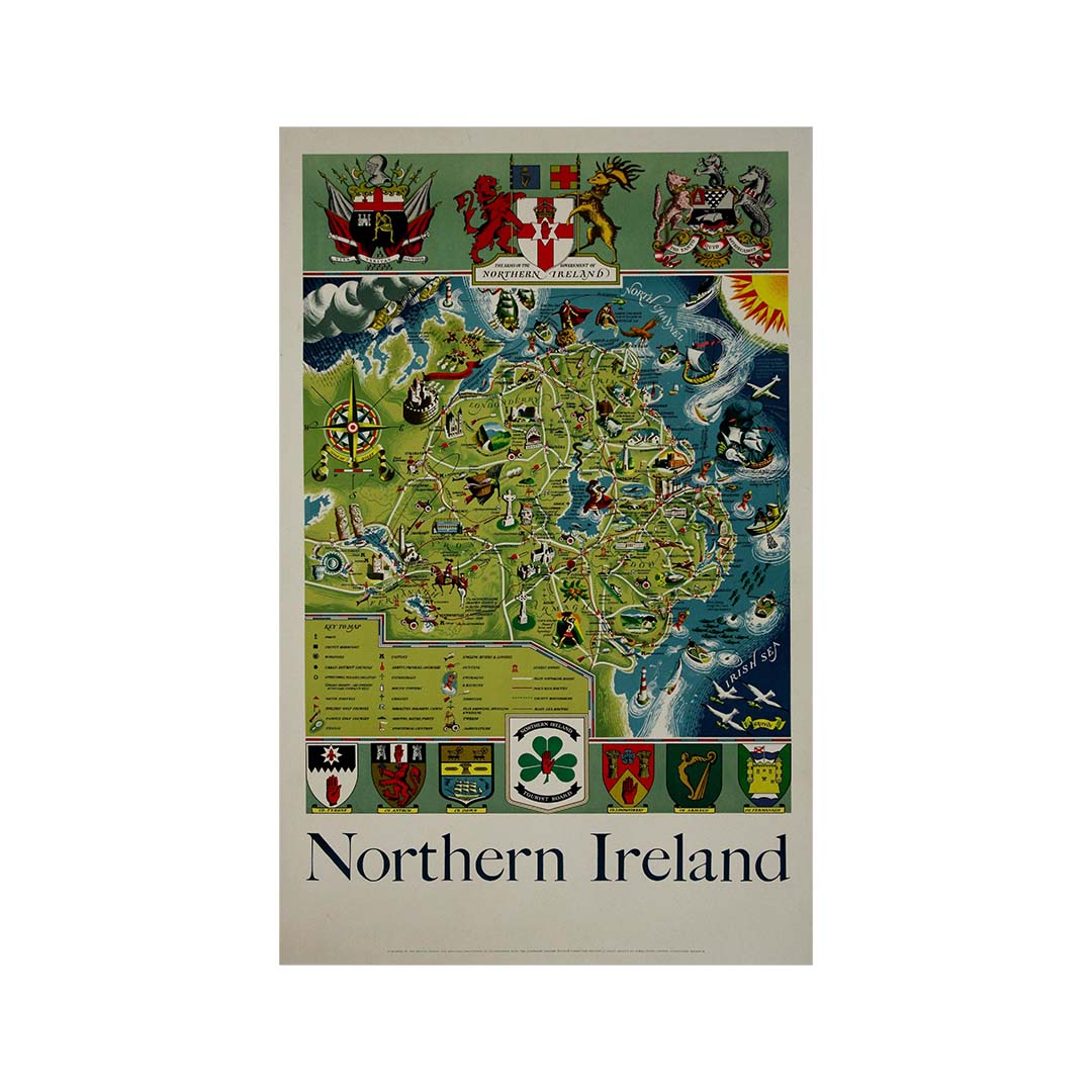 La carte de l'Irlande du Nord de Griffin (1955) se distingue par sa représentation saisissante de la géographie et des particularités de la région. Imprimée par James Upton Limited à Birmingham, cette carte n'est pas qu'un simple outil de navigation ; c'est un document historique qui nous invite à explorer les paysages, les villes et les détails de l'Irlande du Nord tels qu'ils étaient au milieu du XXe siècle.