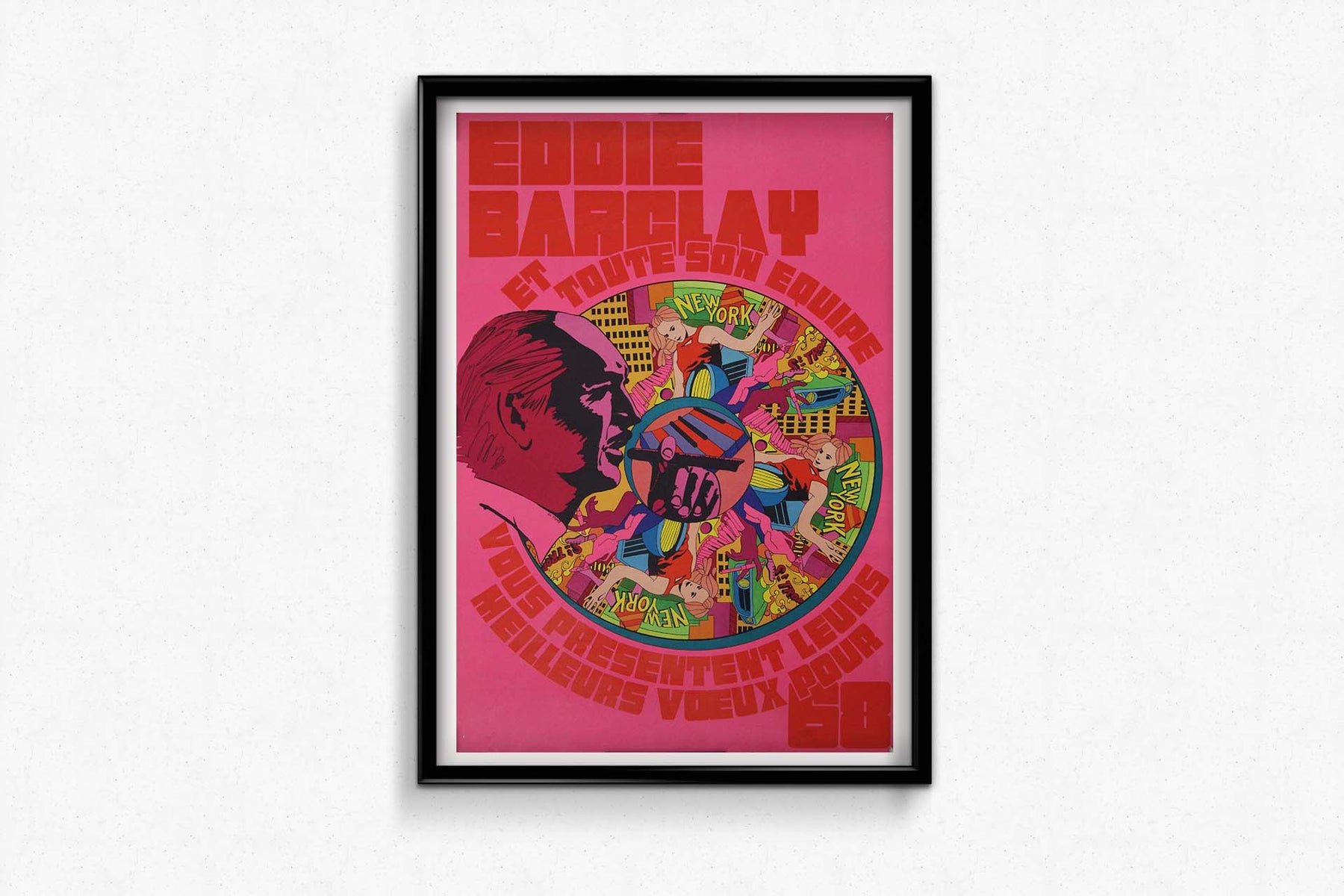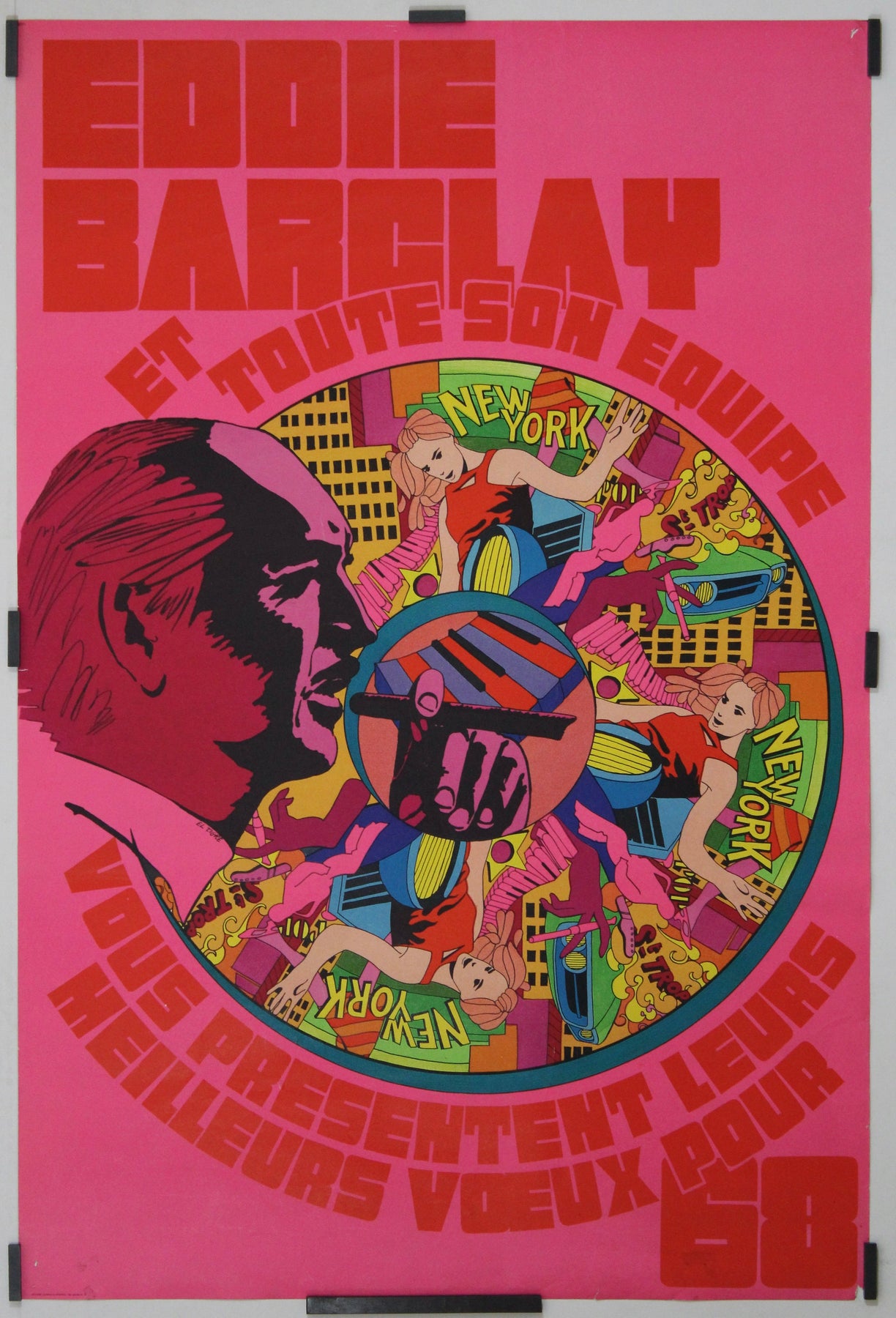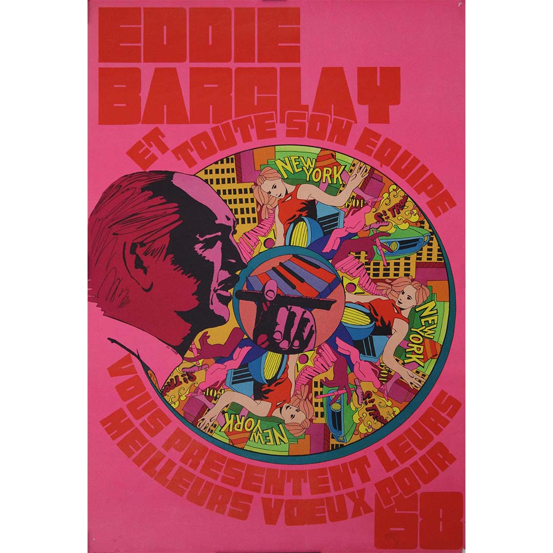 Prix régulier €1.000,00L'affiche originale de 1968, réalisée par El Tigre pour « Eddie Barclay et toute son équipe vous présentent leurs meilleurs vœux - New York Saint-Tropez », est une œuvre emblématique de l'art publicitaire français du milieu du XXe siècle. Créée pour transmettre les vœux de Nouvel An du légendaire producteur de musique Eddie Barclay et de son équipe, elle capture l'univers glamour, luxueux et raffiné de la musique de Barclay.