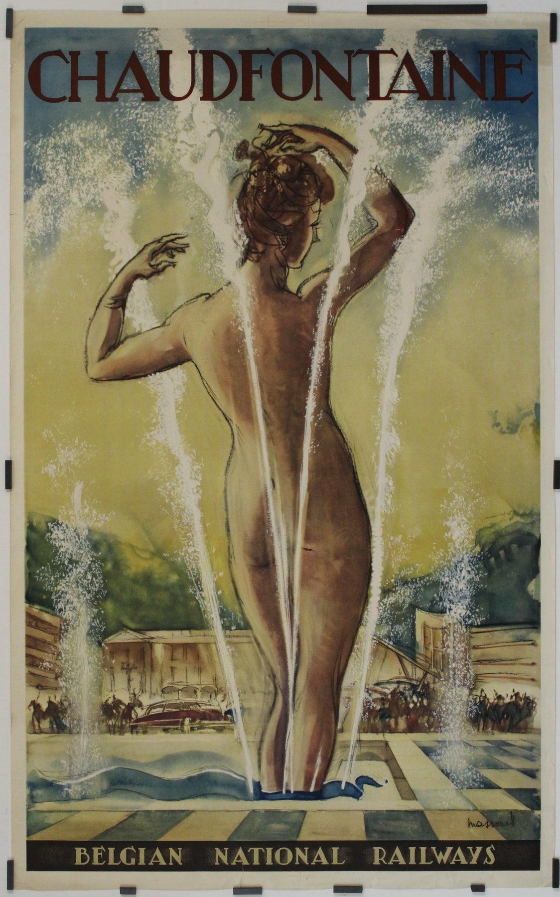 Prix régulier €1.000,00L'affiche originale de 1948, signée Armand Massonet et intitulée « Chaudfontaine », a été créée pour la SNCB (Chemins de fer nationaux belges). Cette affiche est un exemple remarquable de la publicité touristique européenne de l'après-guerre, reflétant l'optimisme et le renouveau du tourisme en Belgique après la Seconde Guerre mondiale. Elle s'inscrivait dans une campagne plus large visant à promouvoir le tourisme intérieur et à mettre en valeur la beauté des paysages et des villes historiques de la Belgique auprès des touristes belges et étrangers.