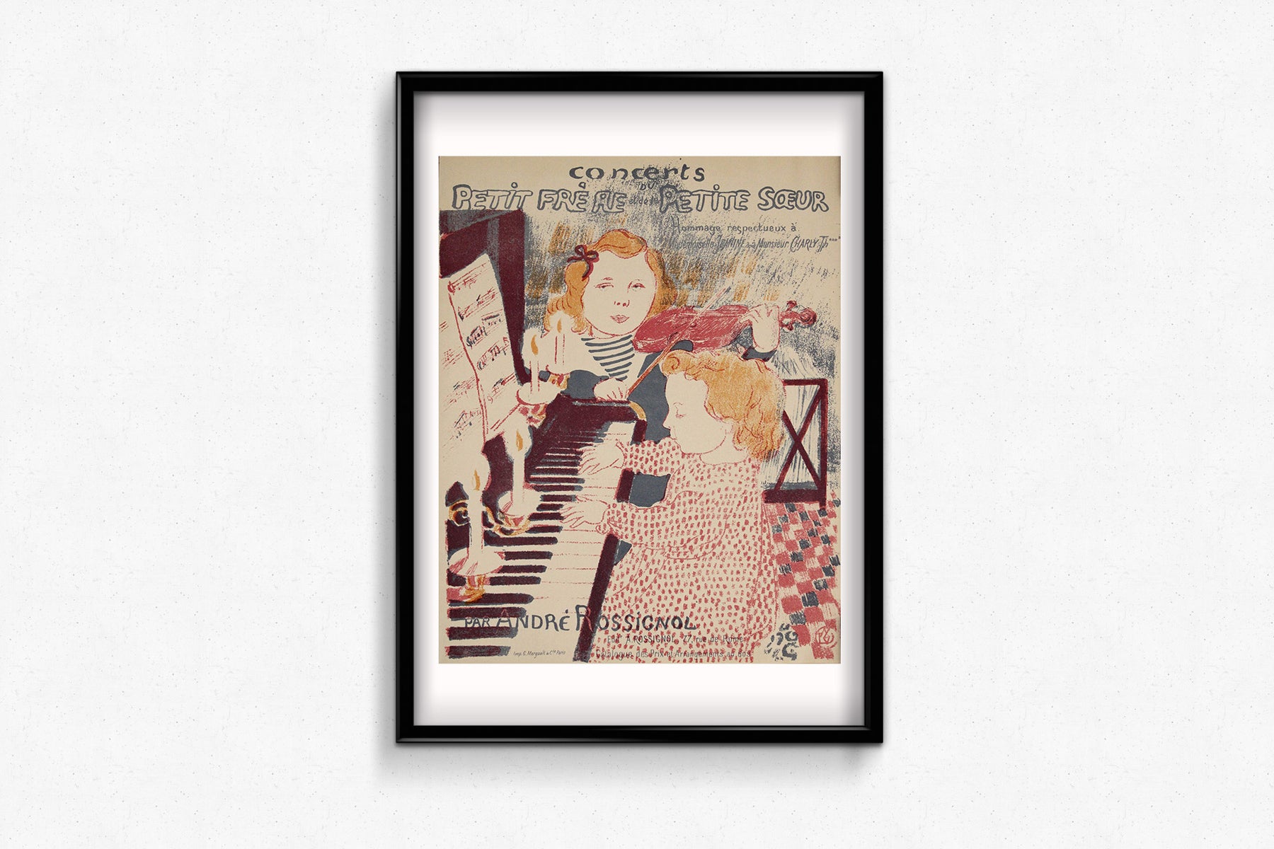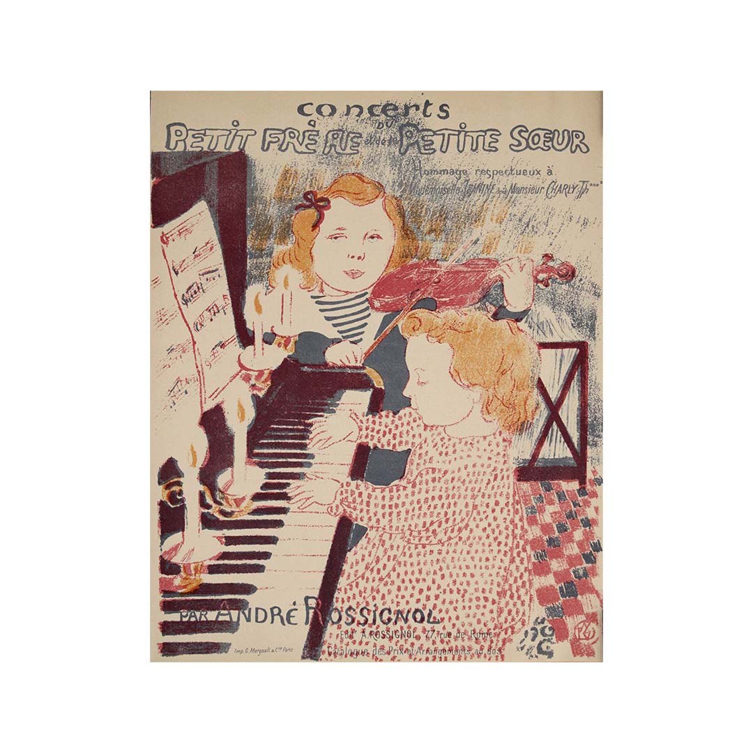 La partition illustrée de Maurice Denis, datant d'environ 1900 et intitulée « Concerts du Petit Frère et de la Petite Sœur » , est une délicieuse synthèse entre art et musique. Cette œuvre présente une illustration de couverture signée Maurice Denis, figure majeure des mouvements symboliste et nabi. Le travail de Denis est réputé pour sa dimension lyrique et décorative, et cette partition illustre parfaitement son talent à fusionner art visuel et poésie.