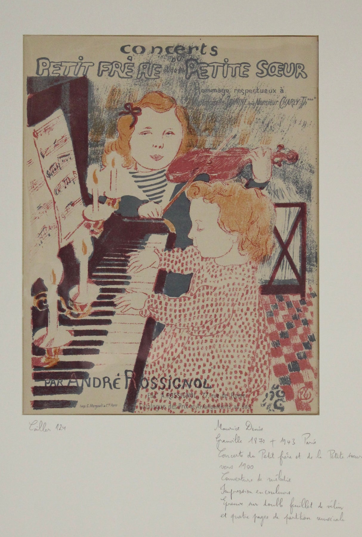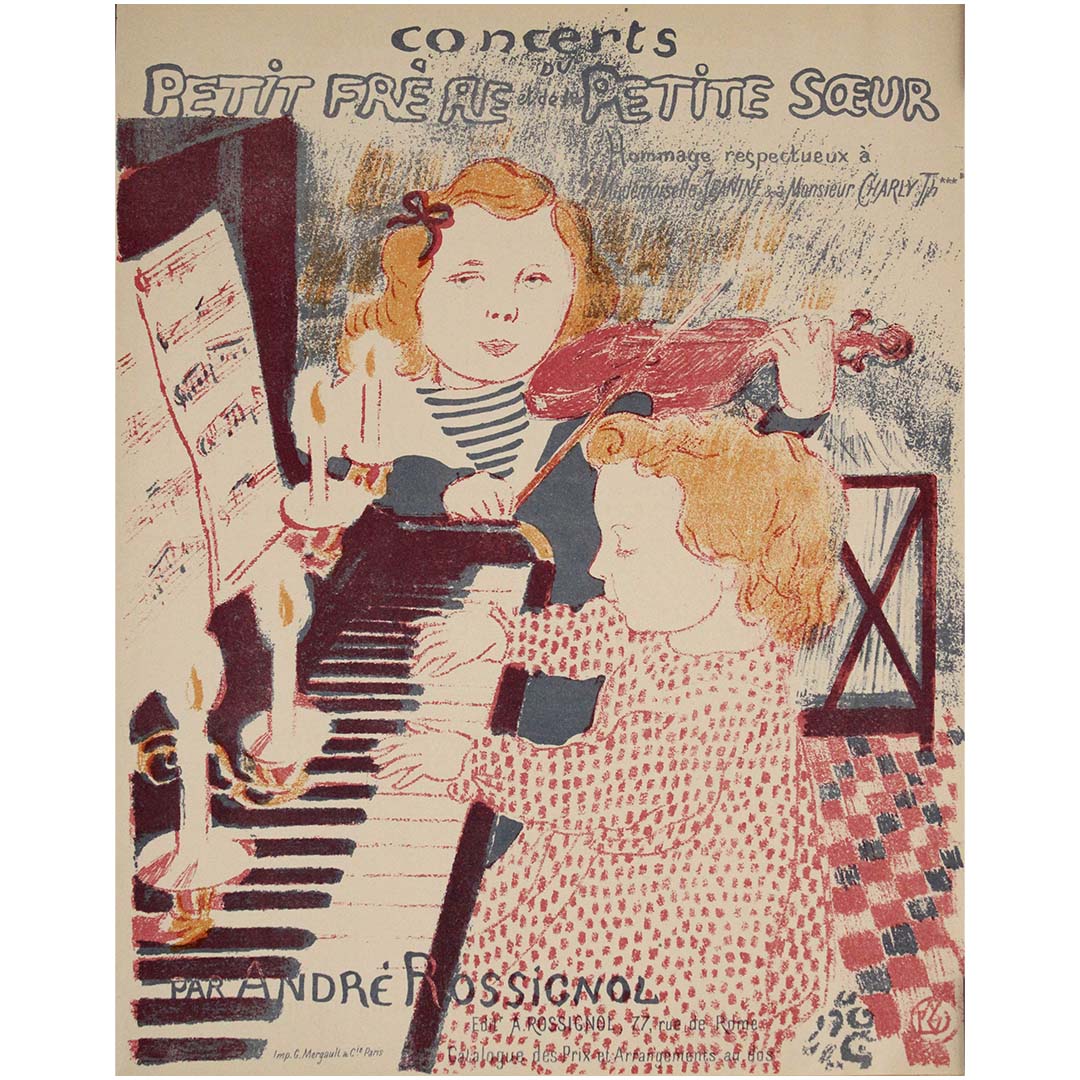 La partition se compose d'une double feuille de vélin à la couverture magnifiquement illustrée, accompagnée de quatre pages de notation musicale. L'illustration de la couverture, signée Maurice Denis, reflète son style caractéristique : des lignes douces et des compositions harmonieuses qui évoquent une impression d'intimité et de chaleur familiale. Son approche puisait souvent dans les thèmes de l'enfance, de la vie domestique et de la spiritualité, en parfaite adéquation avec le sujet délicat des Concerts du Petit Frère et de la Petite Sœur .