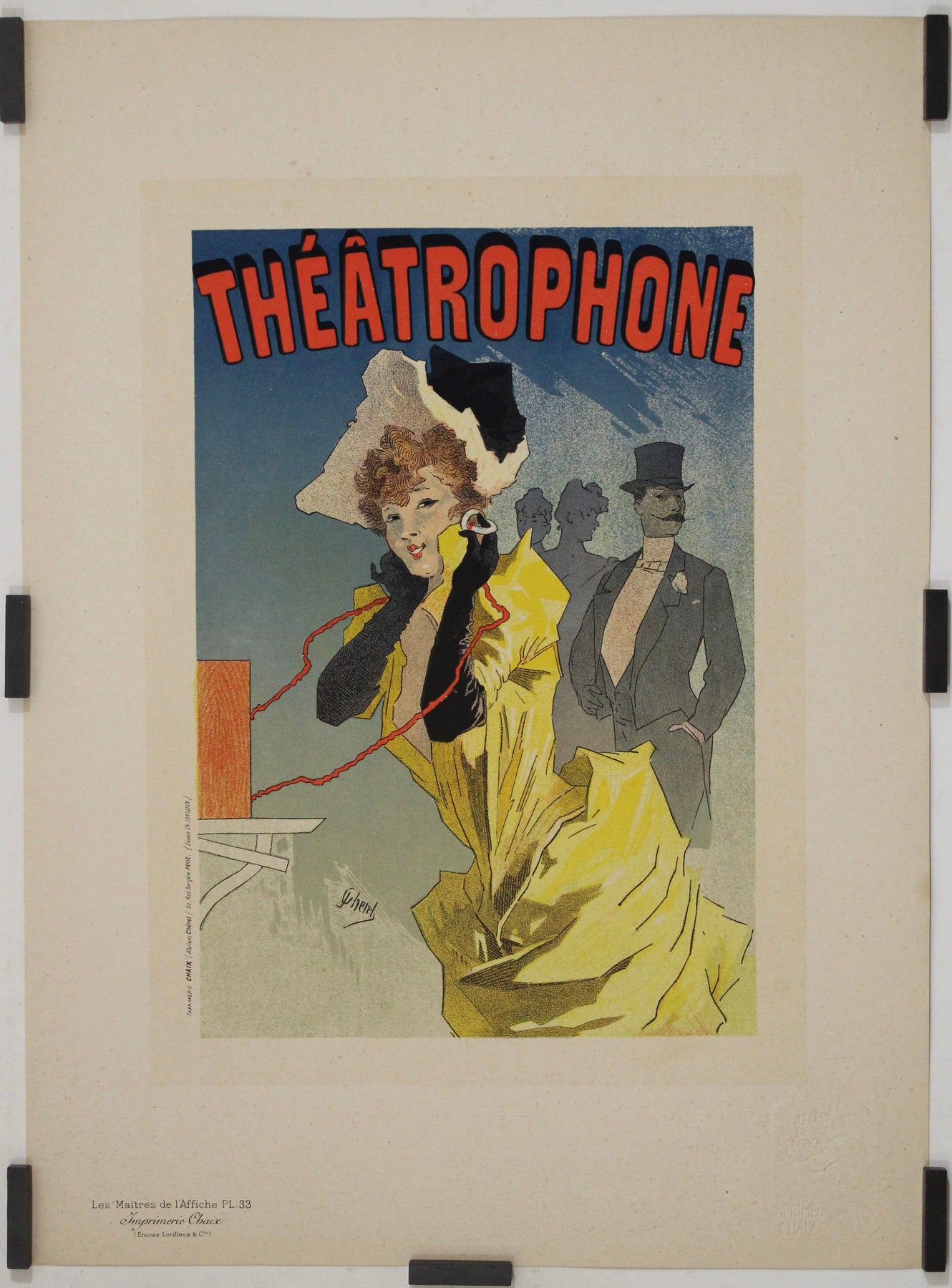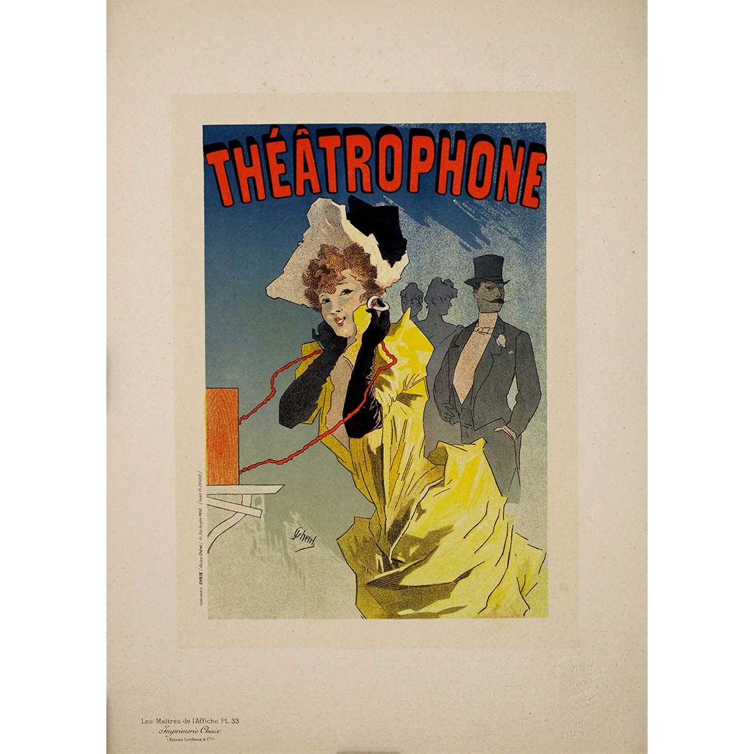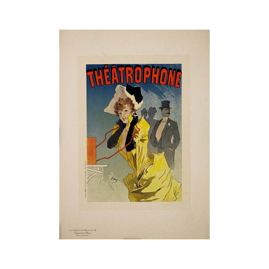 Avec élégance, fantaisie et un esprit parisien vibrant, la lithographie Théâtrophone de Jules Chéret est un joyau de la célèbre série Les Maîtres de l'Affiche , publiée en 1896. Souvent considéré comme le « père de l'affiche moderne », Chéret fusionne merveille technologique et flair artistique dans cette publicité pour l'une des inventions les plus enchanteresses du XIXe siècle : le théâtrophone.